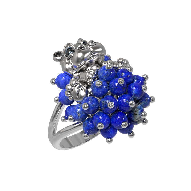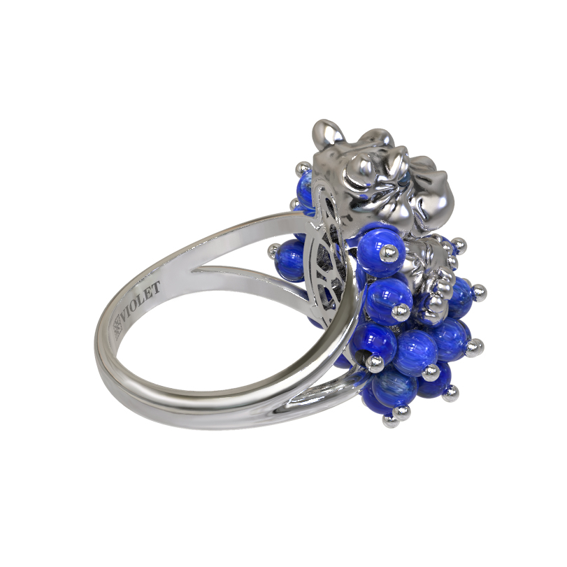 Ювелирная композиция украшена 26 вставками из натурального лазурита. Глубокий синий цвет камней подчеркивает холодный блеск белого золота, а их форма в виде аккуратных бусин придает объем и динамику. Детали фигурки дополнены изящным покрытием эмалью, что добавляет изделию выразительности. Разноцветный акцент вставок делает украшение универсальным дополнением к разнообразным стилям одежды.