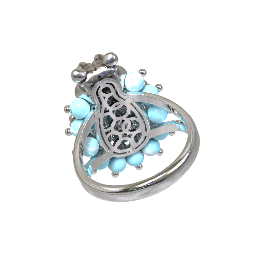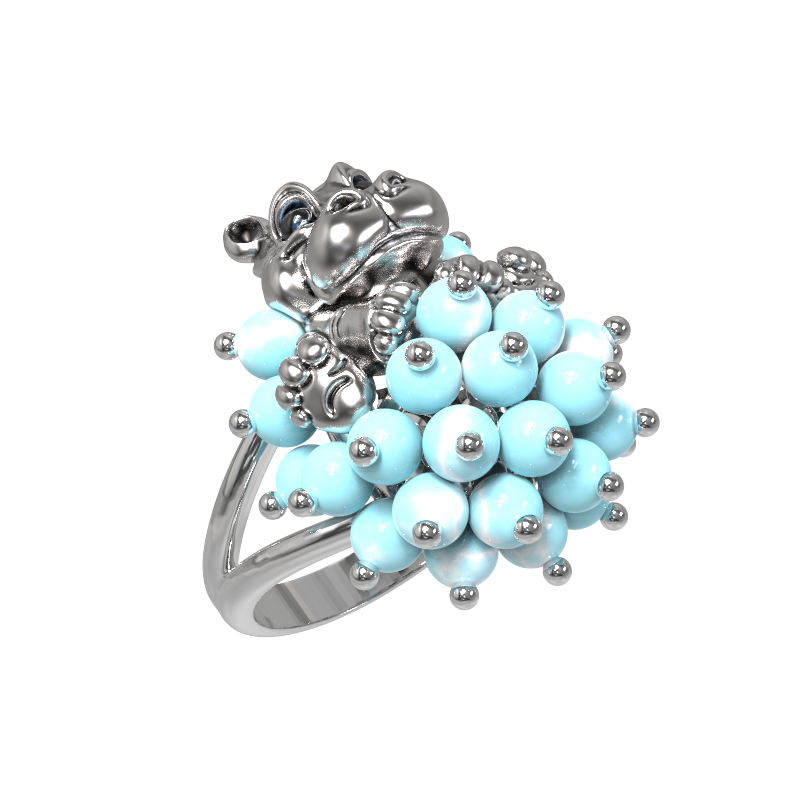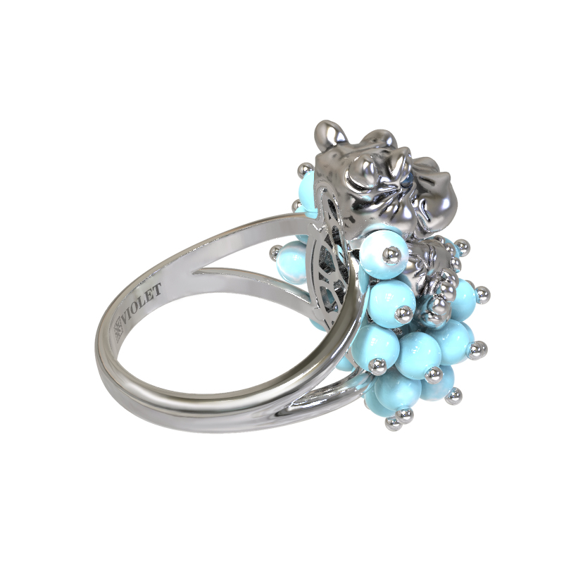 Ювелирное украшение инкрустировано 26 вставками бирюзы круглой формы в виде бусин, которые обладают нежным бирюзовым цветом, эффектно контрастирующим с холодным блеском белого золота. Детали композиции дополнены разноцветной эмалью, что придает изделию глубину и художественную завершенность. Это эффектное кольцо подойдет как для женщин, так и для мужчин, которые ценят смелые дизайнерские решения и высокое качество исполнения. Украшение представлено в широкой размерной линейке: от 15 до 23 размера.