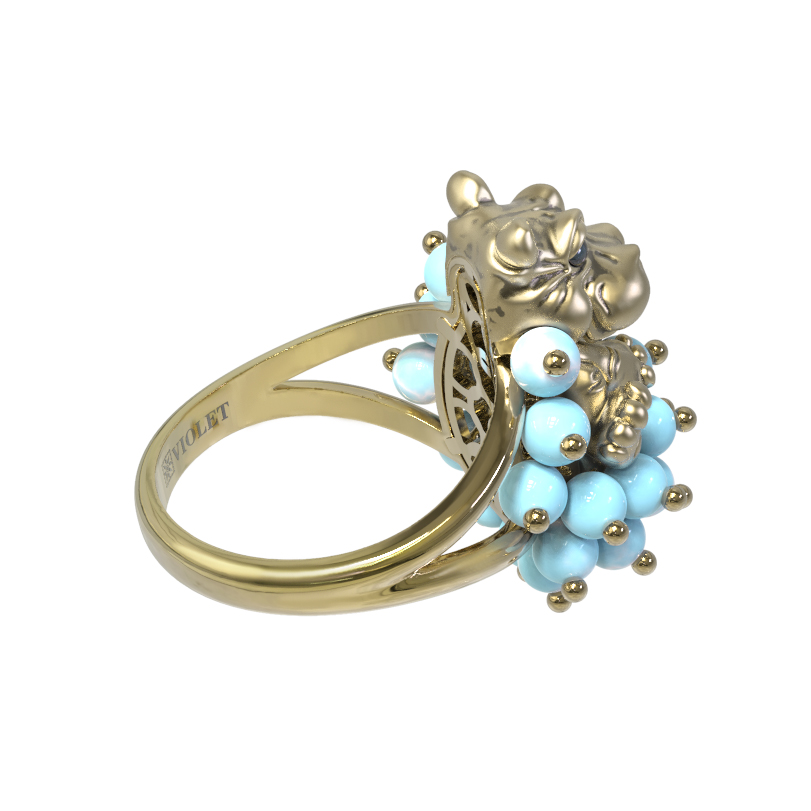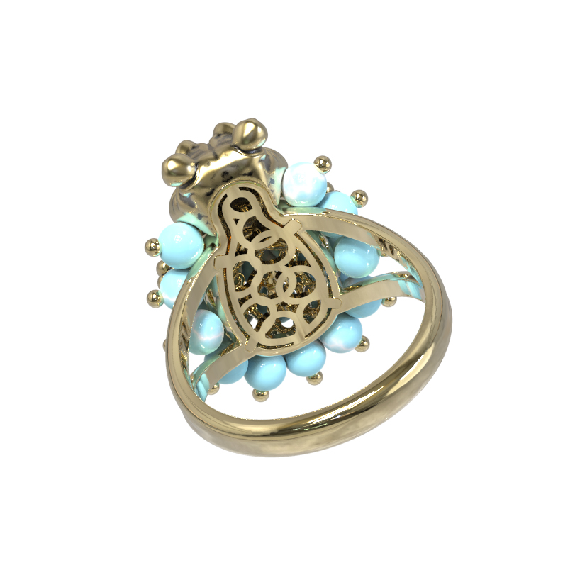 Композиция украшена 26 вставками в форме бусин, среди которых доминирует бирюза бирюзового цвета, дополненная элементами из эмали, создающей разноцветные акценты. Такое сочетание материалов придает украшению объем и динамику. Кольцо выглядит эффектно и необычно, оно одинаково гармонично дополнит стиль как женщин, так и мужчин, ценящих креативные аксессуары с характером.