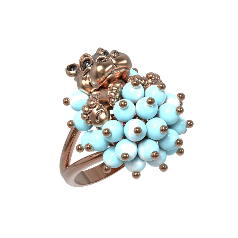 Оригинальное кольцо из красного золота 585 пробы — это смелое ювелирное решение для тех, кто ценит эксклюзивный дизайн и яркие акценты. Модель входит в коллекцию De luxe Premium — Бегемотик и привлекает внимание необычным исполнением в анималистическом стиле. Центральным элементом композиции является искусная фигурка бегемотика, выполненная из красного золота с элементами эмали. Этот декоративный образ дополнен россыпью из 26 вставок бирюзы в форме бусин, создающих эффектный объем и приятный контраст с благородным металлом.