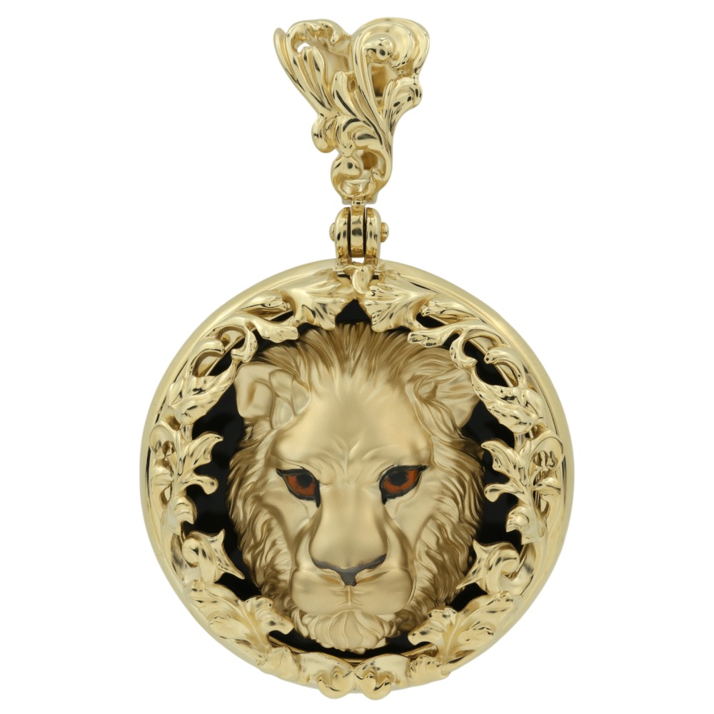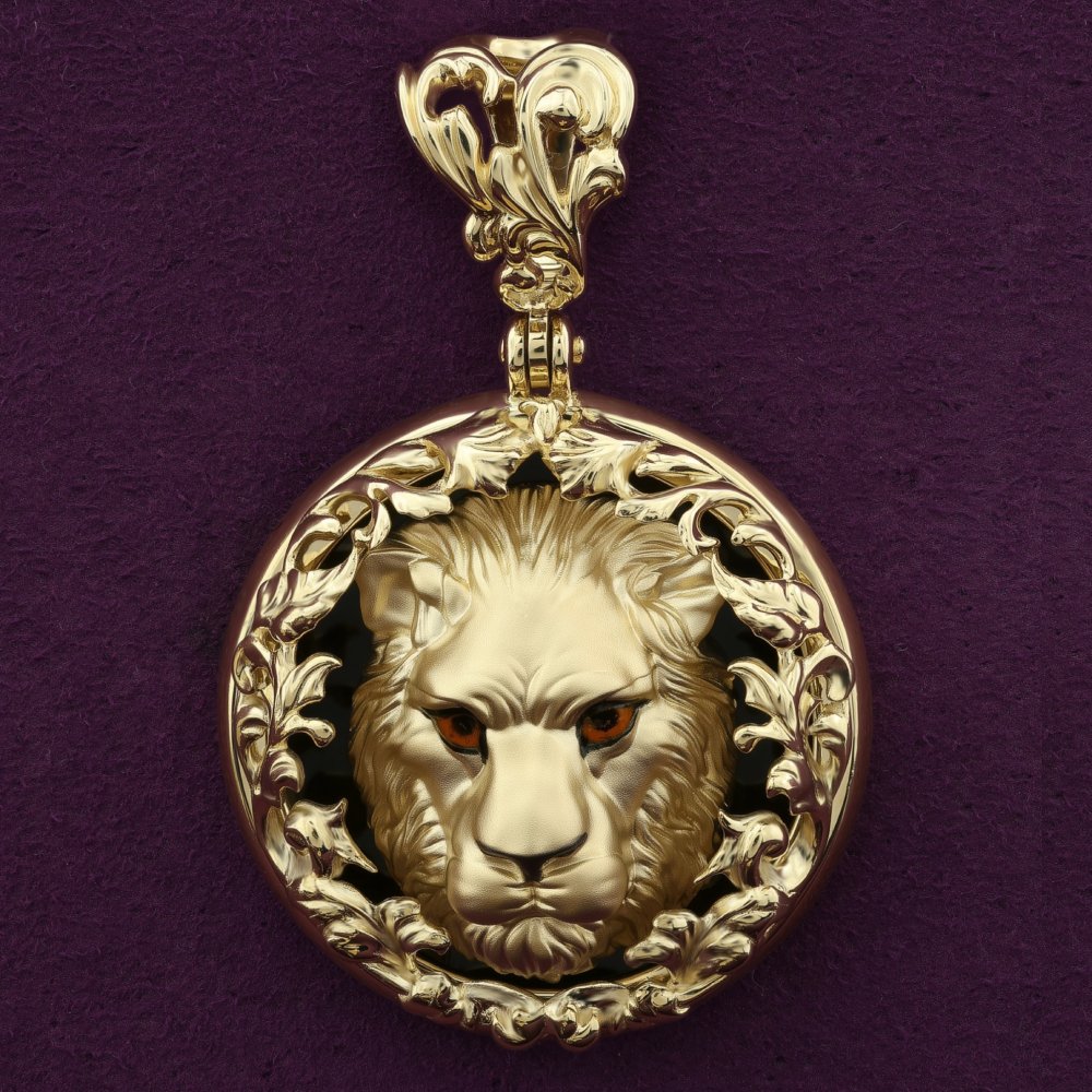 Основой для композиции служит круглый черный оникс, на фоне которого золотой лев выглядит особенно выразительно и контрастно. Яркие акценты в виде цветной эмали придают изделию дополнительную глубину и художественную завершенность. Использование лимонного золота в сочетании с ониксом и эмалью создает дорогой и современный образ, подходящий для делового или вечернего стиля.