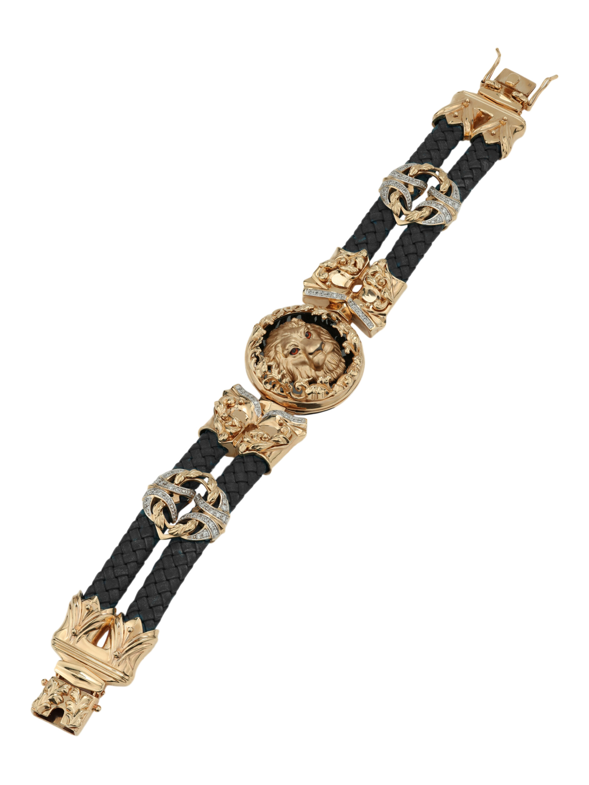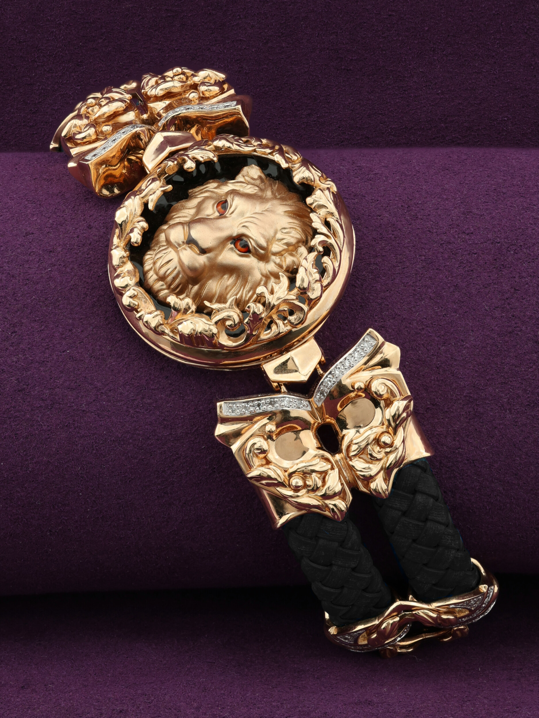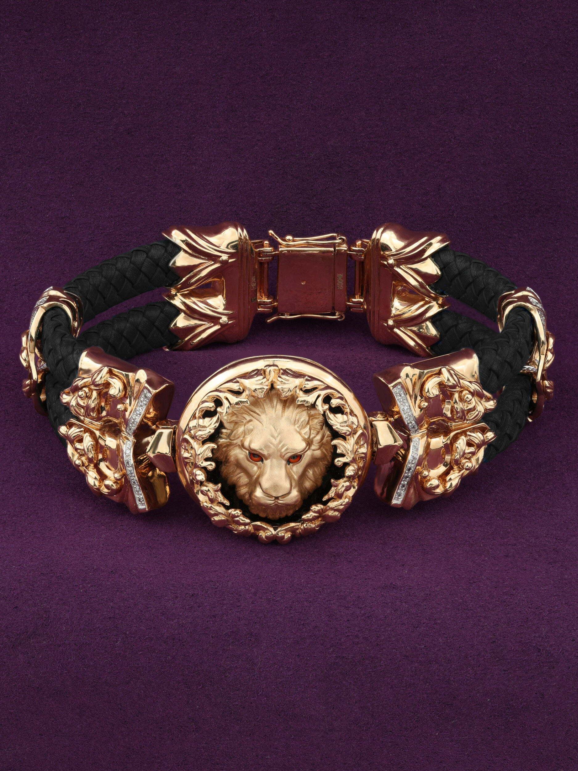 Статусный мужской браслет из коллекции De luxe Premium — Львы создан для тех, кто ценит роскошь в каждой детали. Это массивное ювелирное украшение выполнено из красного золота 585 пробы и отличается сложным, детализированным дизайном, центральным элементом которого является скульптурное изображение льва. Величественный хищник обрамлен вставками из черного оникса, подчеркивающими мощь и благородство образа. Ярким акцентом изделия выступает разноцветная эмаль, добавляющая глубину композиции, а 729 инкрустированных бриллиантов белого цвета создают завораживающее сияние, превращая аксессуар в произведение ювелирного искусства.