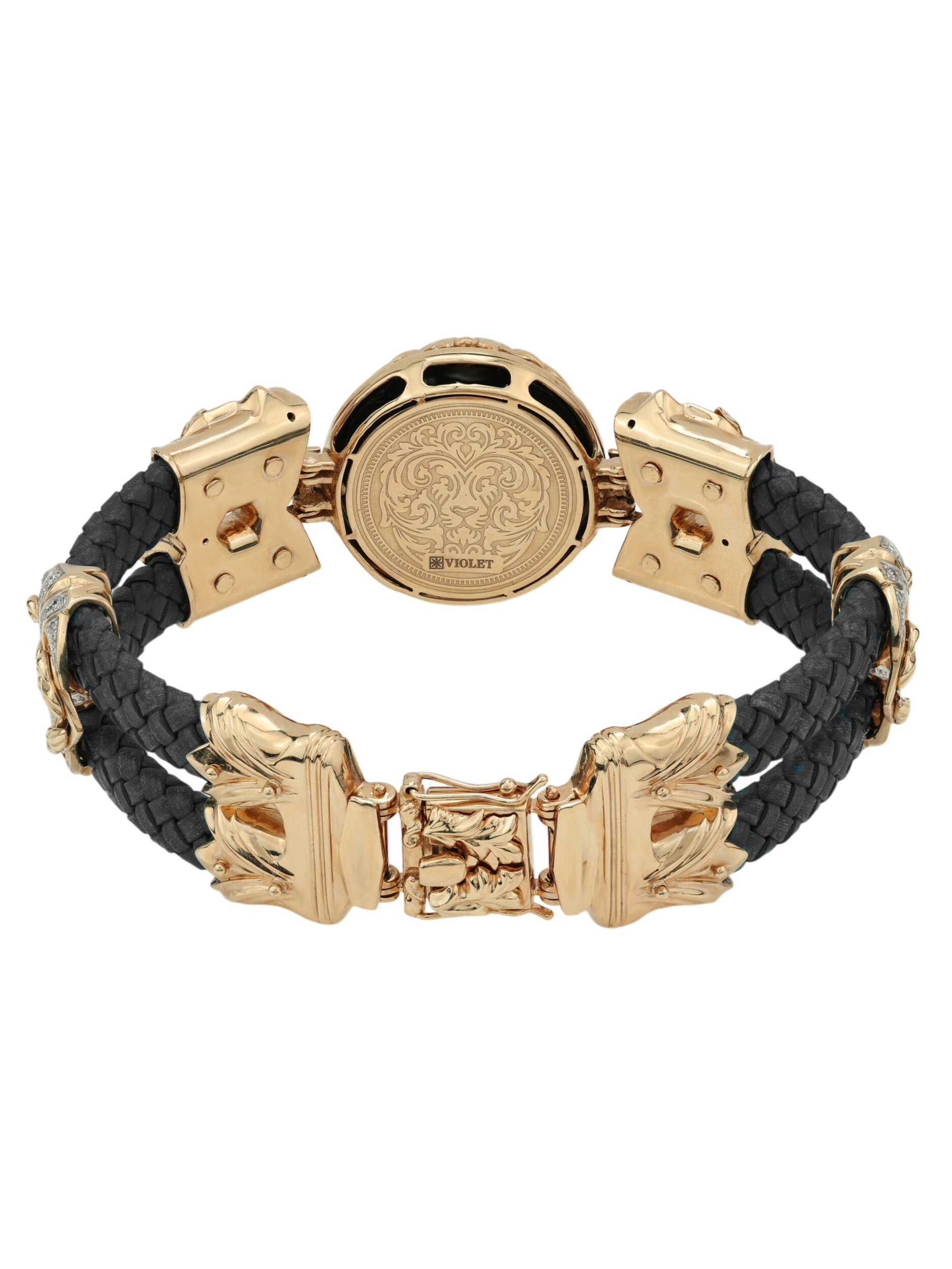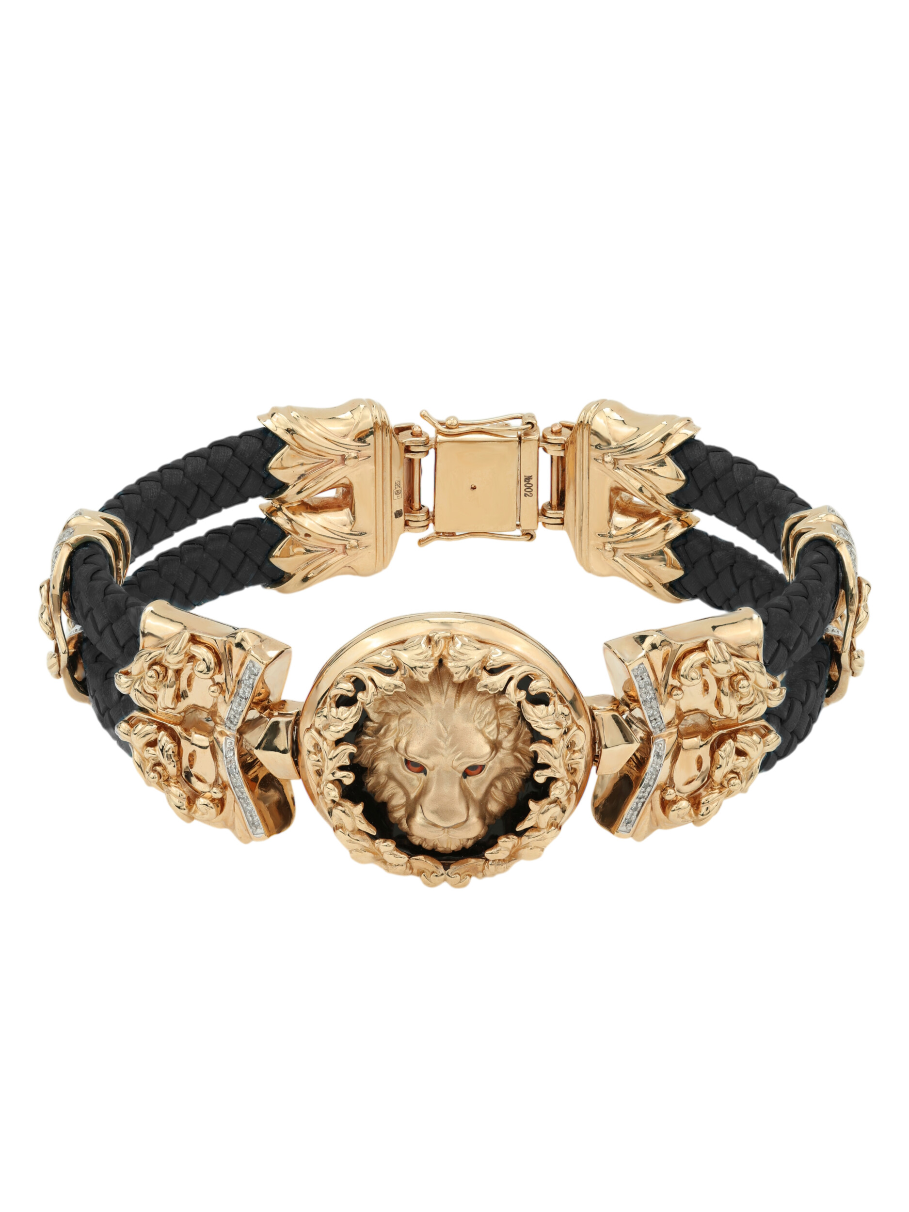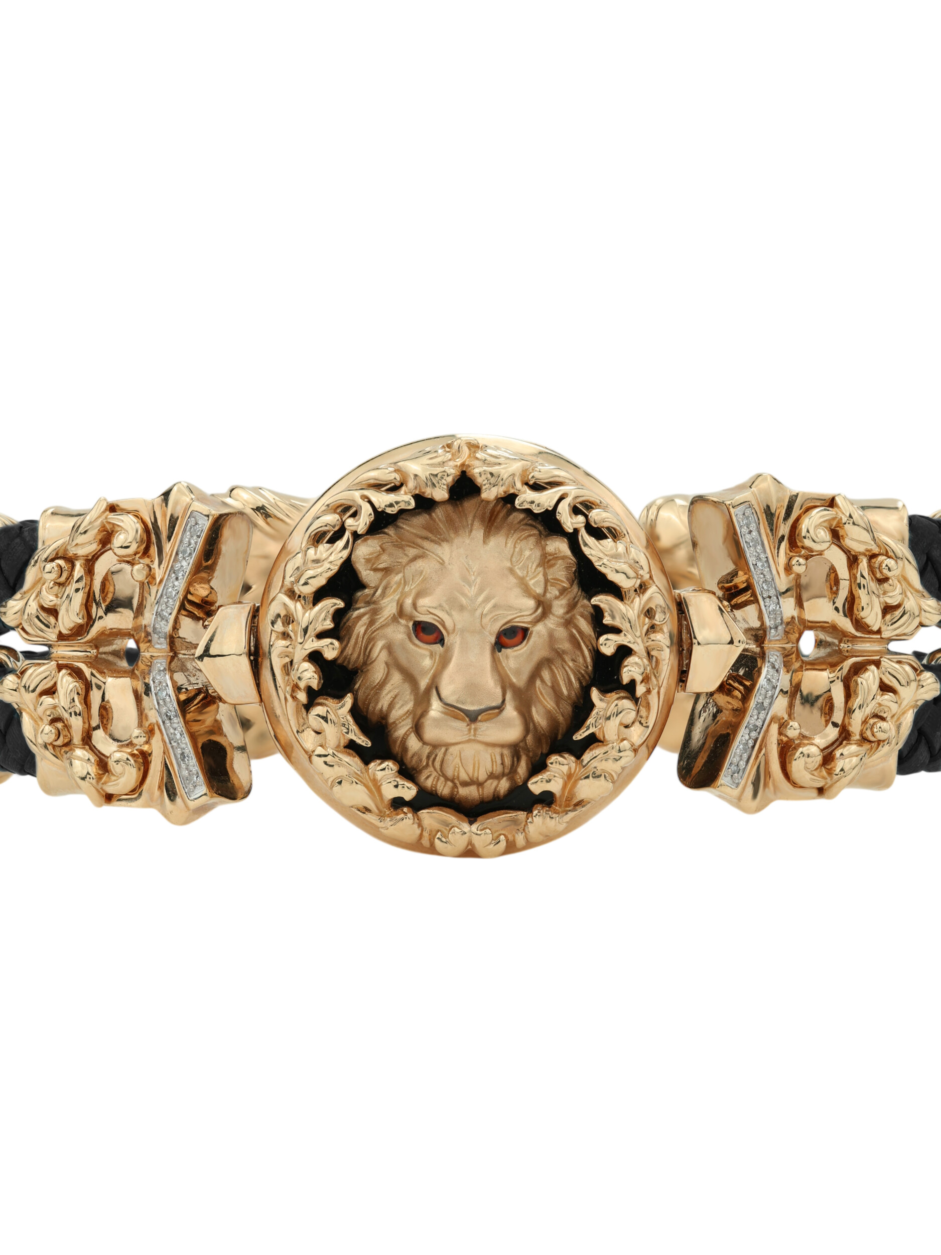 Статусный мужской браслет из коллекции De luxe Premium — Львы создан для тех, кто ценит роскошь в каждой детали. Это массивное ювелирное украшение выполнено из красного золота 585 пробы и отличается сложным, детализированным дизайном, центральным элементом которого является скульптурное изображение льва. Величественный хищник обрамлен вставками из черного оникса, подчеркивающими мощь и благородство образа. Ярким акцентом изделия выступает разноцветная эмаль, добавляющая глубину композиции, а 729 инкрустированных бриллиантов белого цвета создают завораживающее сияние, превращая аксессуар в произведение ювелирного искусства.