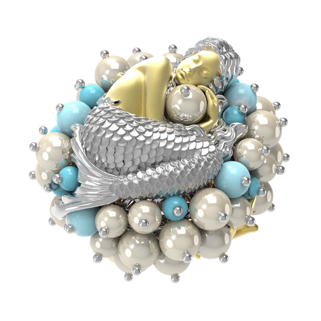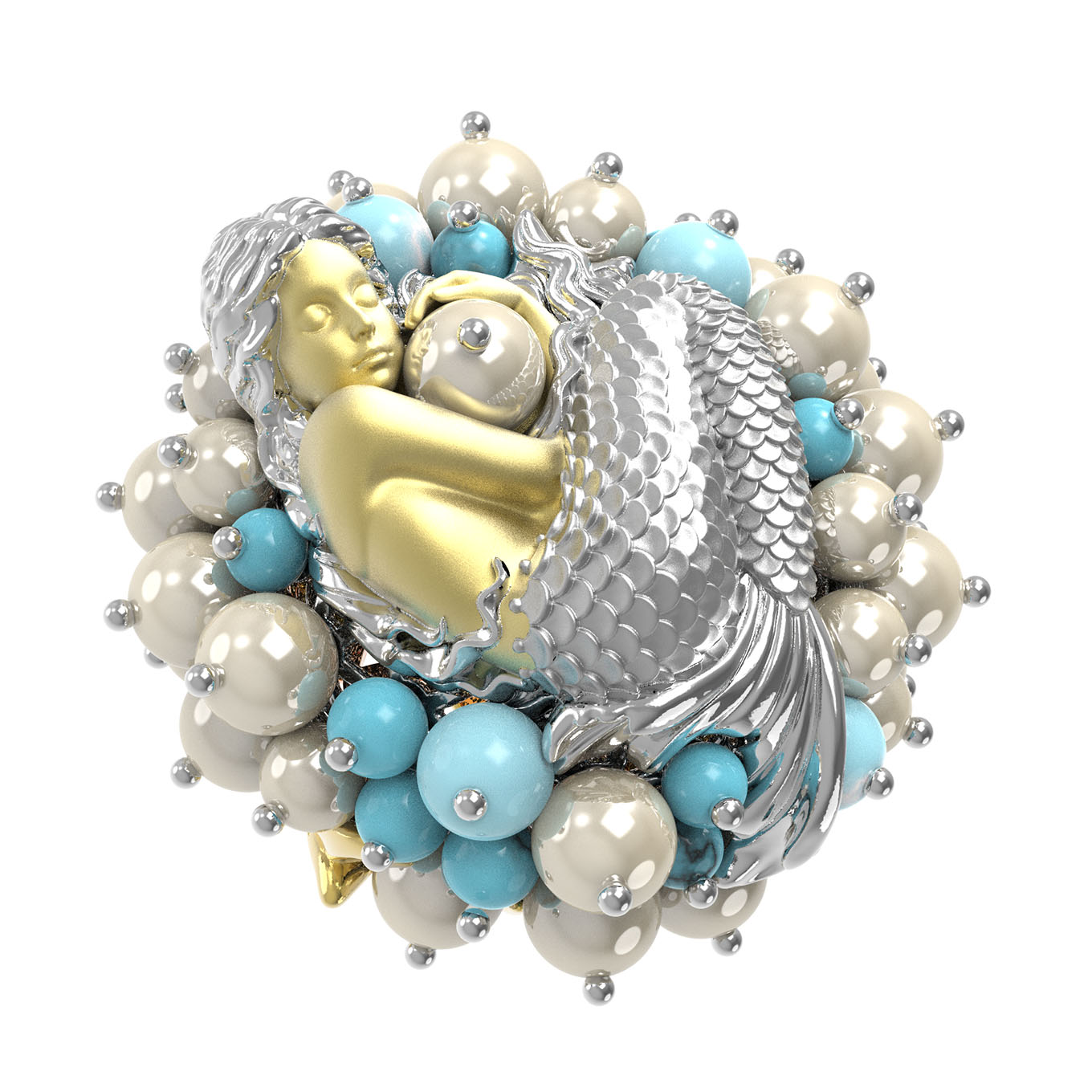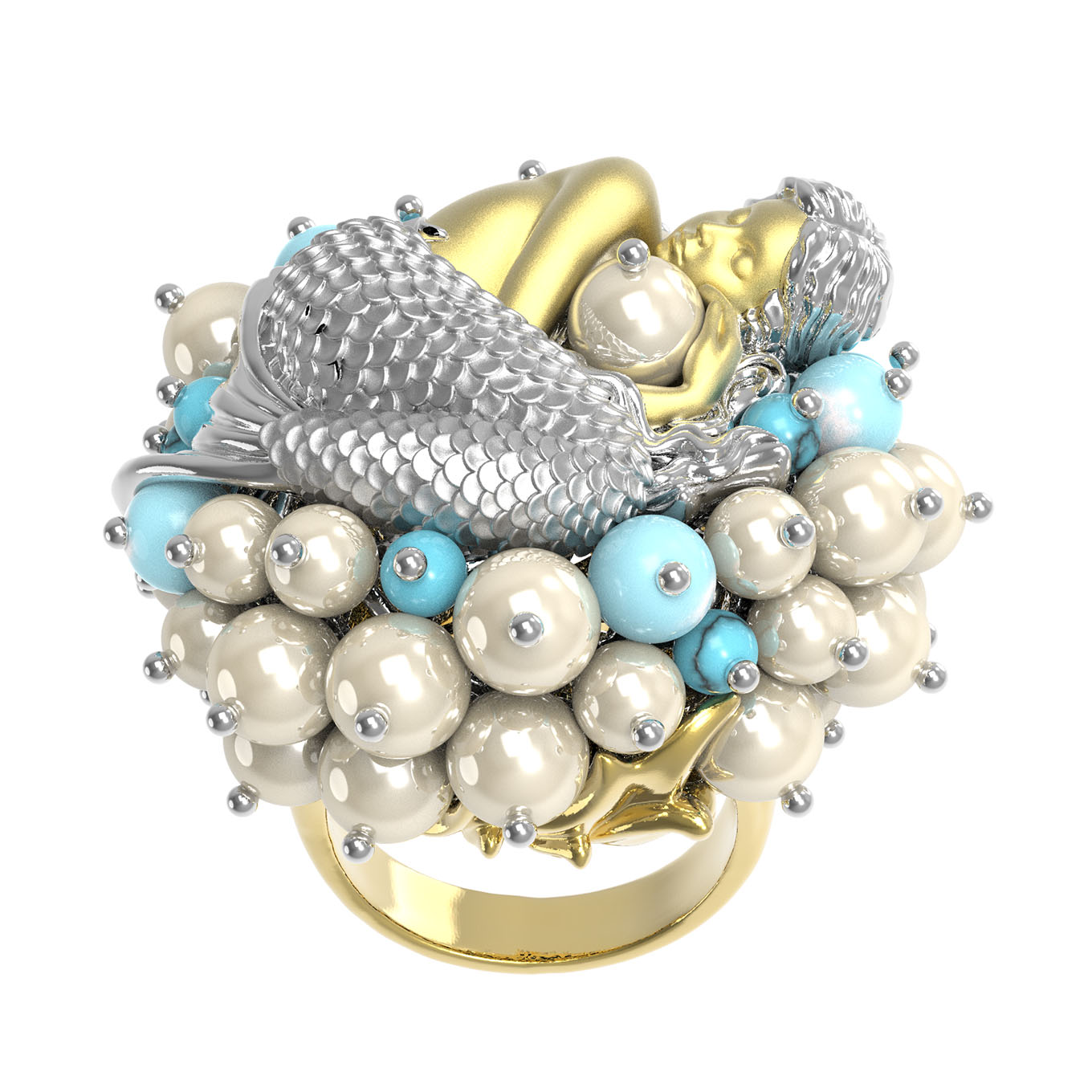 Композиция богато украшена 52 вставками: сочетание белых жемчужин и ярко-бирюзовых камней в форме круга и бусин создает гармоничный контраст с сиянием лимонного золота. Внешний вид изделия напоминает россыпь морских сокровищ, где холодный бирюзовый и нежный белый цвета подчеркивают статус и утонченный вкус владельца. Такое кольцо одинаково хорошо подходит как для женщин, так и для мужчин, которые стремятся подчеркнуть свою индивидуальность необычными украшениями.