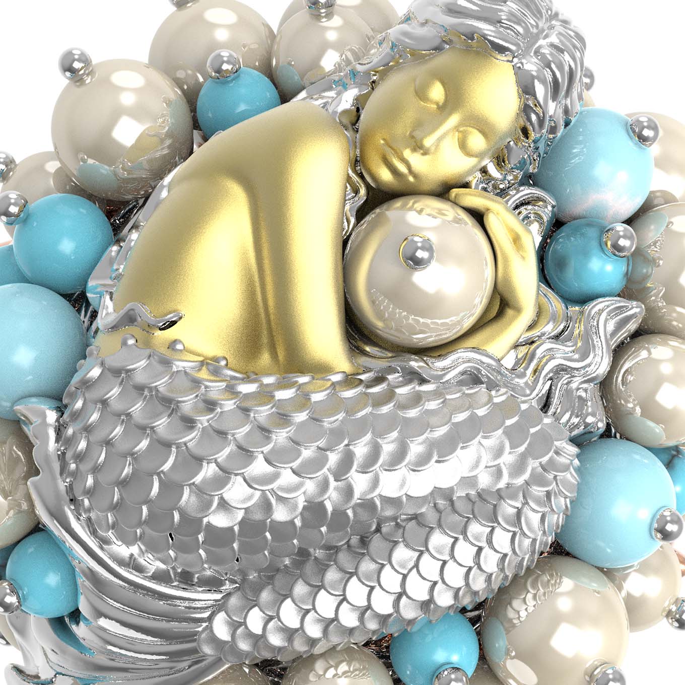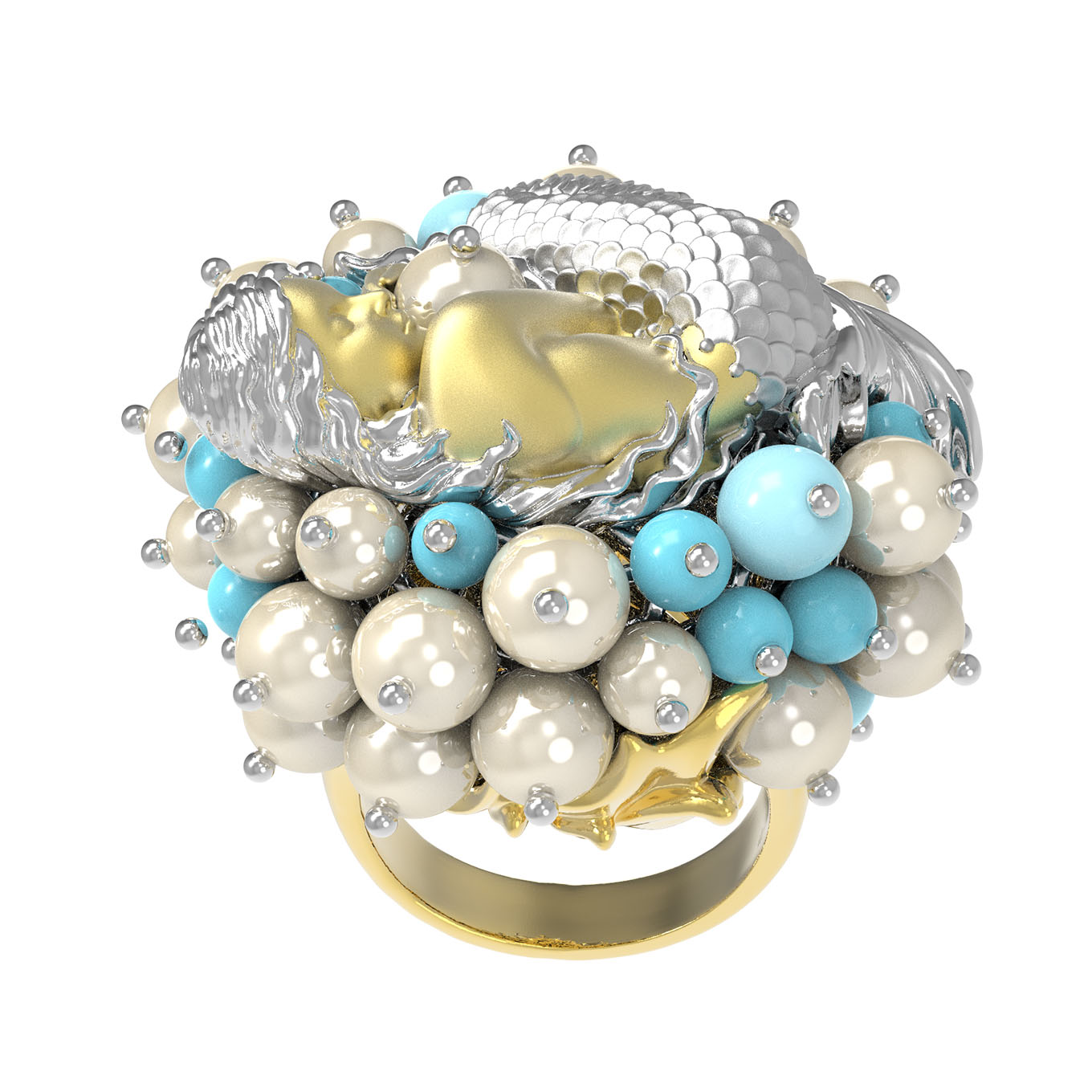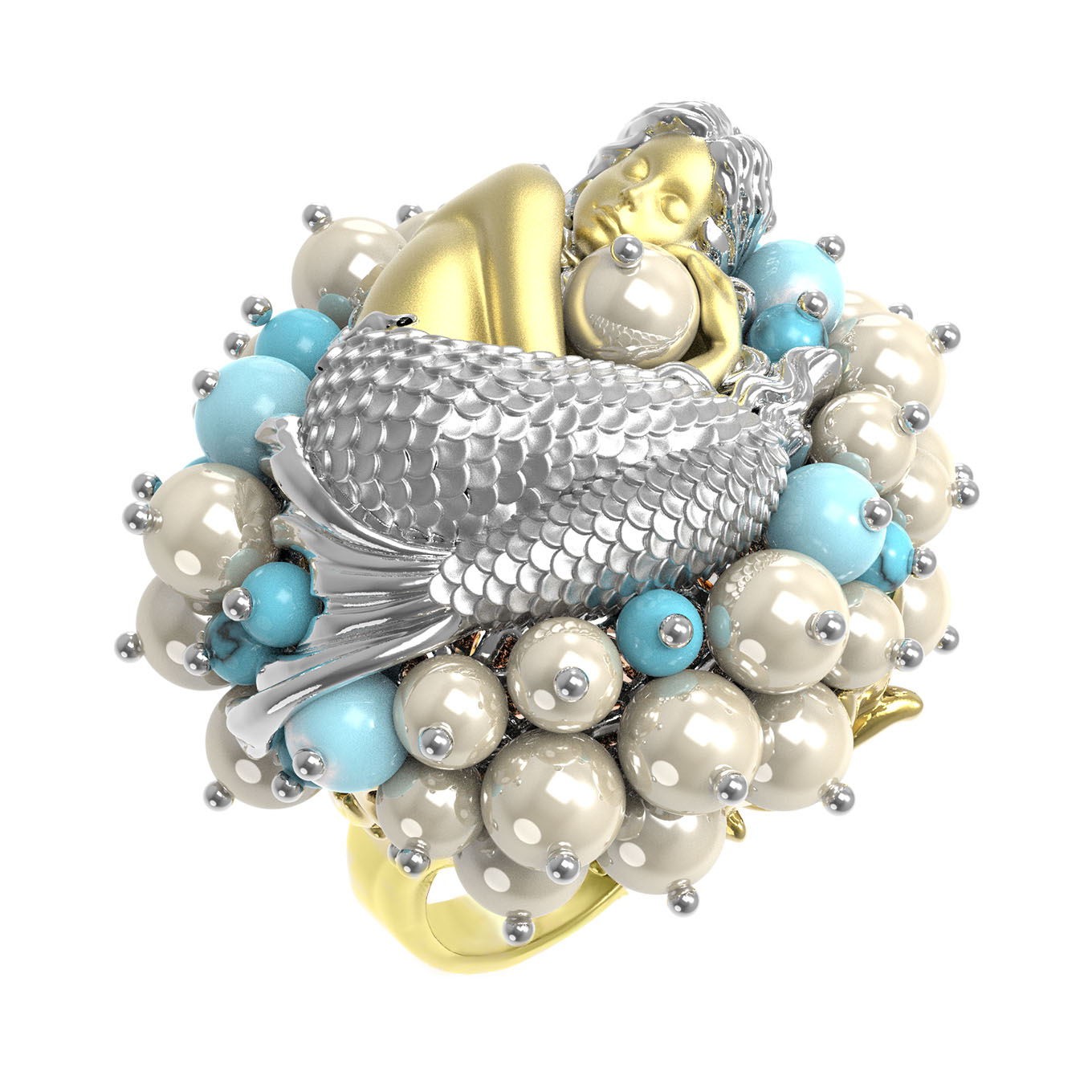 Композиция богато украшена 52 вставками: сочетание белых жемчужин и ярко-бирюзовых камней в форме круга и бусин создает гармоничный контраст с сиянием лимонного золота. Внешний вид изделия напоминает россыпь морских сокровищ, где холодный бирюзовый и нежный белый цвета подчеркивают статус и утонченный вкус владельца. Такое кольцо одинаково хорошо подходит как для женщин, так и для мужчин, которые стремятся подчеркнуть свою индивидуальность необычными украшениями.