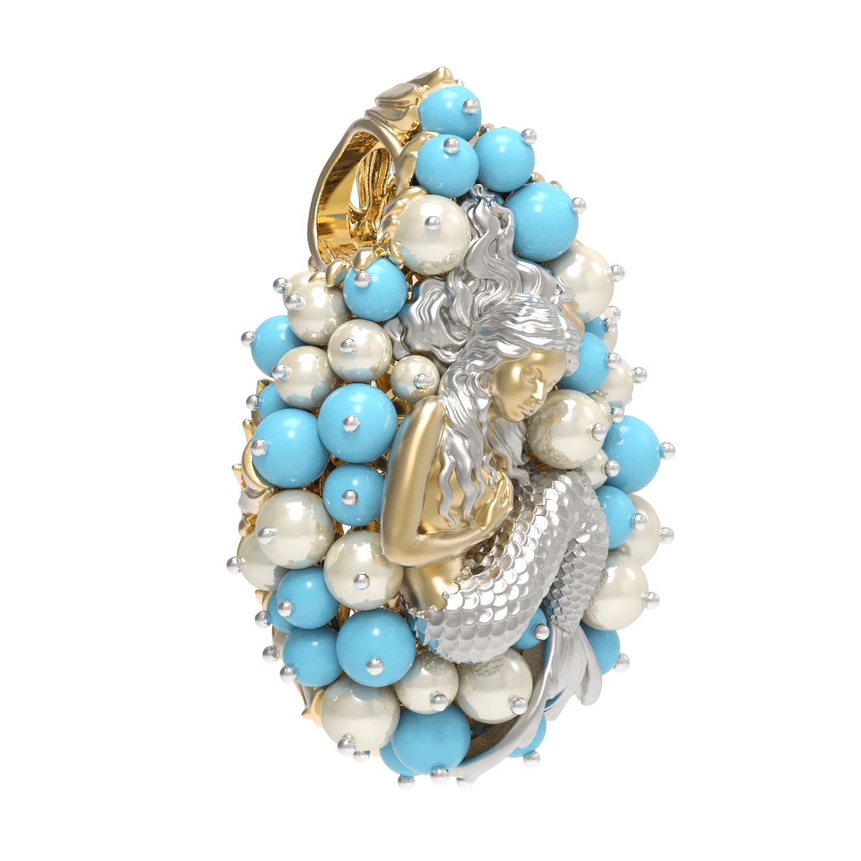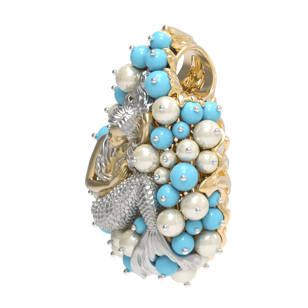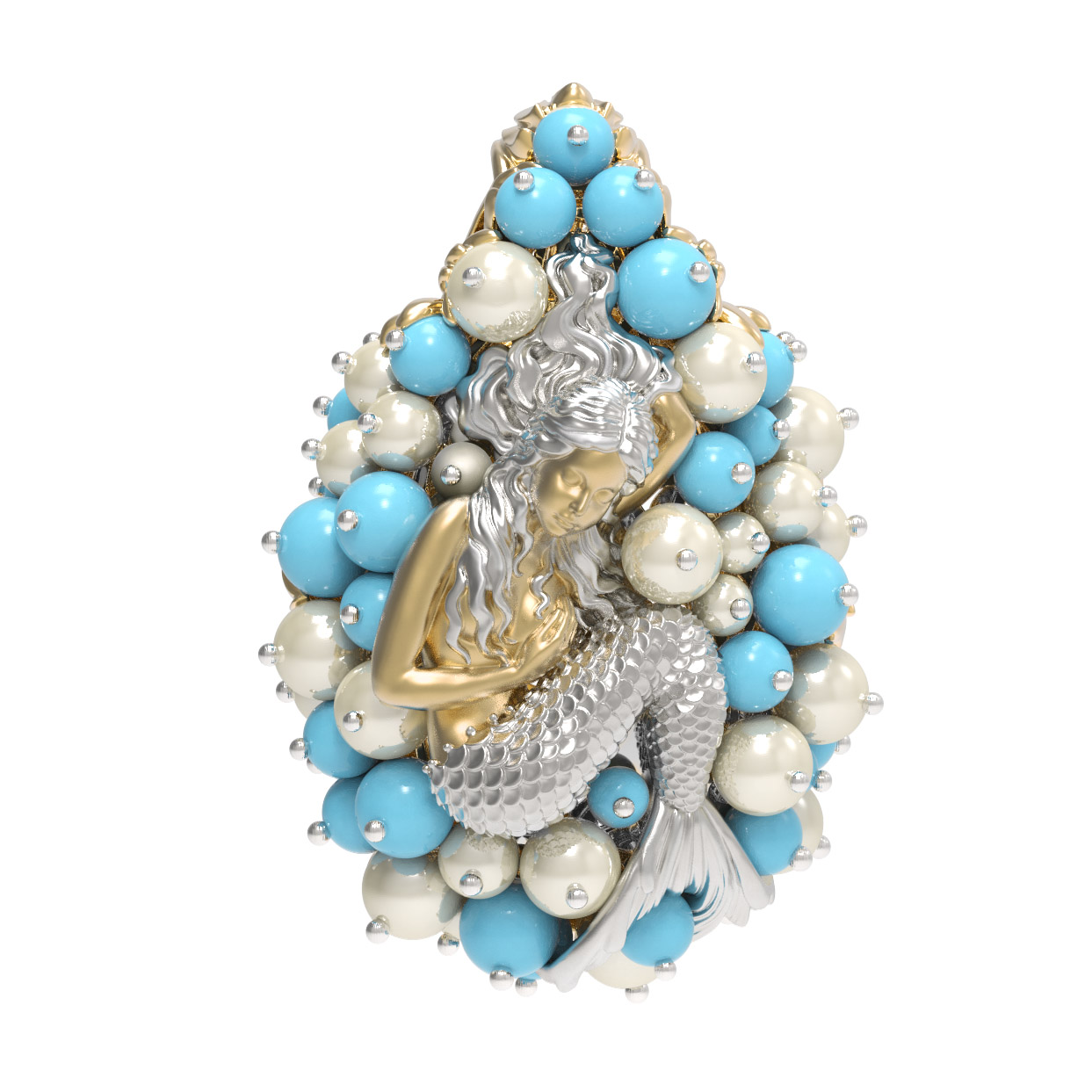 Роскошный дизайн подвески дополняют 56 вставок, среди которых нежный жемчуг белого цвета и яркая бирюза бирюзового оттенка. Камни круглой формы и в виде бусин создают эффект морской пены, окружая центральный элемент и придавая украшению невероятный объем и игру света. Использование качественных материалов и кропотливая проработка деталей делают это изделие жемчужиной любого ювелирного гардероба.