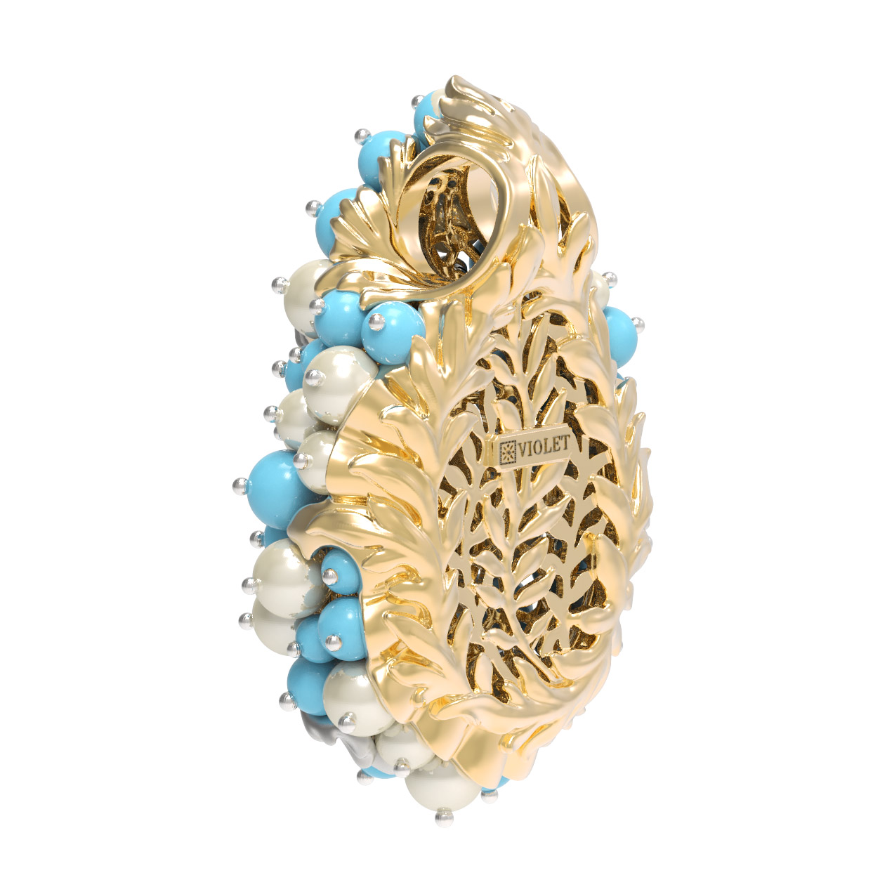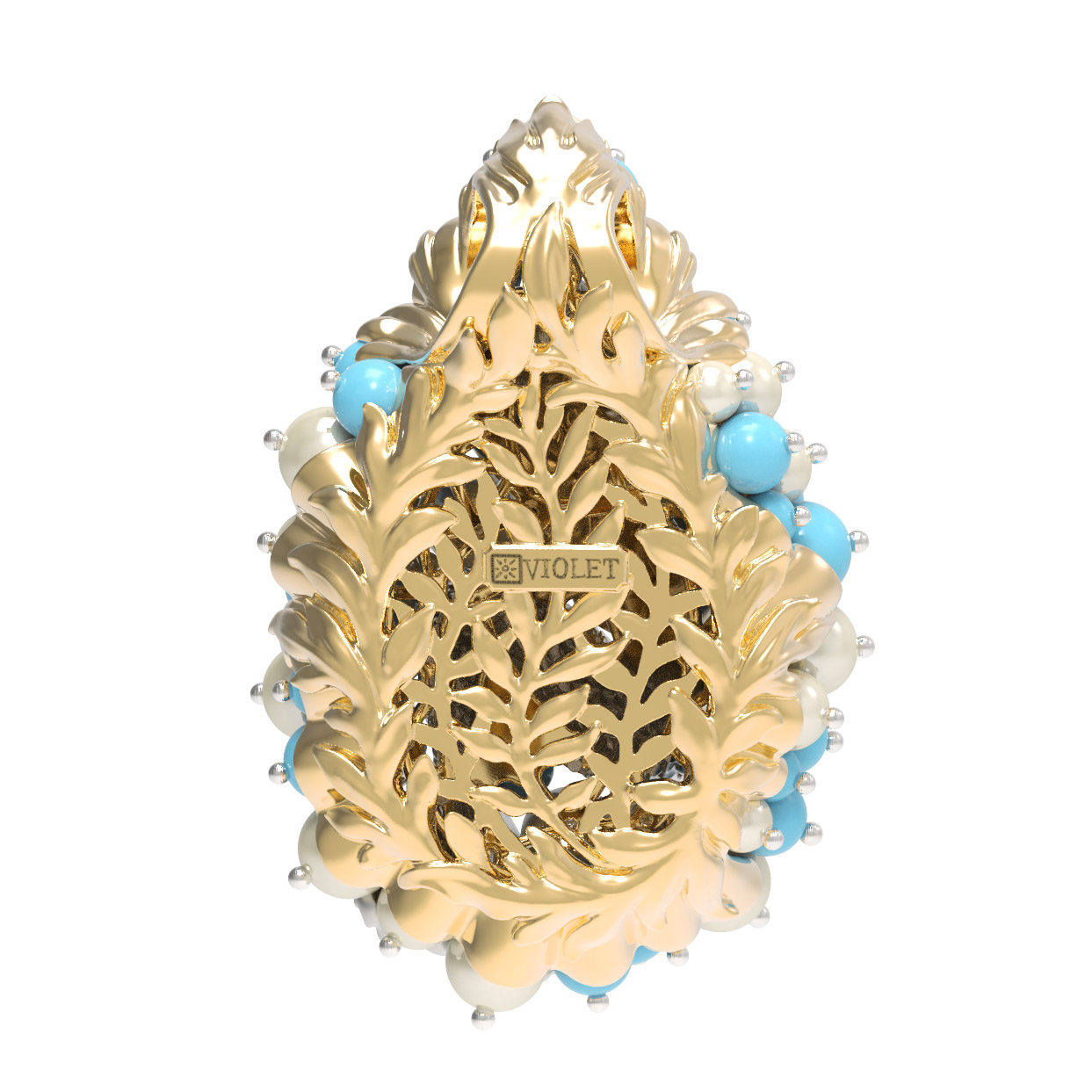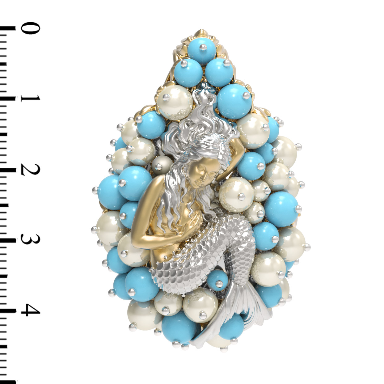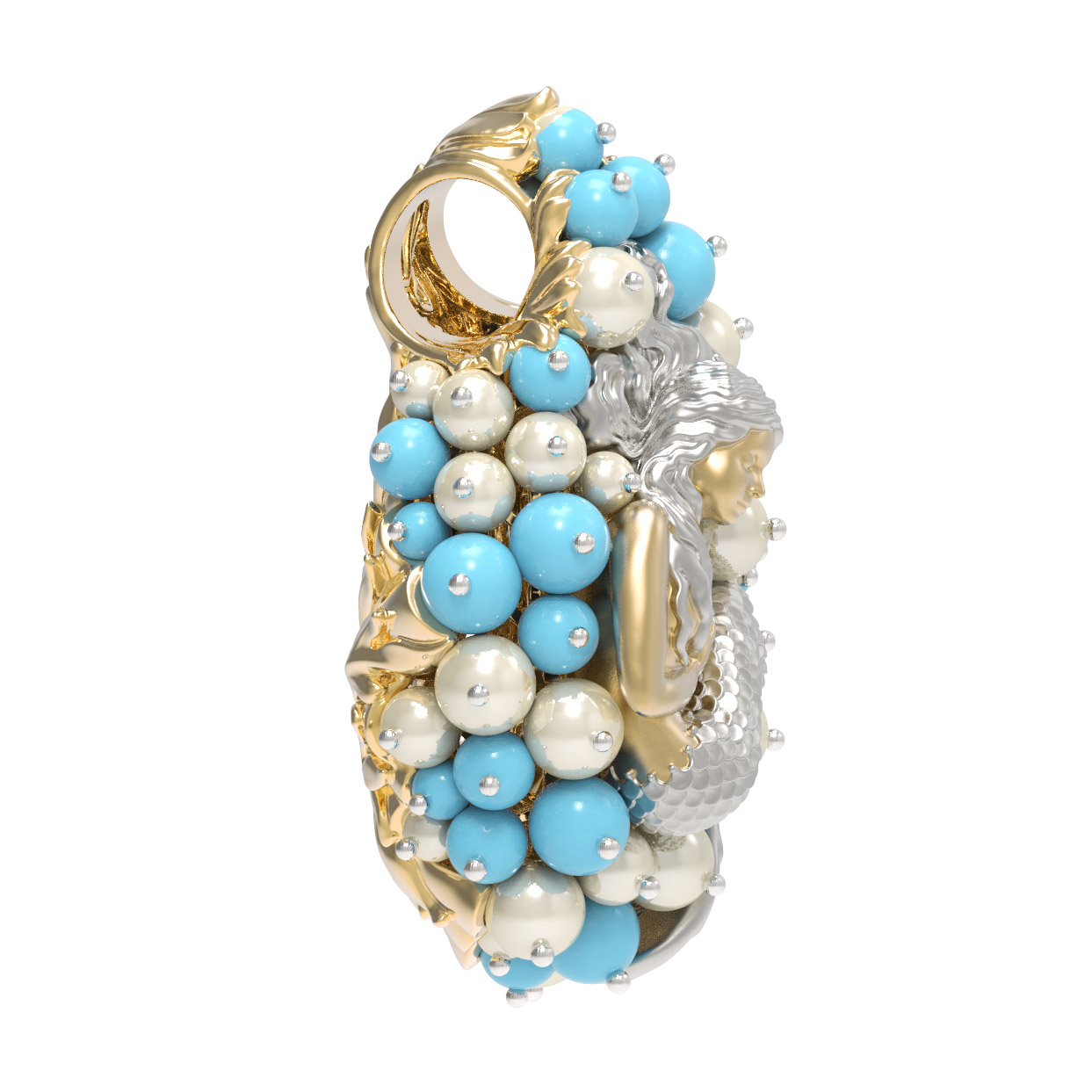 Роскошный дизайн подвески дополняют 56 вставок, среди которых нежный жемчуг белого цвета и яркая бирюза бирюзового оттенка. Камни круглой формы и в виде бусин создают эффект морской пены, окружая центральный элемент и придавая украшению невероятный объем и игру света. Использование качественных материалов и кропотливая проработка деталей делают это изделие жемчужиной любого ювелирного гардероба.