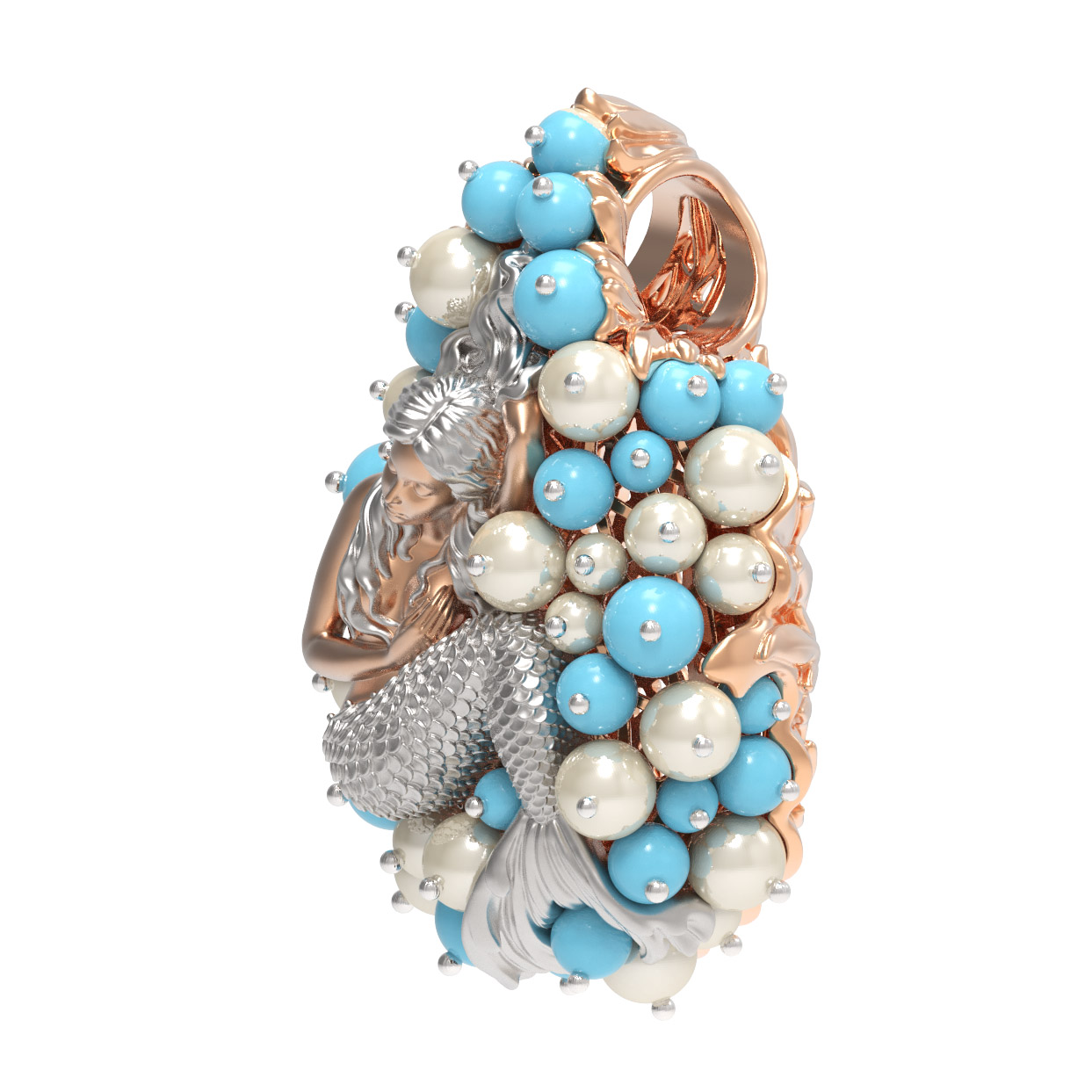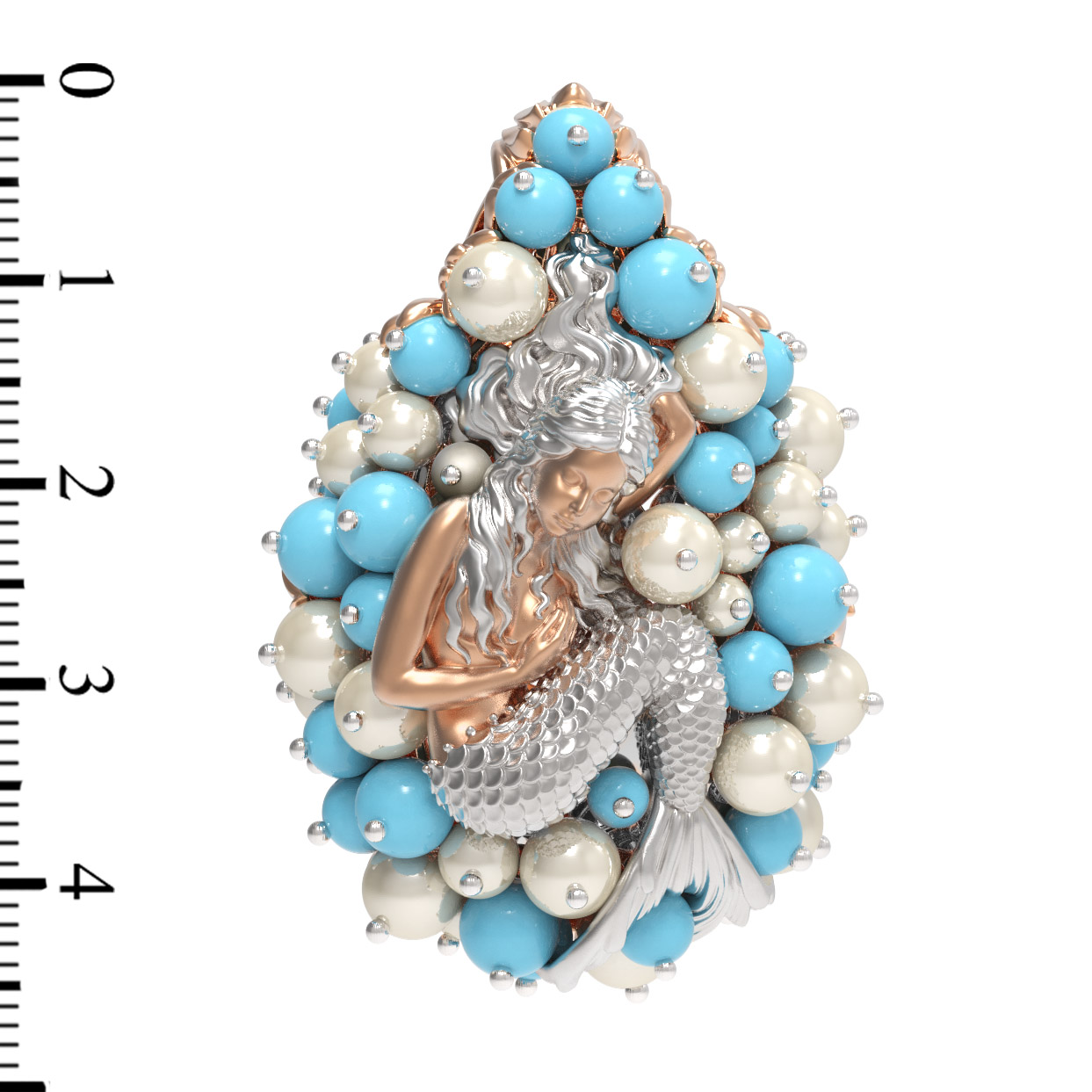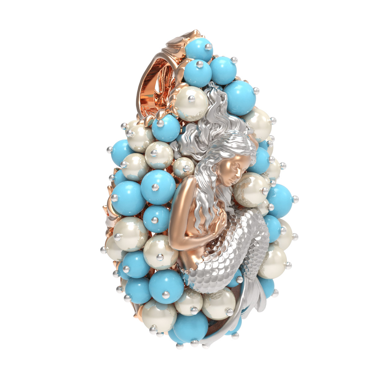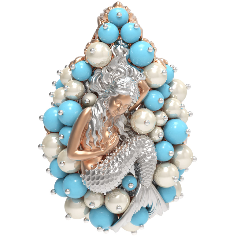Композиция украшена 56 вставками, создающими роскошный объемный эффект. Гармоничное сочетание жемчуга белого цвета в форме круга и бирюзы бирюзового цвета превращает подвеску в настоящее произведение искусства. Такое сочетание материалов придает украшению особую статусность и выразительность. Вставки в форме бусины создают мягкую, природную эстетику, напоминающую о морских сокровищах.
