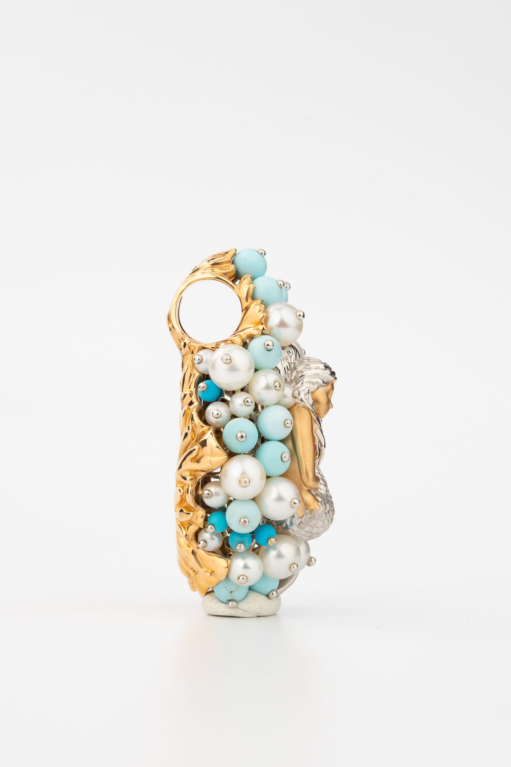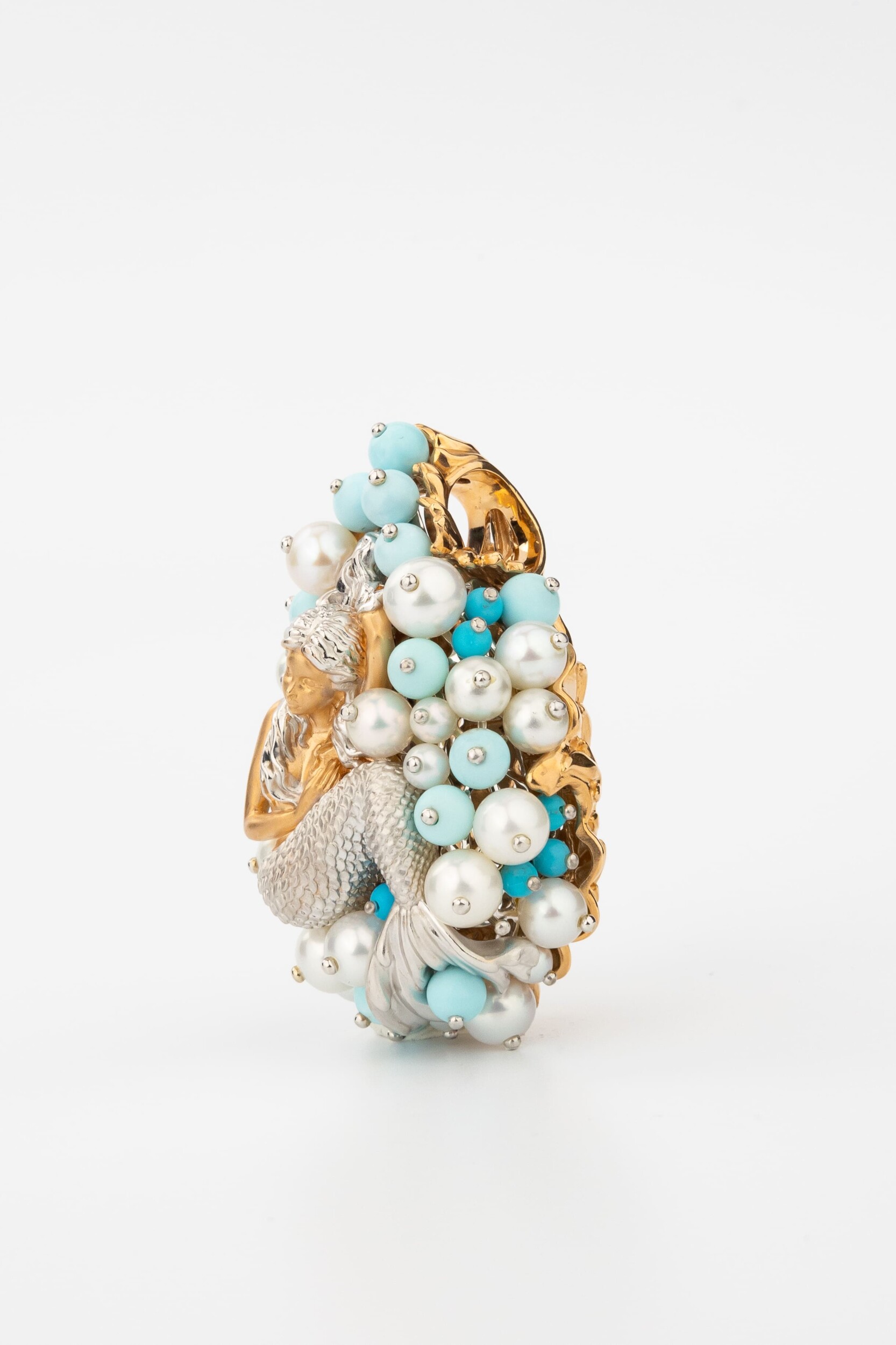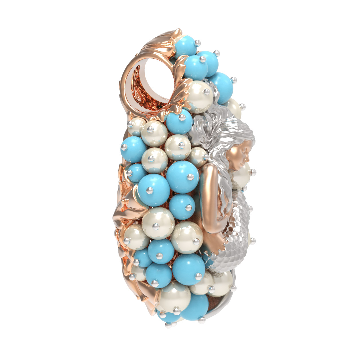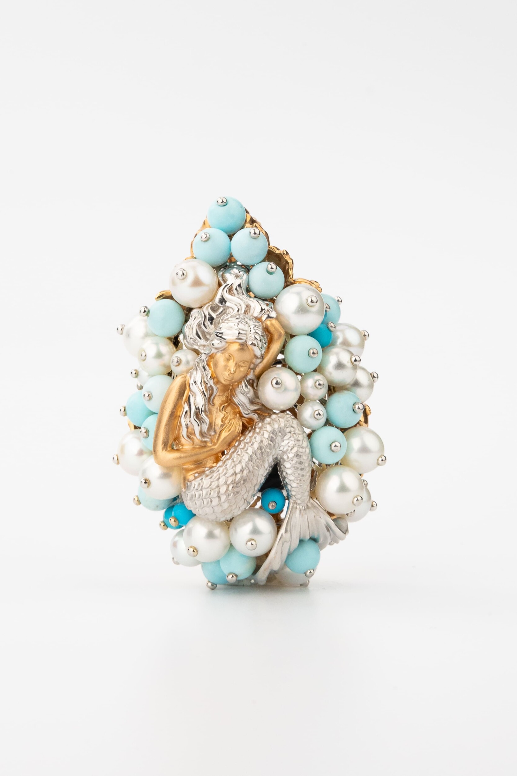 Композиция украшена 56 вставками, создающими роскошный объемный эффект. Гармоничное сочетание жемчуга белого цвета в форме круга и бирюзы бирюзового цвета превращает подвеску в настоящее произведение искусства. Такое сочетание материалов придает украшению особую статусность и выразительность. Вставки в форме бусины создают мягкую, природную эстетику, напоминающую о морских сокровищах.