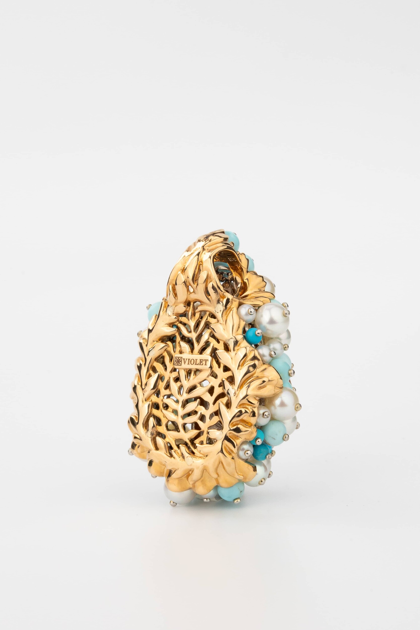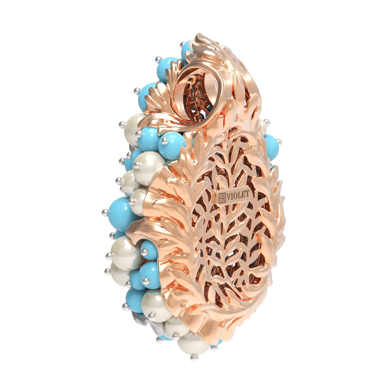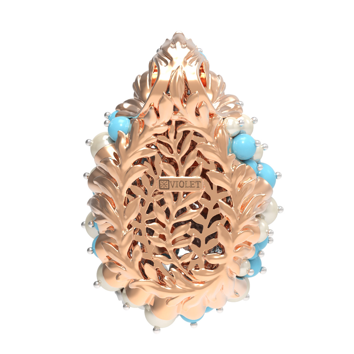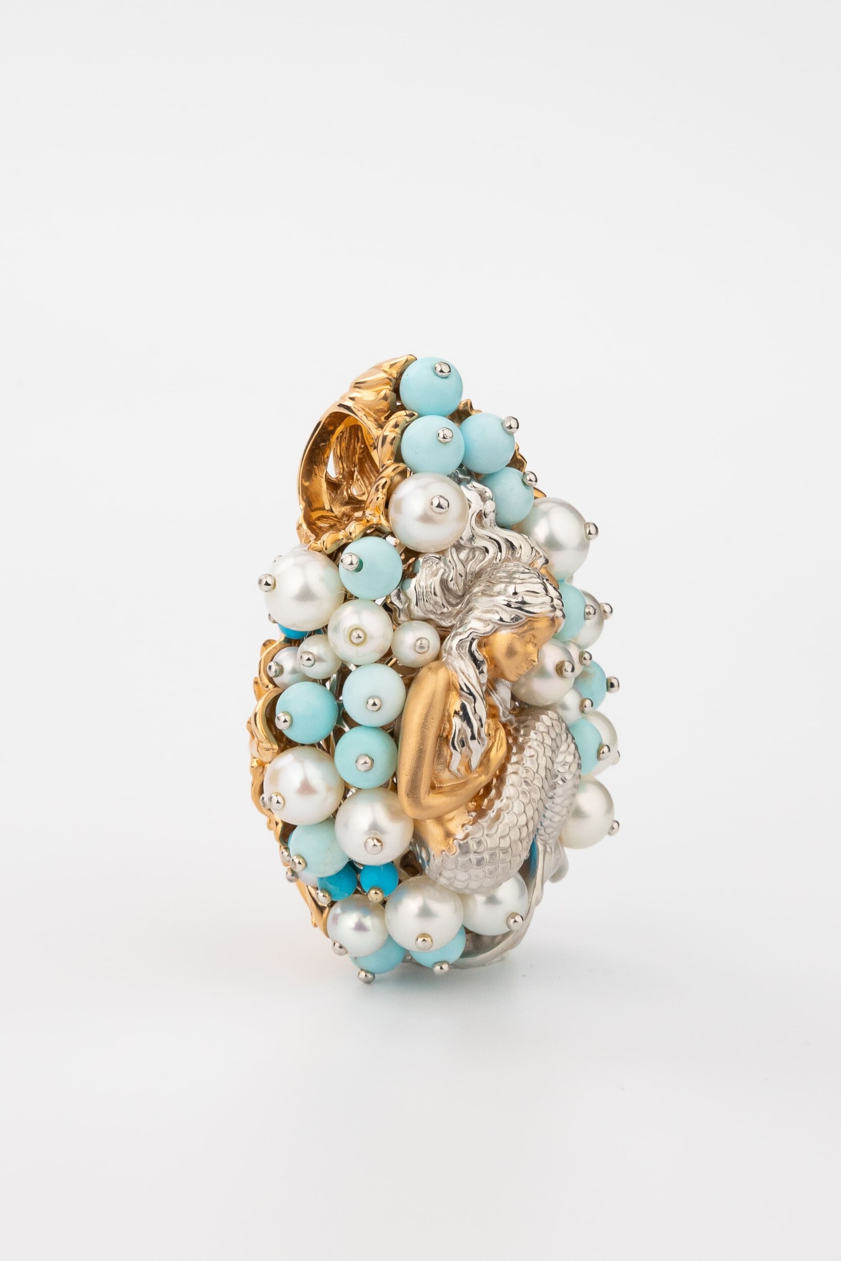 Композиция украшена 56 вставками, создающими роскошный объемный эффект. Гармоничное сочетание жемчуга белого цвета в форме круга и бирюзы бирюзового цвета превращает подвеску в настоящее произведение искусства. Такое сочетание материалов придает украшению особую статусность и выразительность. Вставки в форме бусины создают мягкую, природную эстетику, напоминающую о морских сокровищах.