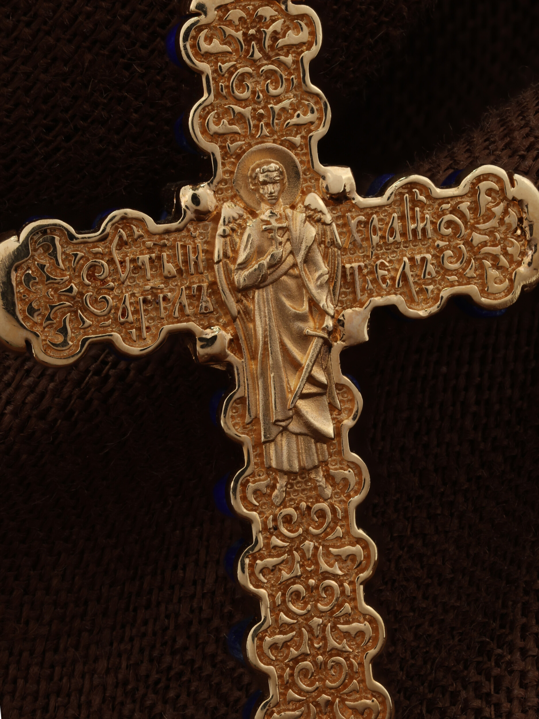 На оборотной стороне креста изображен святой Ангел-Хранитель в виде прекрасного юноши держащего в правой руке крест, а в левой — сферу. Ангел-Хранитель — это Ангел приставляемый Богом к человеку при крещении для охраны и помощи в добрых делах. Невидимо пребывая при нас постоянно, он, руководствуя нас ко спасению, не только по нашему желанию таинственно наставляет нас на все доброе и полезное, не только возносит наши молитвы к Богу, но еще и сам от себя охраняют и защищают нас от врагов видимых и невидимых, ходатайствует за нас пред Богом.