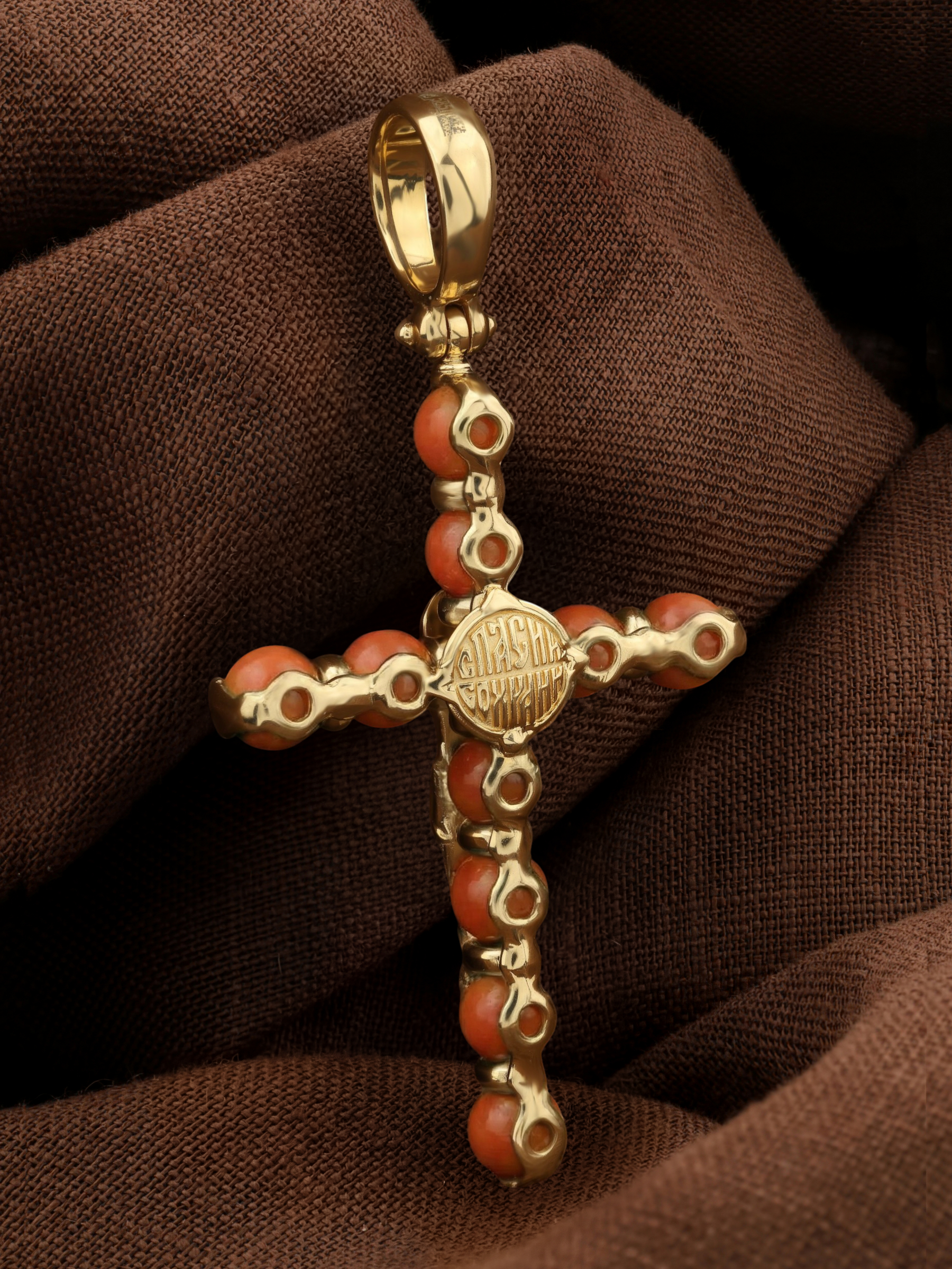 На лицевой стороне креста изображено Распятие Господа и Спасителя нашего Иисуса Христа. Своими крестными страданиями Господь смыл наши грехи, покрыл наш долг перед Богом или, на языке Писания, нас «искупил». В Голгофе сокрыта непостижимая тайна бесконечной правды и любви Бога. Крест стал символом победы добра над злом, жизни над смертью, напоминанием бесконечной Божьей любви, предметом радости. Воплотившийся Сын Божий Своею кровью освятил крест и сделал его проводником Своей благодати, источником освящения верующих. На верхней табличке, выше головы Иисуса, расположена надпись, составленная Понтием Пилатом — «IНЦI». Она означает «Иисус Назорей, Царь Иудейский». Надпись «IC» «ХC», означает Иисус Христос, помещаются на разных сторонах поперечной перекладины креста. Христос в Своей Божественной любви, над которой смерть не властна и которая, страдая, и не страдает в обычном смысле, простирает к людям со Креста Свои объятия, в которые призывается и привлекается весь мир. Поэтому Тело Его не висит, а торжественно покоится на Кресте.