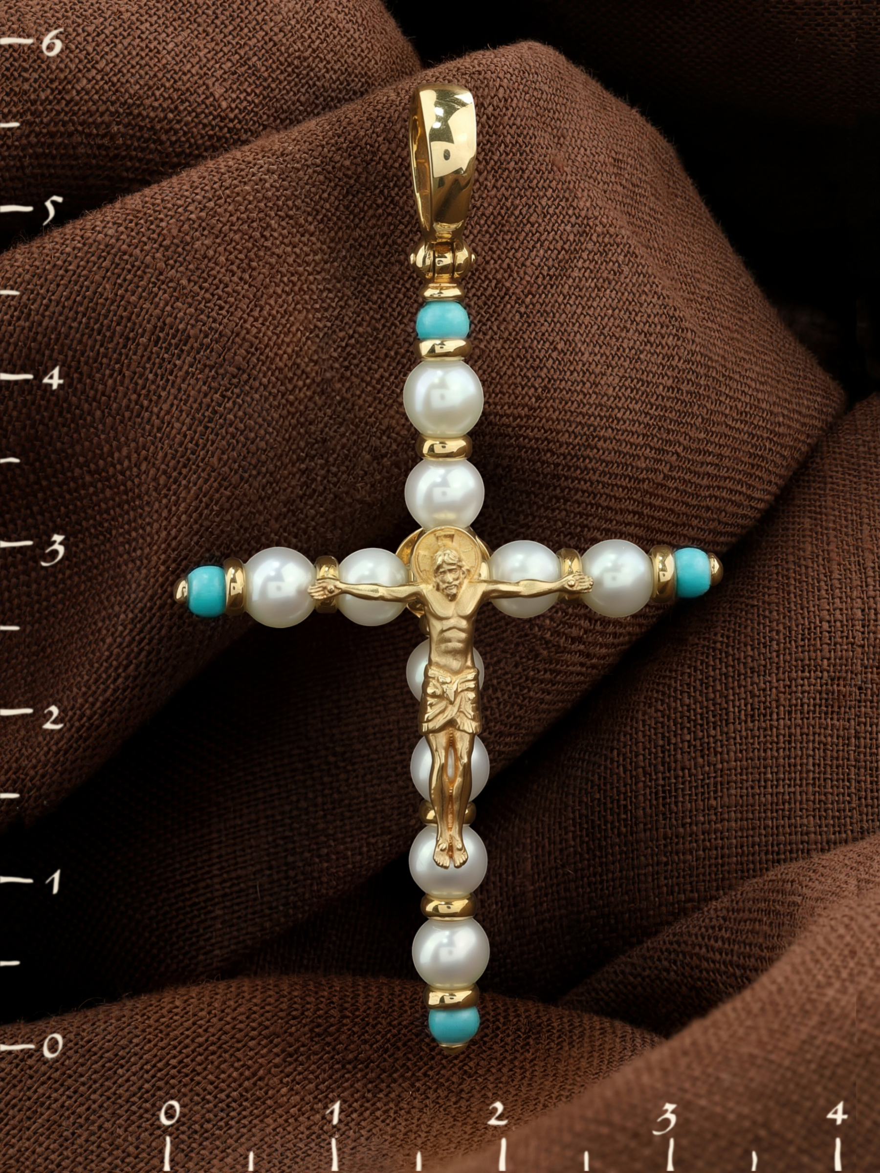 На лицевой стороне креста изображено Распятие Господа и Спасителя нашего Иисуса Христа. Своими крестными страданиями Господь смыл наши грехи, покрыл наш долг перед Богом или, на языке Писания, нас «искупил». В Голгофе сокрыта непостижимая тайна бесконечной правды и любви Бога. Крест стал символом победы добра над злом, жизни над смертью, напоминанием бесконечной Божьей любви, предметом радости. Воплотившийся Сын Божий Своею кровью освятил крест и сделал его проводником Своей благодати, источником освящения верующих. На верхней табличке, выше головы Иисуса, расположена надпись, составленная Понтием Пилатом — «IНЦI». Она означает «Иисус Назорей, Царь Иудейский». Надпись «IC» «ХC», означает Иисус Христос, помещаются на разных сторонах поперечной перекладины креста. Христос в Своей Божественной любви, над которой смерть не властна и которая, страдая, и не страдает в обычном смысле, простирает к людям со Креста Свои объятия, в которые призывается и привлекается весь мир. Поэтому Тело Его не висит, а торжественно покоится на Кресте.