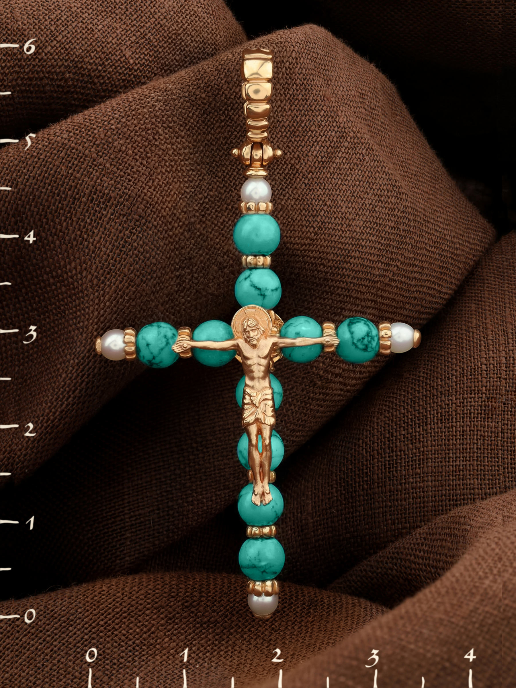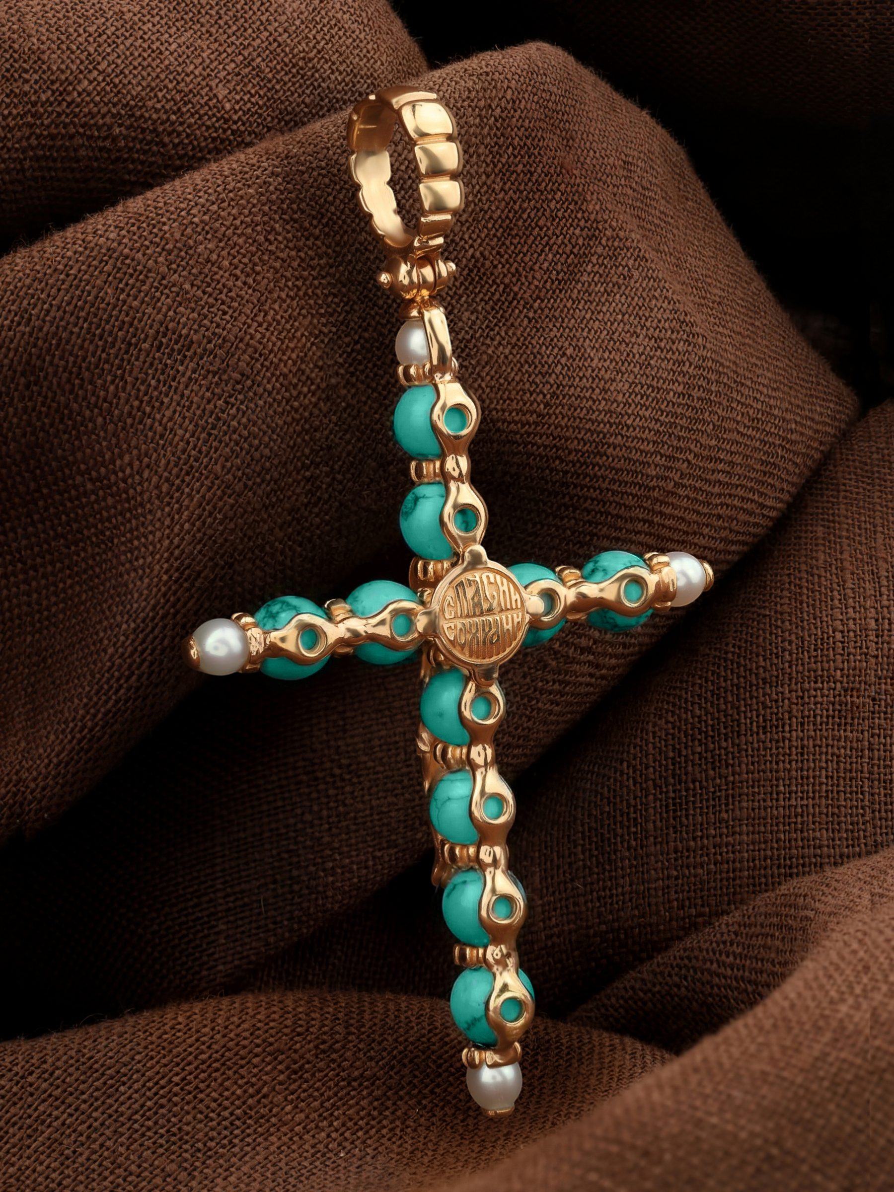 Крест из золота c жемчугом и бирюзой
