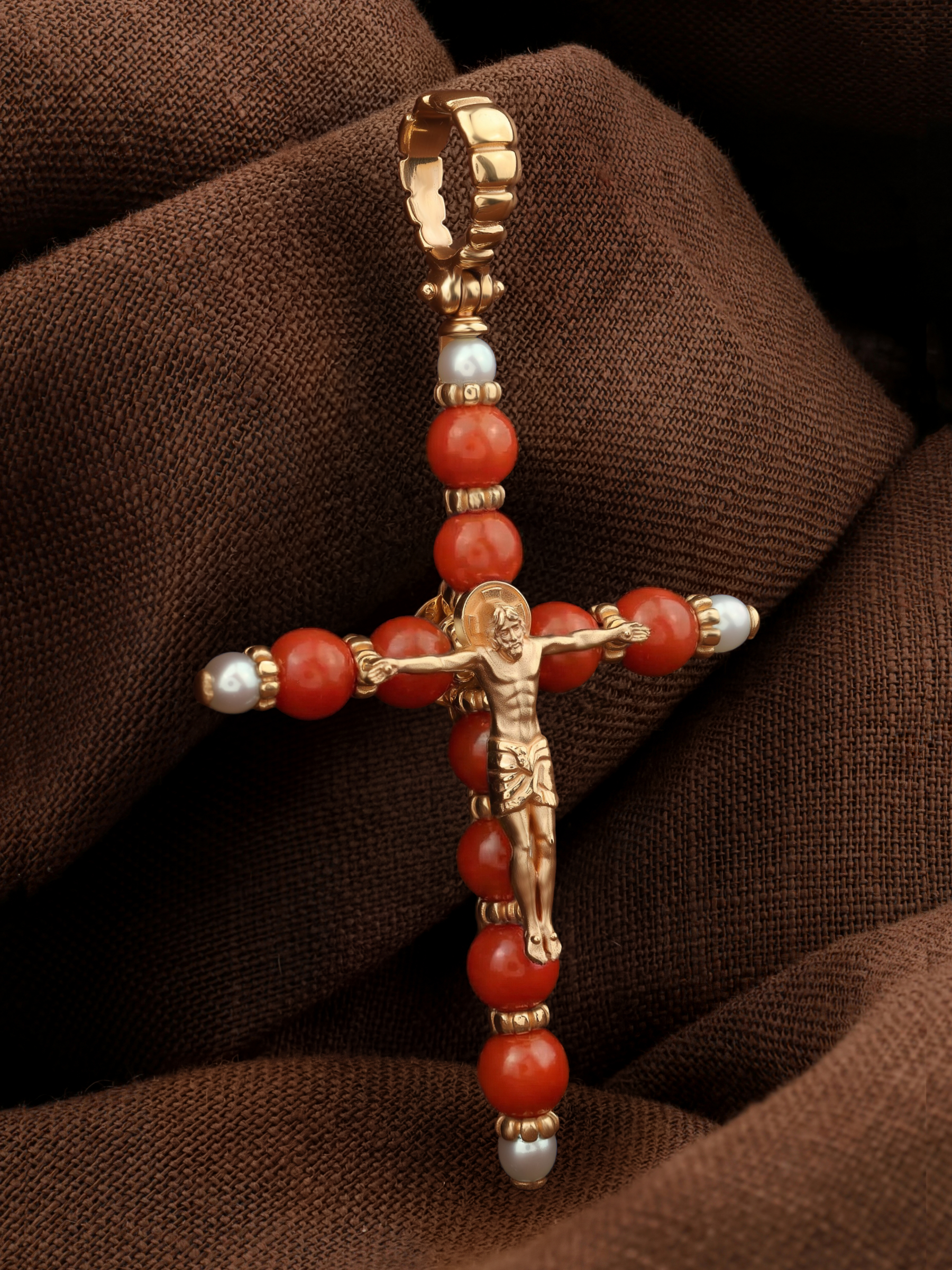 Крест из золота c жемчугом и кораллом