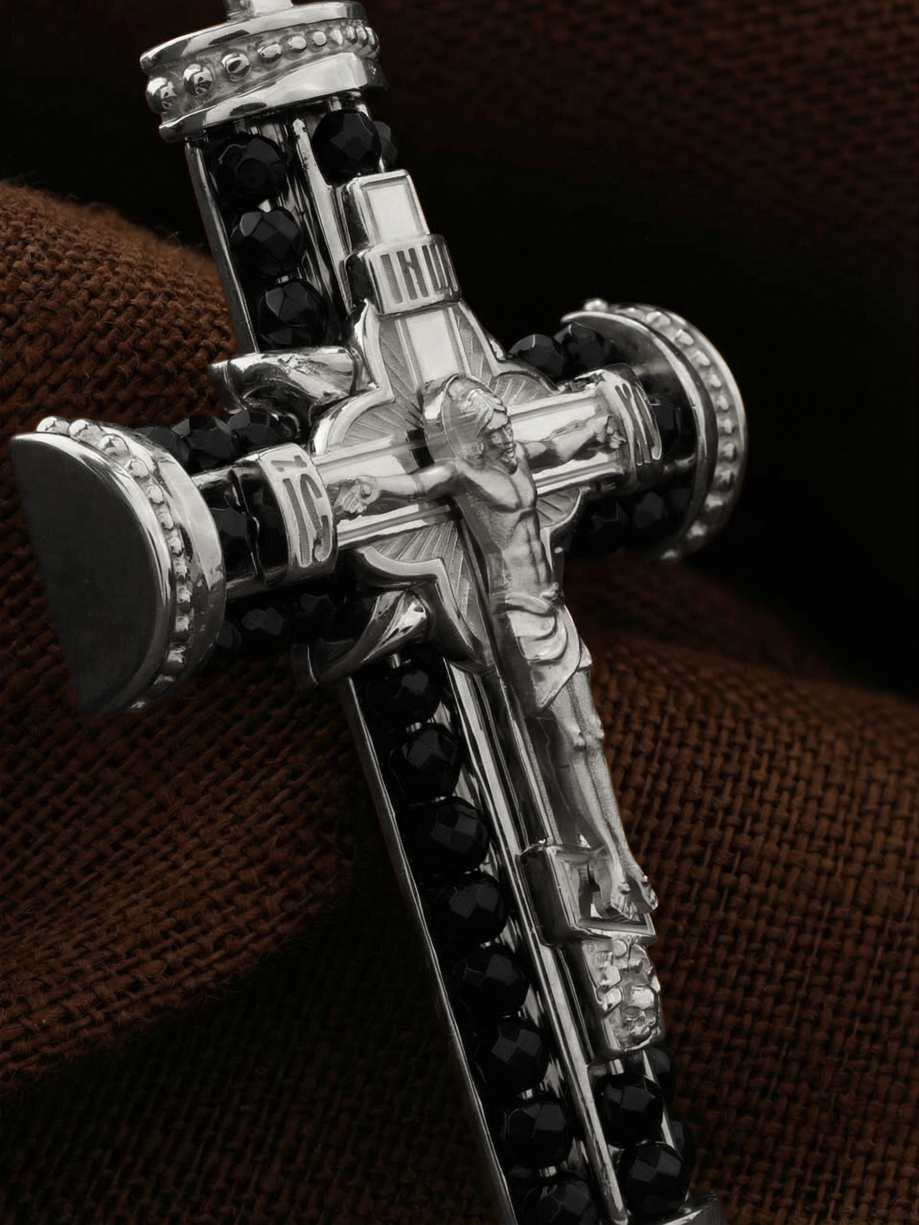На лицевой стороне креста изображено Распятие Господа и Спасителя нашего Иисуса Христа. Своими крестными страданиями Господь смыл наши грехи, покрыл наш долг перед Богом или, на языке Писания, нас «искупил». В Голгофе сокрыта непостижимая тайна бесконечной правды и любви Бога. Крест стал символом победы добра над злом, жизни над смертью, напоминанием бесконечной Божьей любви, предметом радости. Воплотившийся Сын Божий Своею кровью освятил крест и сделал его проводником Своей благодати, источником освящения верующих. На верхней табличке, выше головы Иисуса, расположена надпись, составленная Понтием Пилатом — «IНЦI». Она означает «Иисус Назорей, Царь Иудейский». Надпись «IC» «ХC», означает Иисус Христос, помещаются на разных сторонах поперечной перекладины креста. Христос в Своей Божественной любви, над которой смерть не властна и которая, страдая, и не страдает в обычном смысле, простирает к людям со Креста Свои объятия, в которые призывается и привлекается весь мир. Поэтому Тело Его не висит, а торжественно покоится на Кресте.