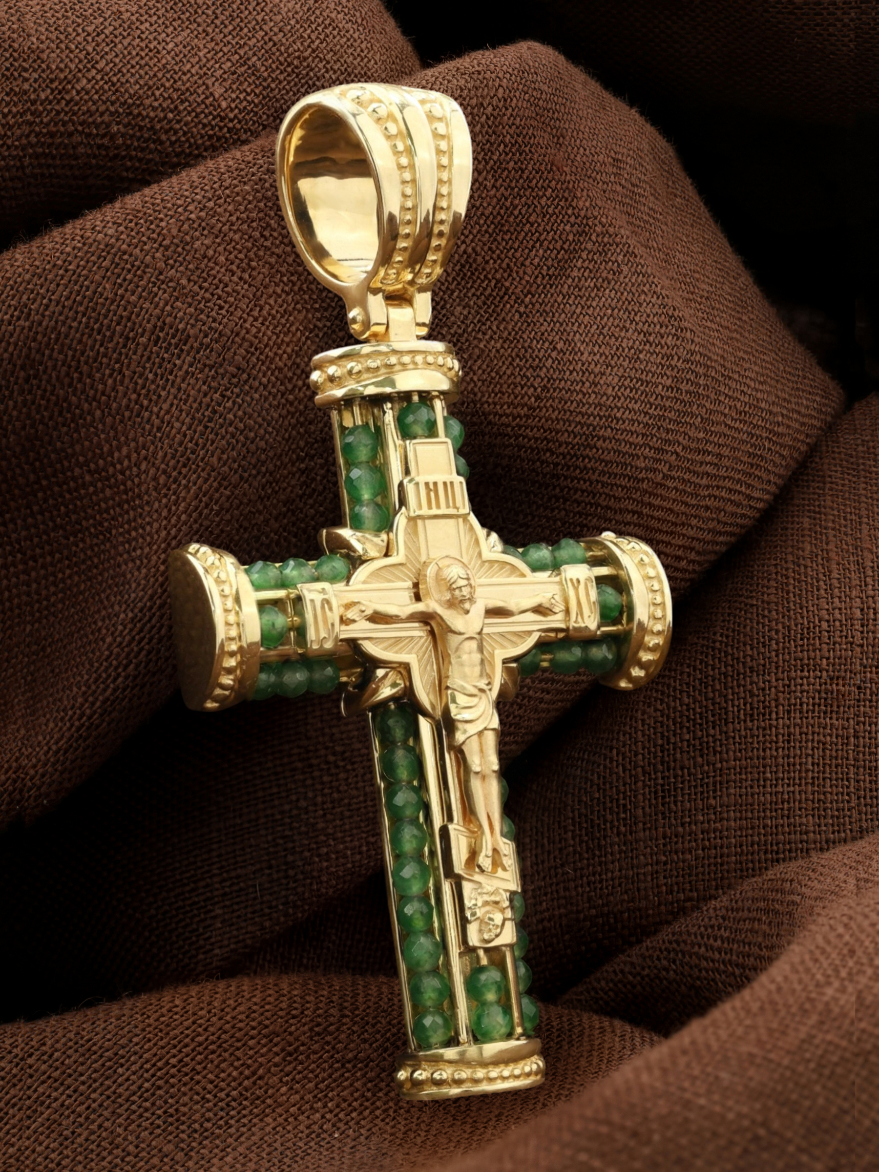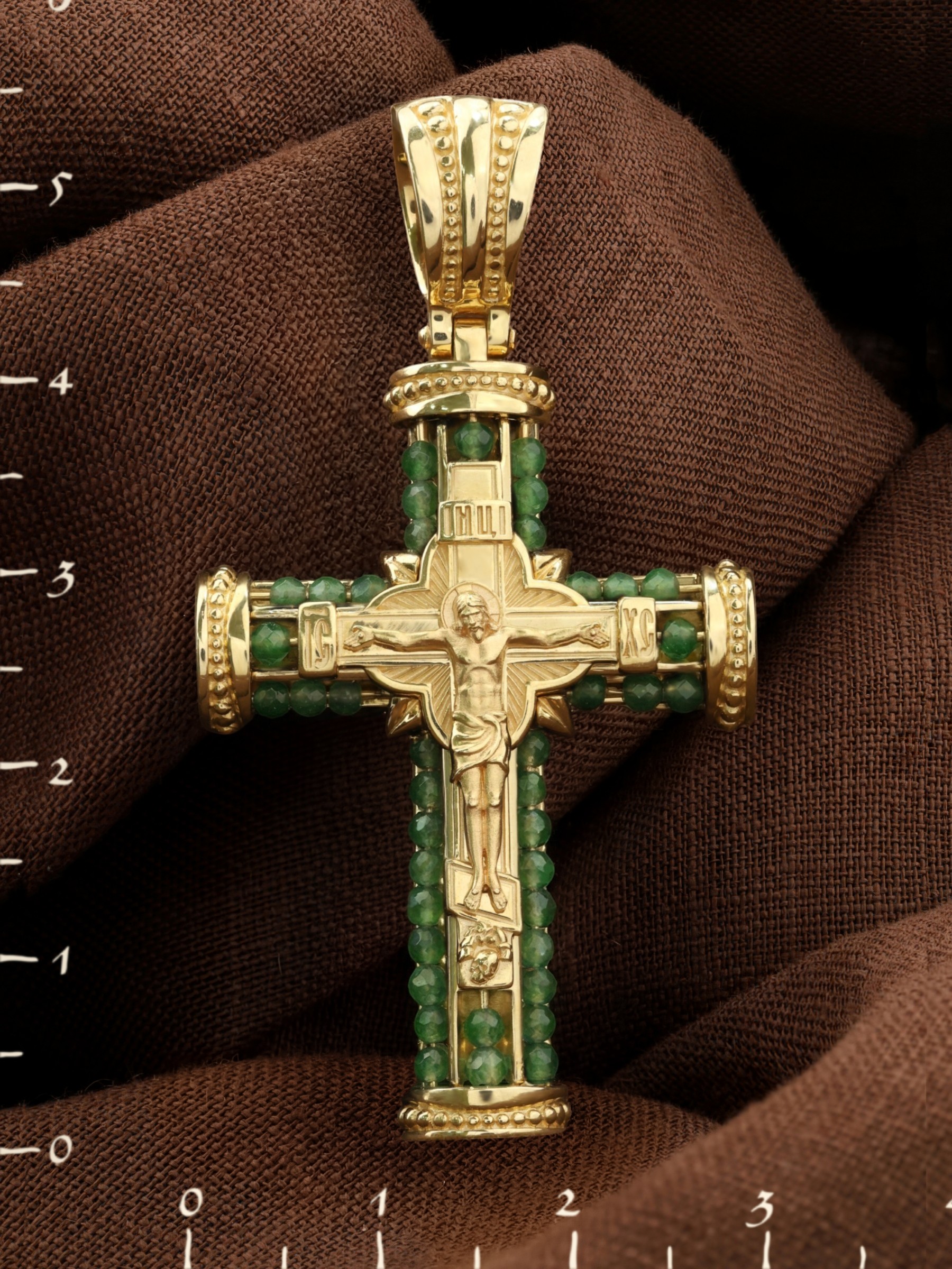На лицевой стороне креста изображено Распятие Господа и Спасителя нашего Иисуса Христа. Своими крестными страданиями Господь смыл наши грехи, покрыл наш долг перед Богом или, на языке Писания, нас «искупил». В Голгофе сокрыта непостижимая тайна бесконечной правды и любви Бога. Крест стал символом победы добра над злом, жизни над смертью, напоминанием бесконечной Божьей любви, предметом радости. Воплотившийся Сын Божий Своею кровью освятил крест и сделал его проводником Своей благодати, источником освящения верующих. На верхней табличке, выше головы Иисуса, расположена надпись, составленная Понтием Пилатом — «IНЦI». Она означает «Иисус Назорей, Царь Иудейский». Надпись «IC» «ХC», означает Иисус Христос, помещаются на разных сторонах поперечной перекладины креста. Христос в Своей Божественной любви, над которой смерть не властна и которая, страдая, и не страдает в обычном смысле, простирает к людям со Креста Свои объятия, в которые призывается и привлекается весь мир. Поэтому Тело Его не висит, а торжественно покоится на Кресте.