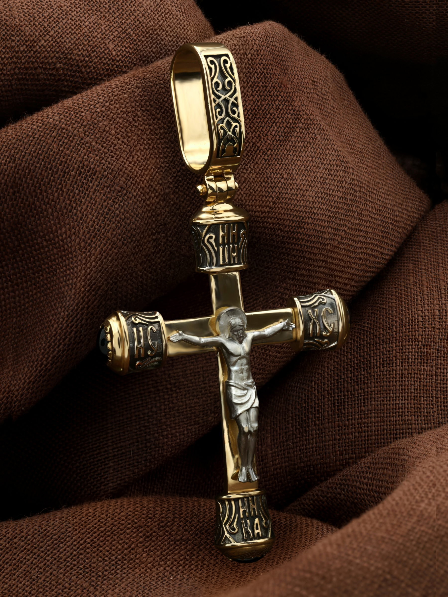 На лицевой стороне креста изображено Распятие Господа и Спасителя нашего Иисуса Христа. В Голгофе сокрыта непостижимая тайна бесконечной правды и любви Бога. Крест стал символом победы добра над злом, жизни над смертью, напоминанием бесконечной Божьей любви, предметом радости. Воплотившийся Сын Божий Своею кровью освятил крест и сделал его проводником Своей благодати, источником освящения верующих. Над распятием расположена надпись, составленная Понтием Пилатом — «ИНЦИ». Она означает «Иисус Назорей, Царь Иудейский». Надпись «ИС» «ХС» означает Иисус Христос и помещается на разных сторонах поперечной перекладины креста. В нижней части креста расположена «НИКА», что означает «победитель». На православном кресте Христос не умирает, а свободно простирает руки, ладони Иисуса открыты, будто он хочет обнять все человечество, даря им свою любовь и открывая путь к вечной жизни.