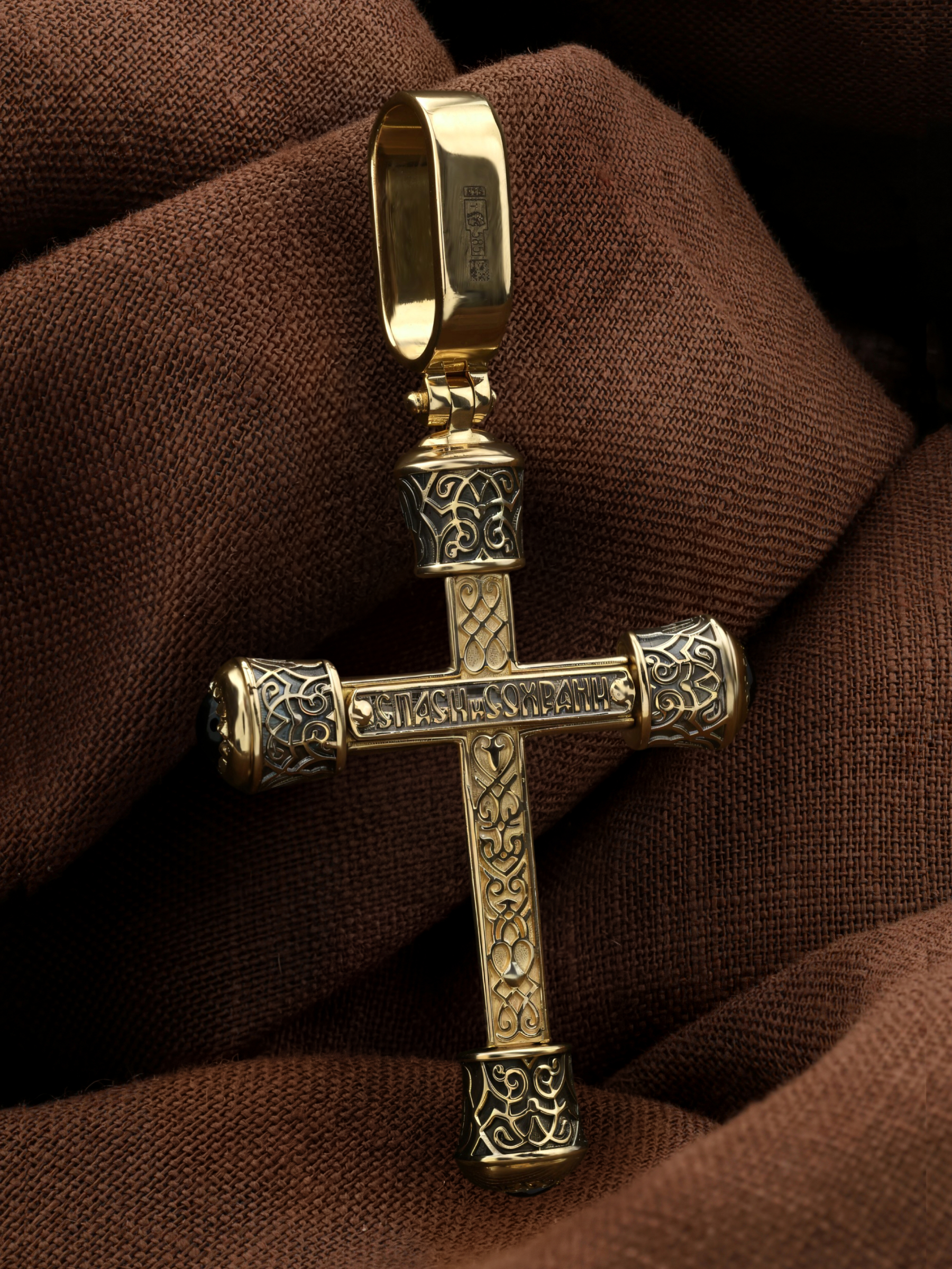 На оборотной стороне креста написана молитва: «Спаси и сохрани». Крест украшен орнаментом.