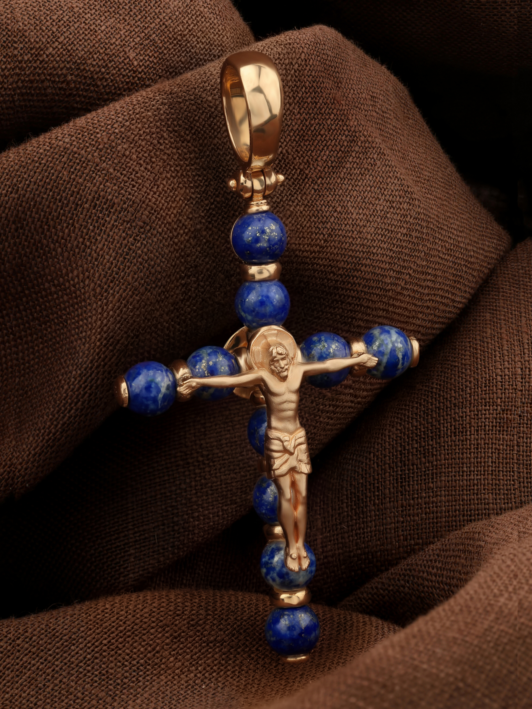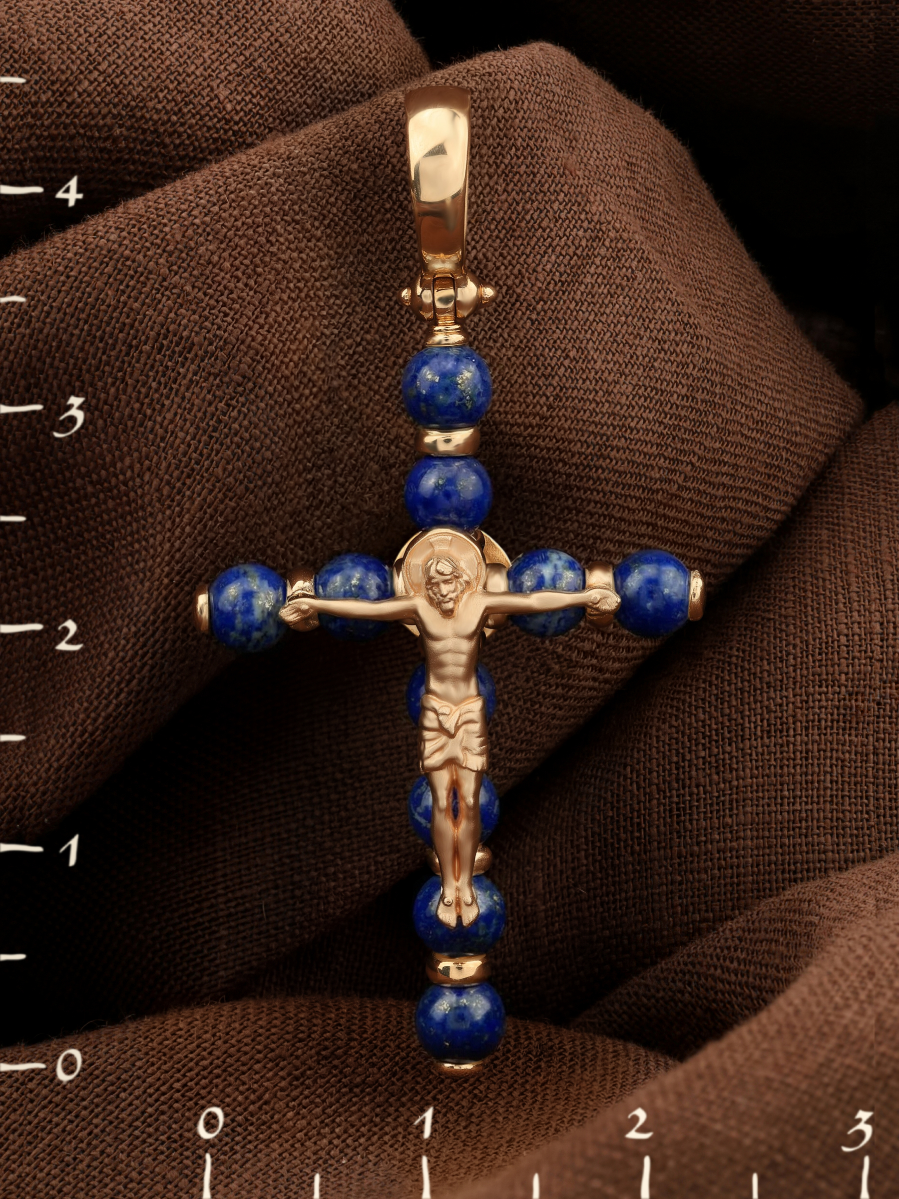 На лицевой стороне креста изображено Распятие Господа и Спасителя нашего Иисуса Христа. Своими крестными страданиями Господь смыл наши грехи, покрыл наш долг перед Богом или, на языке Писания, нас «искупил». В Голгофе сокрыта непостижимая тайна бесконечной правды и любви Бога. Крест стал символом победы добра над злом, жизни над смертью, напоминанием бесконечной Божьей любви, предметом радости. Воплотившийся Сын Божий Своею кровью освятил крест и сделал его проводником Своей благодати, источником освящения верующих. На верхней табличке, выше головы Иисуса, расположена надпись, составленная Понтием Пилатом — «IНЦI». Она означает «Иисус Назорей, Царь Иудейский». Надпись «IC» «ХC», означает Иисус Христос, помещаются на разных сторонах поперечной перекладины креста. Христос в Своей Божественной любви, над которой смерть не властна и которая, страдая, и не страдает в обычном смысле, простирает к людям со Креста Свои объятия, в которые призывается и привлекается весь мир. Поэтому Тело Его не висит, а торжественно покоится на Кресте.