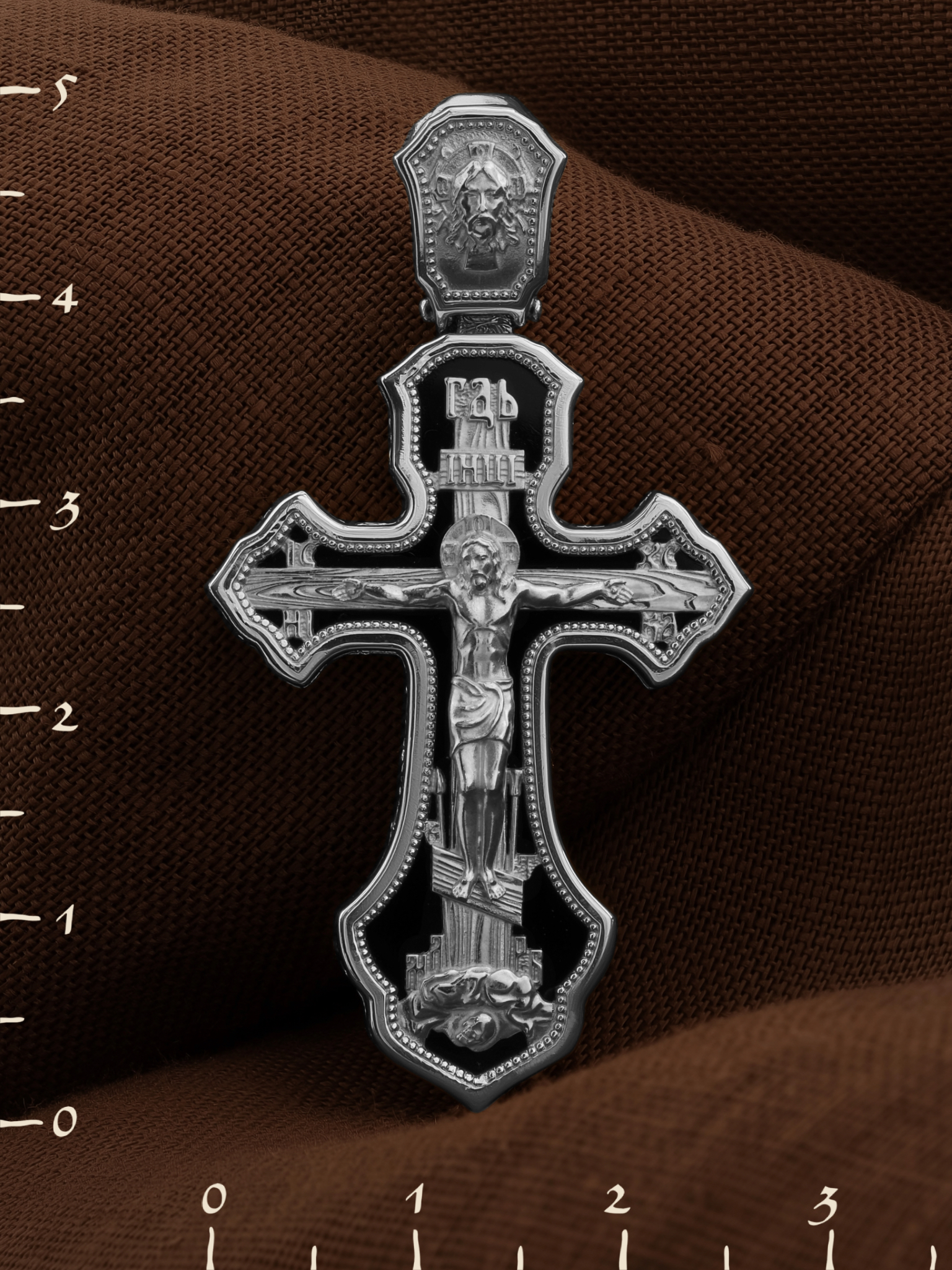На лицевой стороне креста изображено Распятие Господа и Спасителя нашего Иисуса Христа. Христос, подвергнутый на кресте мучительной казни, своими страданиями искупил нас от древнего греха и даровал нам жизнь вечную. Без Распятия не было бы Воскресения Христова, и поэтому Крест из орудия казни обратился в святыню, в которой действует Благодать Божия. Распятие сопровождается каноническими надписями. Над Распятием размещена надпись «ГДЬ», что означает Господь. Верхняя перекладина символизирует титло — табличку, на которой, согласно Евангелию, расположена надпись, составленная Понтием Пилатом на трех языках — «IНЦI». Она означает «Иисус Назорей, Царь Иудейский». Надписи «IC» «ХC», что означает Иисус Христос, и «НИКА», что означает «победитель», помещаются на разных сторонах поперечной перекладины креста. Вдоль креста изображены копие сотника Лонгина и трость с губкой и буквы «К» и «Т». Надпись «МЛРБ» — «место лобное рай бысть», что означает место лобное стало раем, размещены в нижней части креста. Крест стоит на горе камней, символизирующих Голгофу. В ее основании различается череп — это голова Адама. На кулонном кольце изображен Нерукотворный образ Господа и Спасителя нашего Иисуса Христа, чудесно отпечатавшийся на плате, которым Христос вытер свой лик.