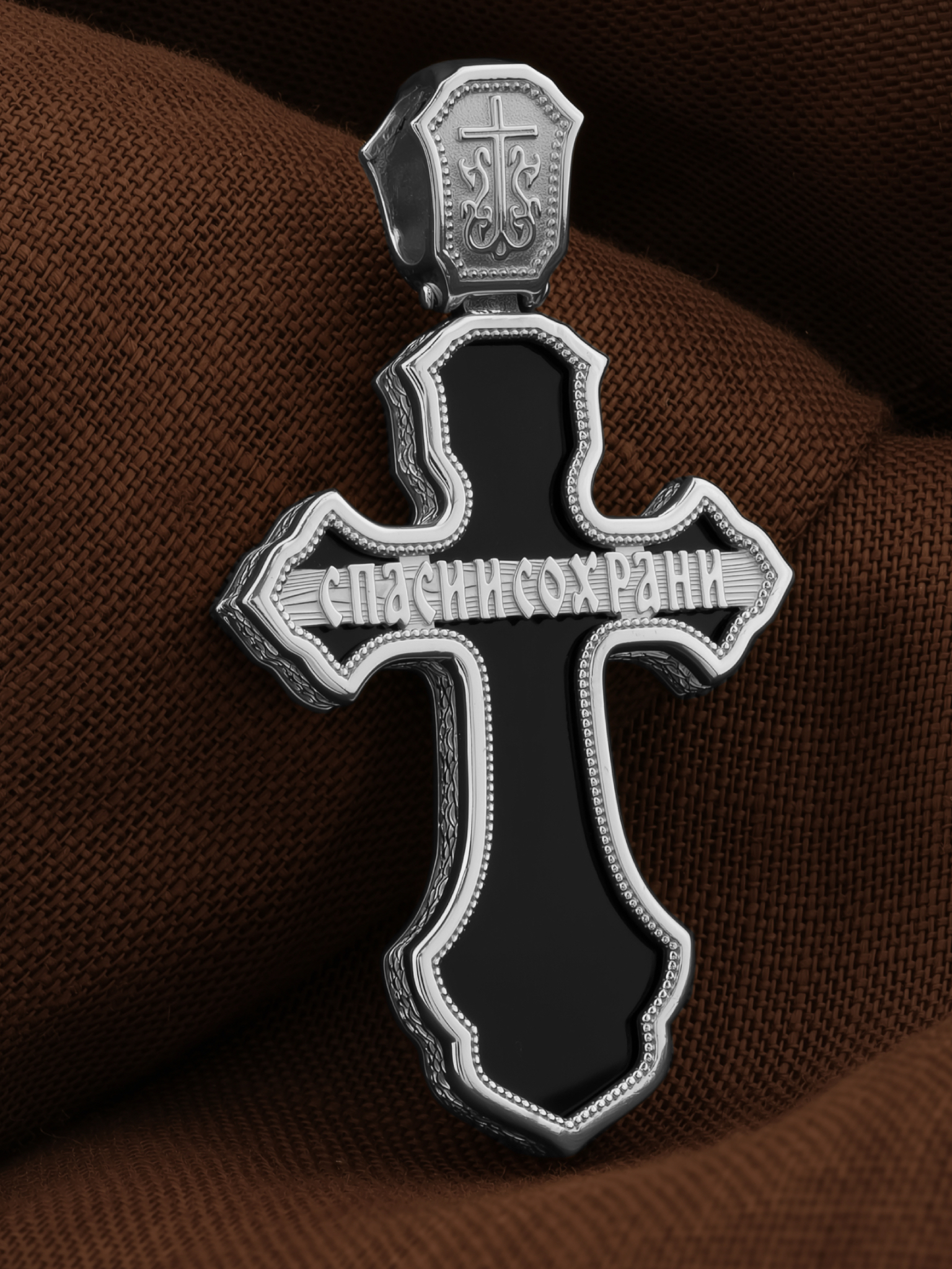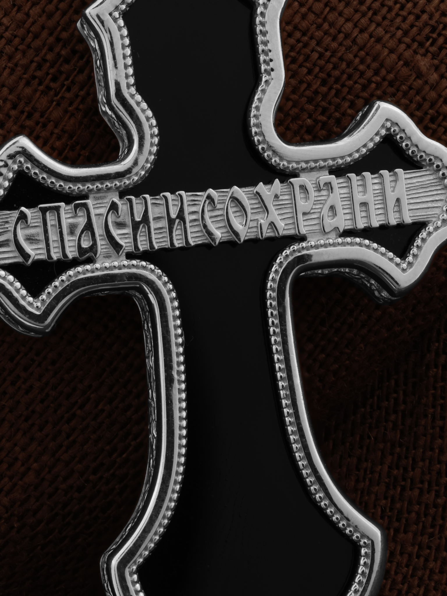 На оборотной стороне креста отображена молитва: «Спаси и сохрани».