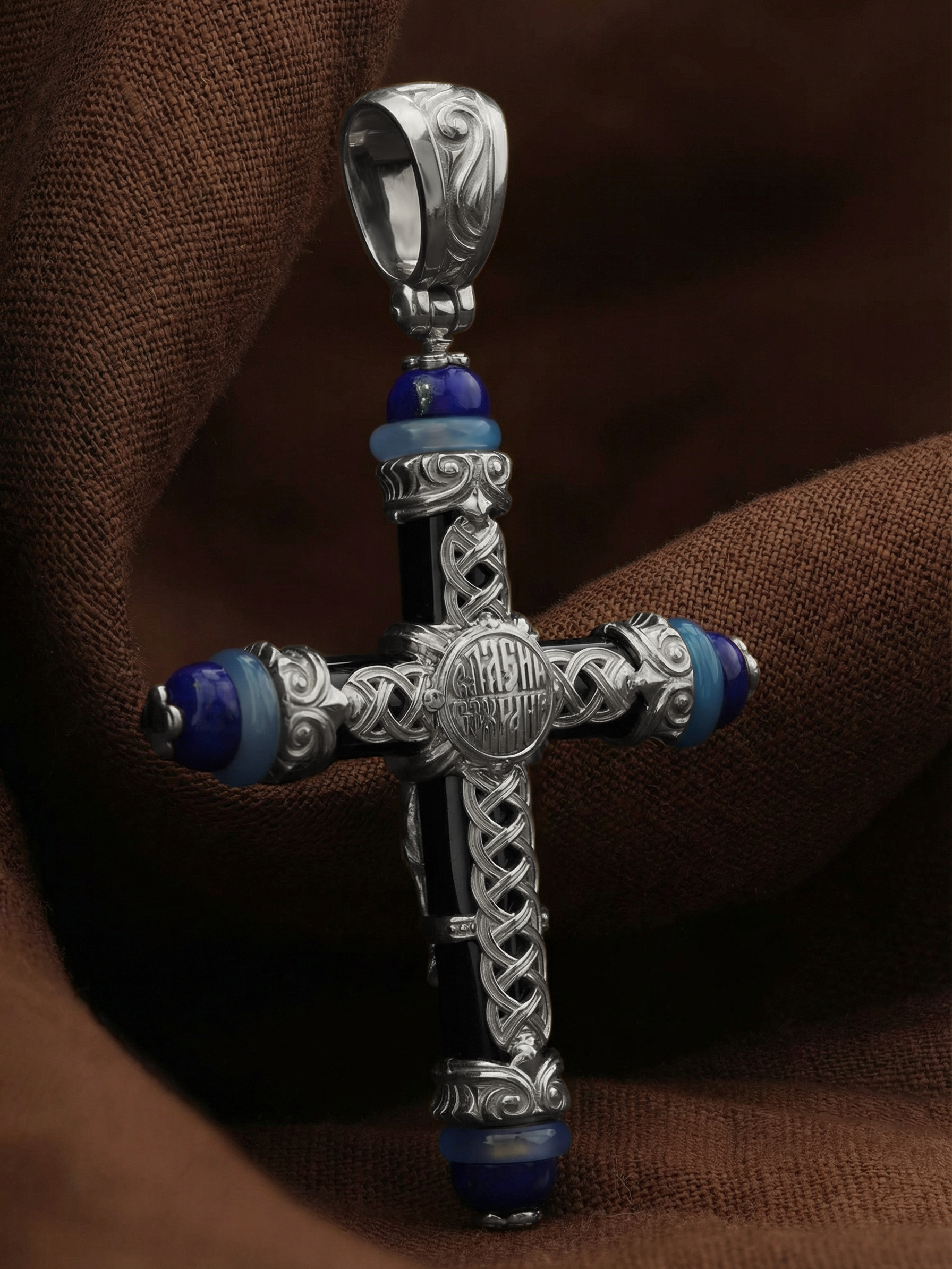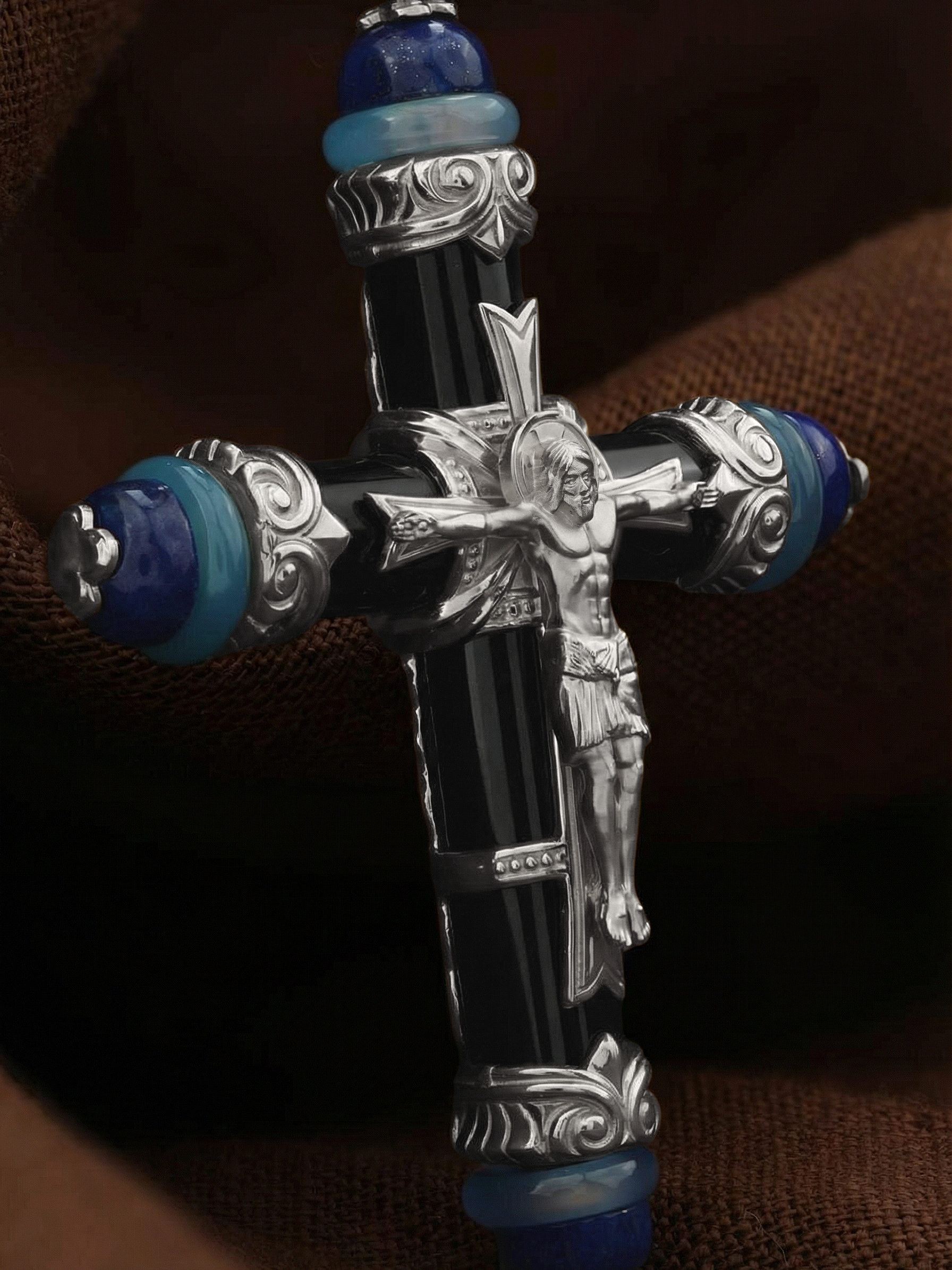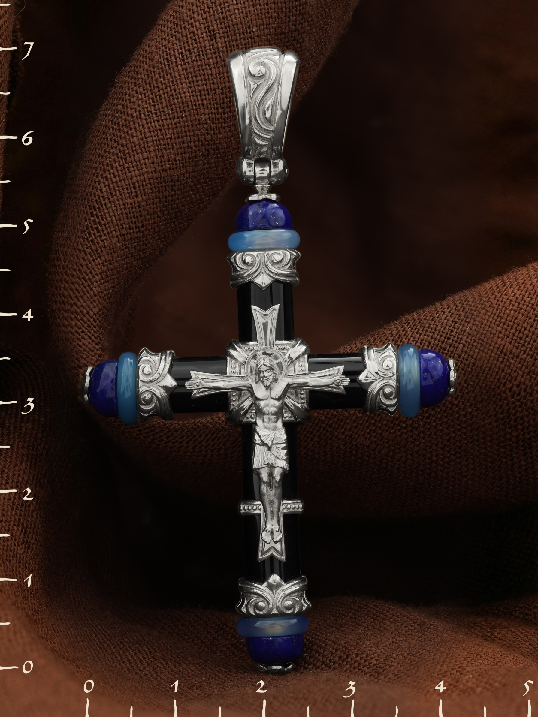 На лицевой стороне креста изображено Распятие Господа и Спасителя нашего Иисуса Христа. Своими крестными страданиями Господь смыл наши грехи, покрыл наш долг перед Богом или, на языке Писания, нас «искупил». В Голгофе сокрыта непостижимая тайна бесконечной правды и любви Бога. Крест стал символом победы добра над злом, жизни над смертью, напоминанием бесконечной Божьей любви, предметом радости. Воплотившийся Сын Божий Своею кровью освятил крест и сделал его проводником Своей благодати, источником освящения верующих. Христос в Своей Божественной любви, над которой смерть не властна и которая, страдая, и не страдает в обычном смысле, простирает к людям со Креста Свои объятия, в которые призывается и привлекается весь мир. Поэтому Тело Его не висит, а торжественно покоится на Кресте.