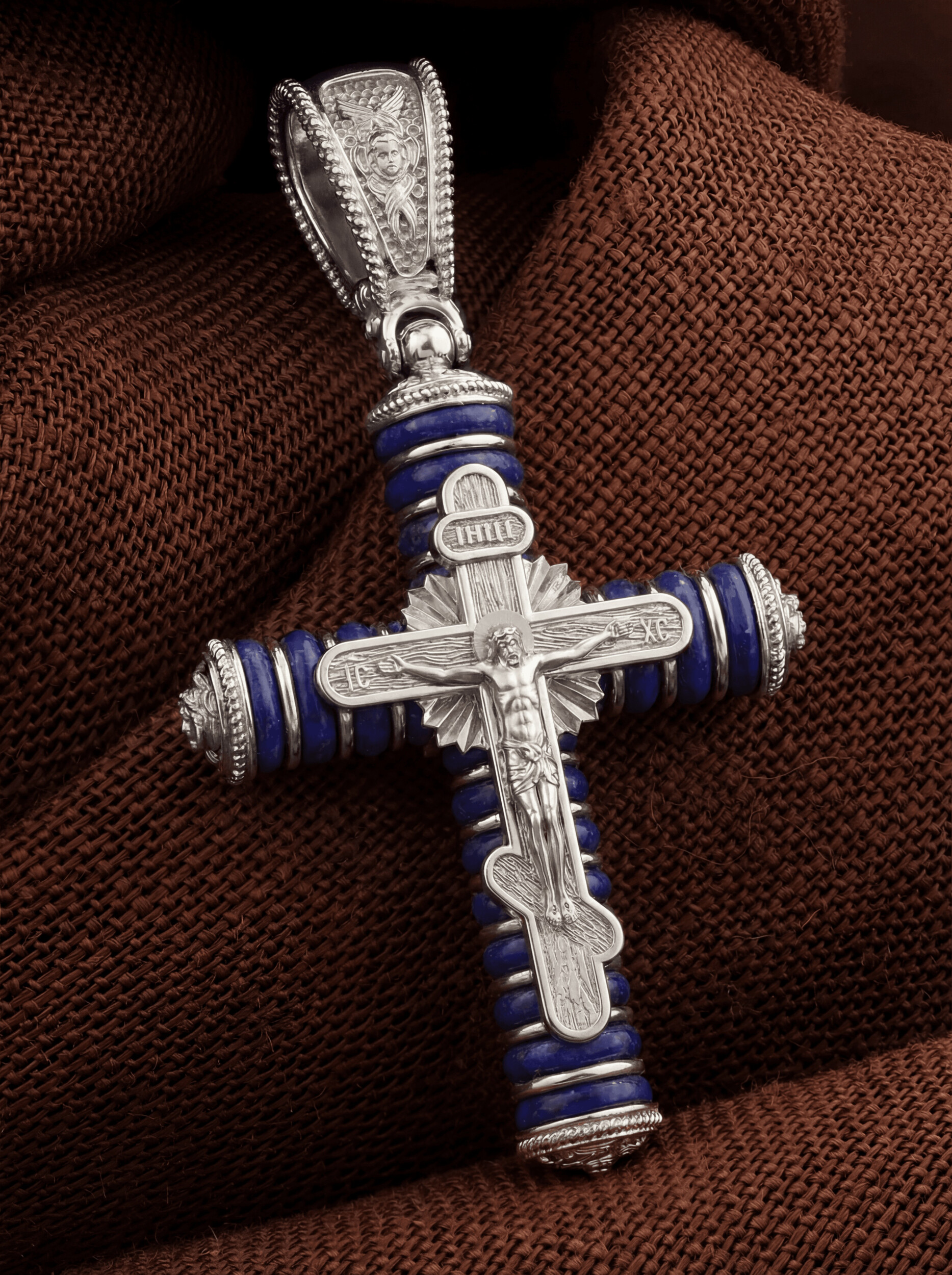 На лицевой стороне креста изображено Распятие Господа и Спасителя нашего Иисуса Христа. Своими крестными страданиями Господь смыл наши грехи, покрыл наш долг перед Богом или, на языке Писания, нас «искупил». В Голгофе сокрыта непостижимая тайна бесконечной правды и любви Бога. Крест стал символом победы добра над злом, жизни над смертью, напоминанием бесконечной Божьей любви, предметом радости. Воплотившийся Сын Божий Своею кровью освятил крест и сделал его проводником Своей благодати, источником освящения верующих. На верхней табличке, выше головы Иисуса, расположена надпись, составленная Понтием Пилатом — «IНЦI». Она означает «Иисус Назорей, Царь Иудейский». Надпись «IC» «ХC», означает Иисус Христос, помещаются на разных сторонах поперечной перекладины креста. Христос в Своей Божественной любви, над которой смерть не властна и которая, страдая, и не страдает в обычном смысле, простирает к людям со Креста Свои объятия, в которые призывается и привлекается весь мир. Поэтому Тело Его не висит, а торжественно покоится на Кресте. На кулонном кольце изображен шестикрылый Серафим. Серафим означает «Пламенный». Горя любовью к Богу, он зажигает огонь этой любви и в сердцах людей.
