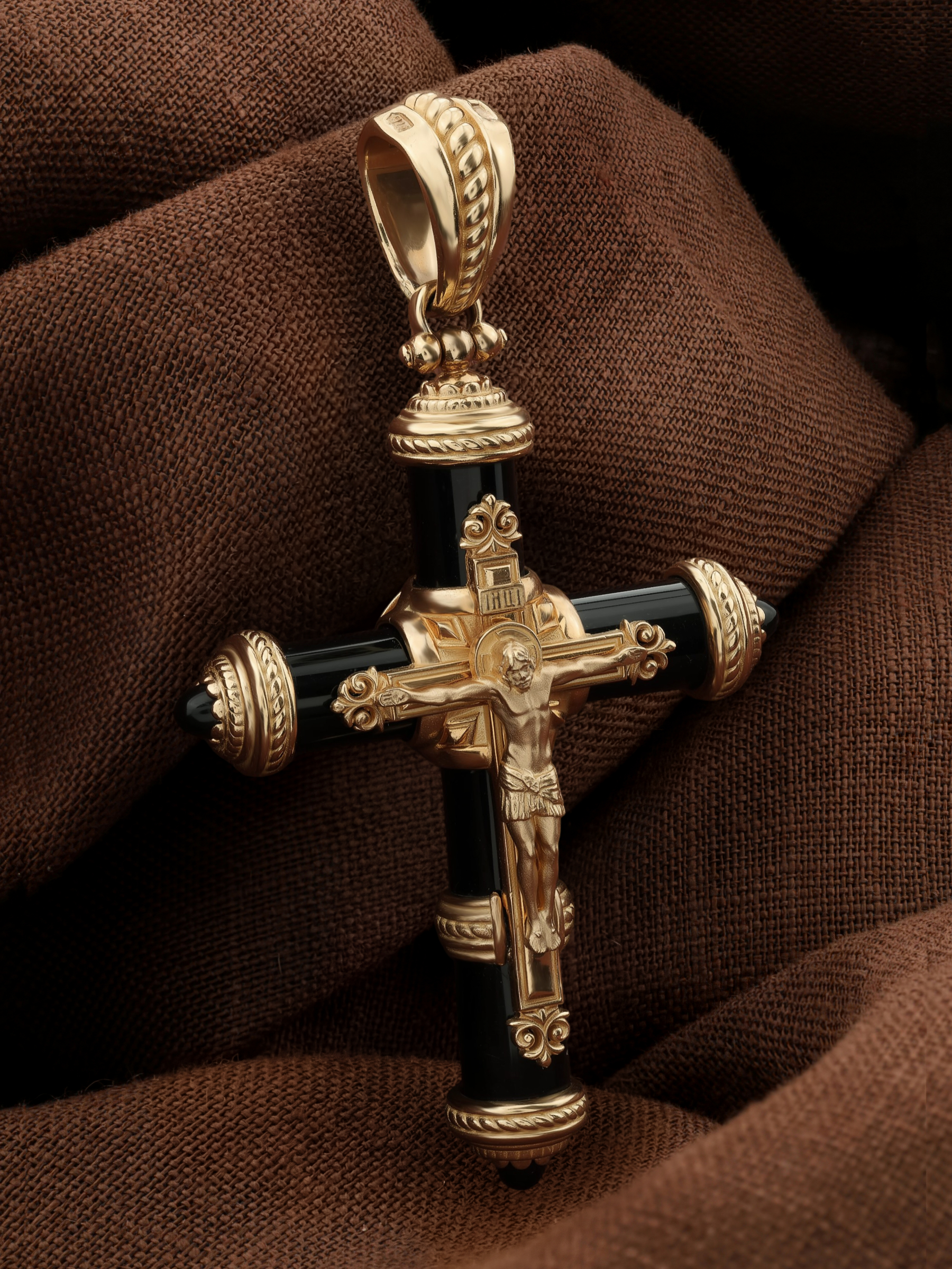 На лицевой стороне креста изображено Распятие Господа и Спасителя нашего Иисуса Христа. Своими крестными страданиями Господь смыл наши грехи, покрыл наш долг перед Богом или, на языке Писания, нас «искупил». В Голгофе сокрыта непостижимая тайна бесконечной правды и любви Бога. Крест стал символом победы добра над злом, жизни над смертью, напоминанием бесконечной Божьей любви, предметом радости. Воплотившийся Сын Божий Своею кровью освятил крест и сделал его проводником Своей благодати, источником освящения верующих. На верхней табличке, выше головы Иисуса, расположена надпись, составленная Понтием Пилатом — «IНЦI». Она означает «Иисус Назорей, Царь Иудейский». Надпись «IC» «ХC», означает Иисус Христос, помещаются на разных сторонах поперечной перекладины креста. Христос в Своей Божественной любви, над которой смерть не властна и которая, страдая, и не страдает в обычном смысле, простирает к людям со Креста Свои объятия, в которые призывается и привлекается весь мир. Поэтому Тело Его не висит, а торжественно покоится на Кресте.