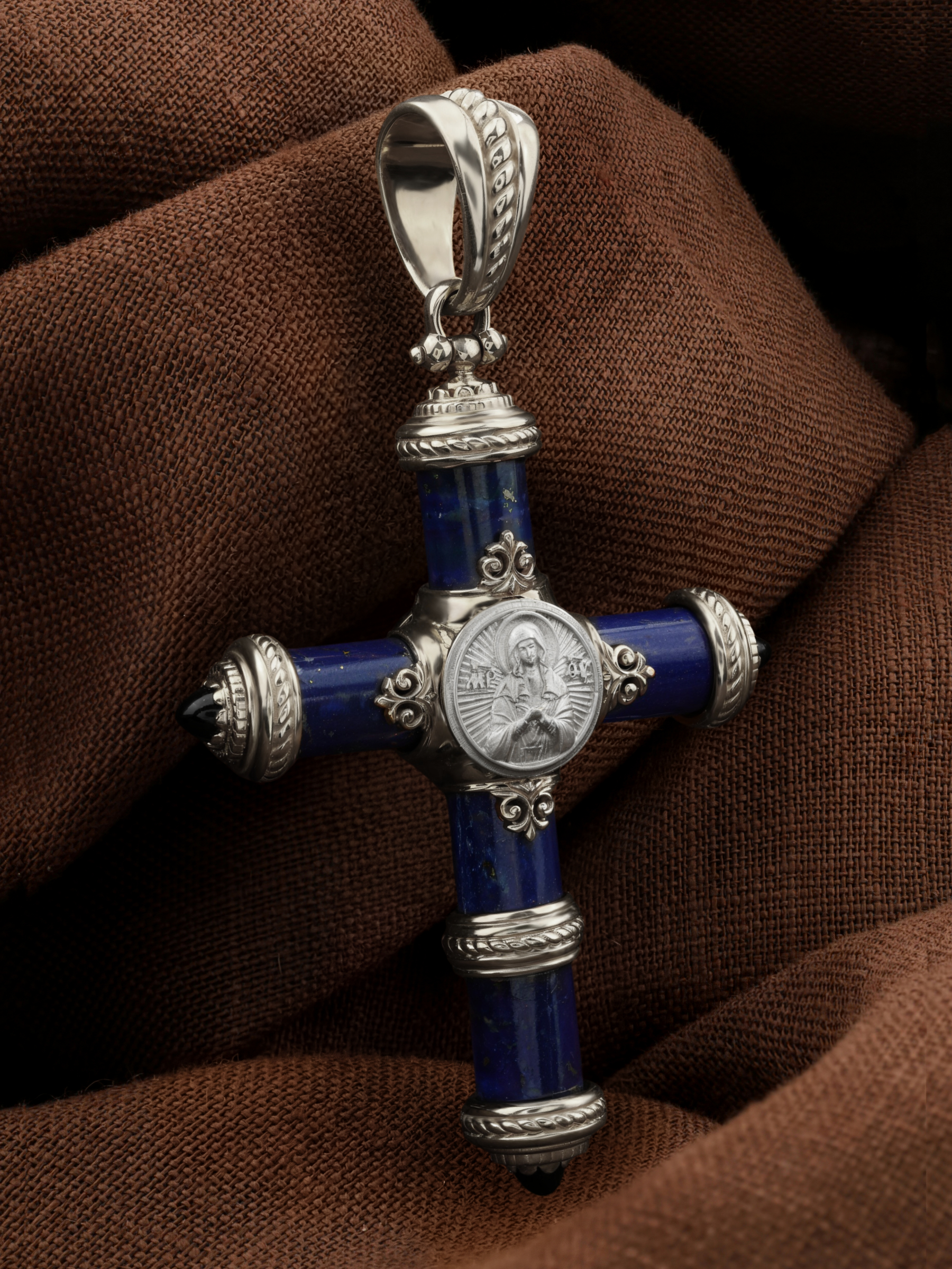 В центральной части лицевой стороны креста изображен Спас Нерукотворный — образ Господа и Спасителя нашего Иисуса Христа, чудесно отпечатавшийся на плате, котором Христос вытер свой лик. Согласно Преданию, изложенному в Четьи Минее, Авгарь V Ухама, больной проказой, послал ко Христу своего архивария Ханнана (Ананию) с письмо, в котором просил Христа прийти в Едессу и исцелить его. Ханнан же был художником, и Авгарь поручил ему, если Спаситель не сможет прийти, то написать хотя бы Его образ и принести ему. Видя, что Ханнан хочет сделать Его портрет, Христос потребовал воды, умылся, вытер Свой лик платом, и на этом плате отпечатался Его образ. Спаситель передал этот плат Ханнану с повелением отнести с ответным письмом пославшему его. Получив портрет, Авгарь исцелился от главного своего недуга, но лицо его оставалось еще поврежденным. После Пятидесятницы в Едессу пошёл святой апостол Фаддей, один из 70-ти, закончил исцеление Авгаря и обратил его в христианство. Авгарь прикрепил образ к доске и поместил в нише над городскими воротами, убрав оттуда находившегося там идола.