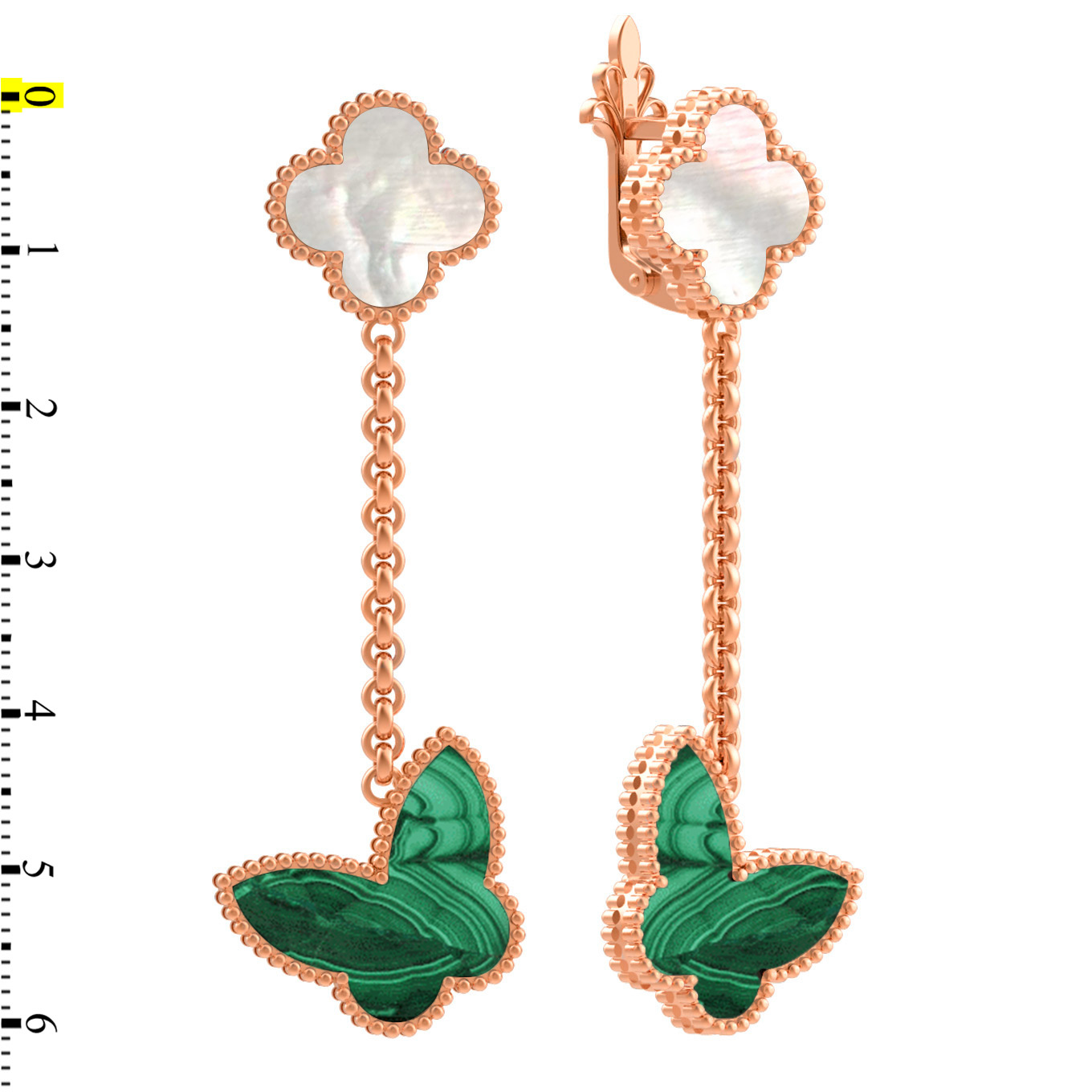 Основу композиции составляет декоративный элемент в форме бабочки, который гармонично дополнен подвесной частью на цепочке. В дизайне использовано две вставки: насыщенный зеленый малахит, который придает украшению глубину, и нежный перламутр, создающий мягкое сияние. Такое сочетание цветов делает серьги ярким, но при этом сдержанным акцентом, уместным как для повседневных, так и для вечерних выходов.