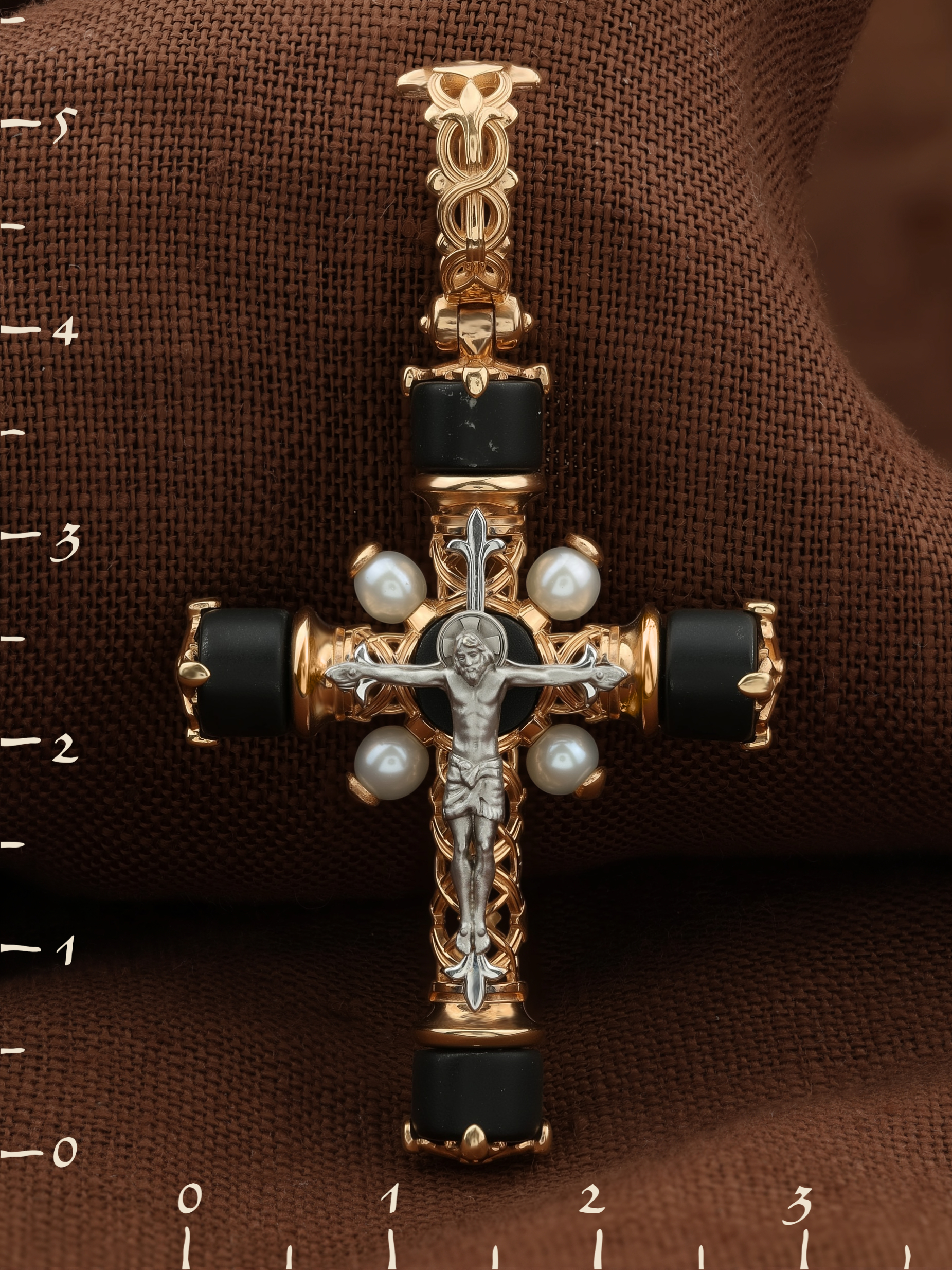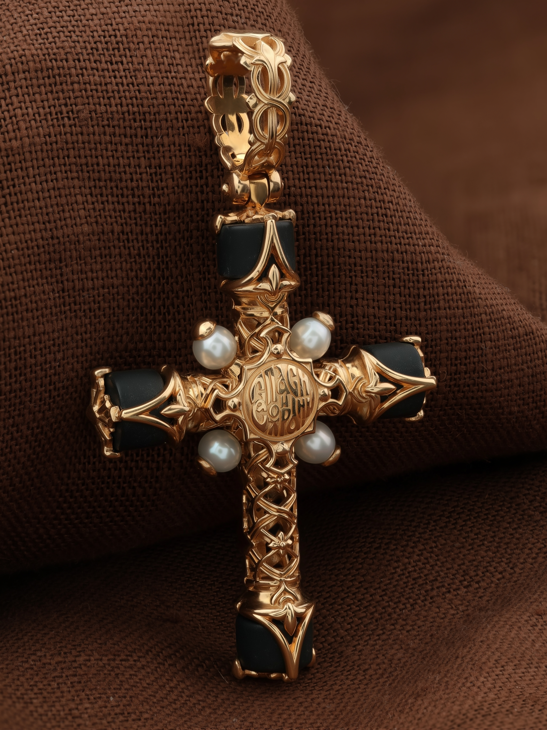 На лицевой стороне креста изображено Распятие Господа и Спасителя нашего Иисуса Христа. Своими крестными страданиями Господь смыл наши грехи, покрыл наш долг перед Богом или, на языке Писания, нас «искупил». В Голгофе сокрыта непостижимая тайна бесконечной правды и любви Бога. Крест стал символом победы добра над злом, жизни над смертью, напоминанием бесконечной Божьей любви, предметом радости. Воплотившийся Сын Божий Своею кровью освятил крест и сделал его проводником Своей благодати, источником освящения верующих. Господь сказал: кто хочет идти за Мною, отвергнись себя, и возьми крест свой, и следуй за Мною. (Мк. 8: 34). На православном кресте Христос не умирает, а свободно простирает руки, ладони Иисуса открыты, будто он хочет обнять все человечество, даря им свою любовь и открывая путь к вечной жизни.