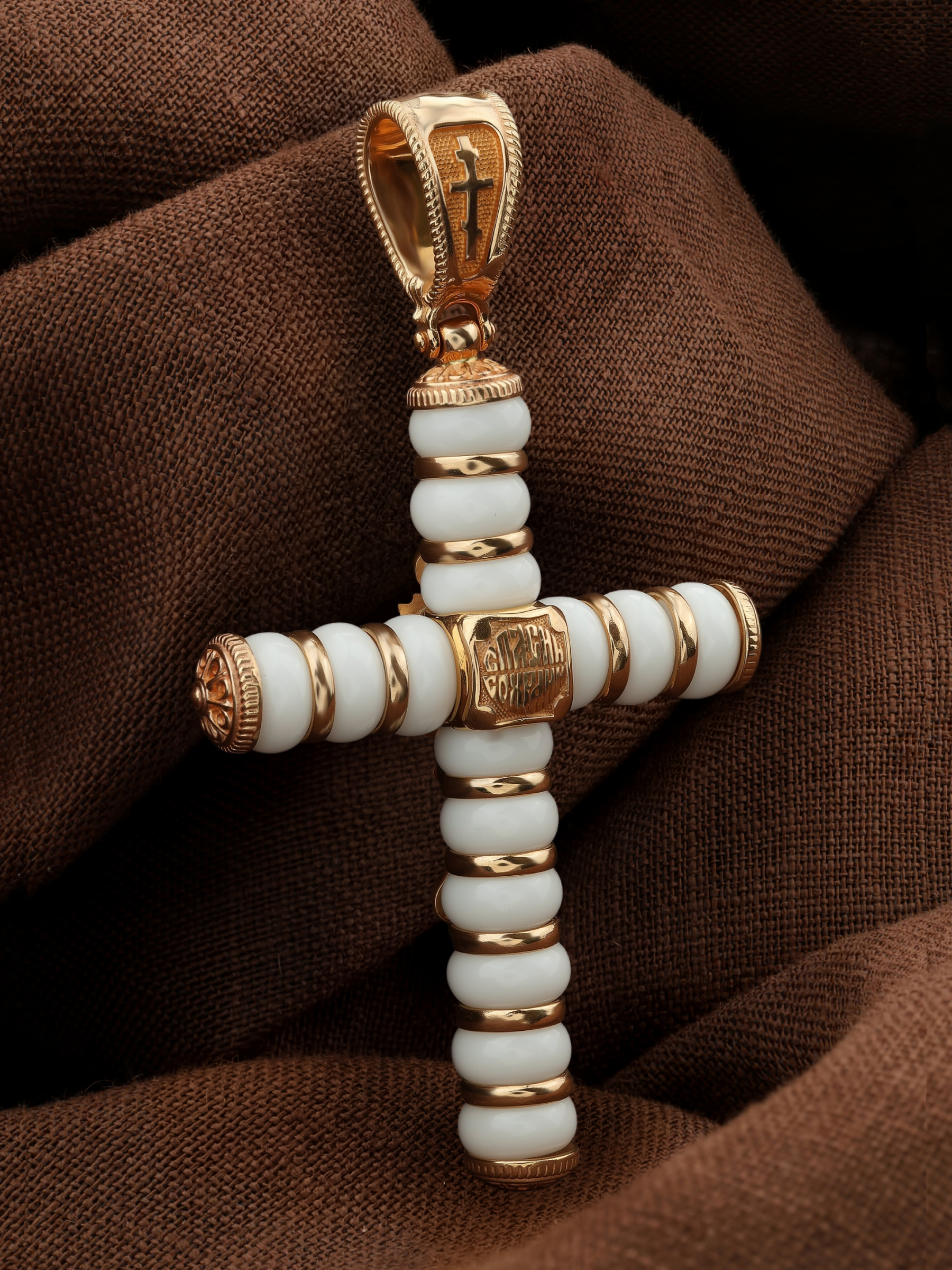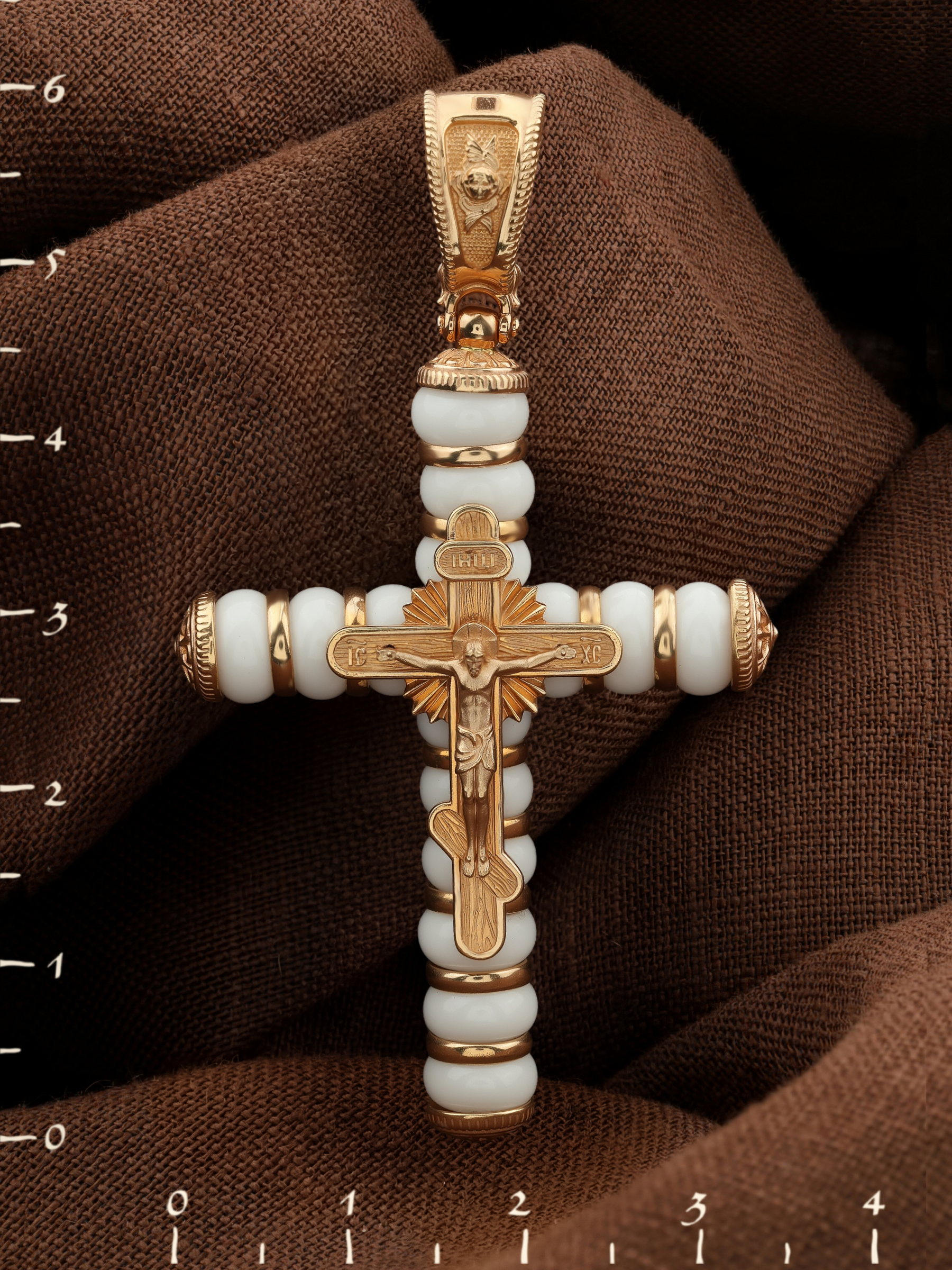 На лицевой стороне креста изображено Распятие Господа и Спасителя нашего Иисуса Христа. Своими крестными страданиями Господь смыл наши грехи, покрыл наш долг перед Богом или, на языке Писания, нас «искупил». В Голгофе сокрыта непостижимая тайна бесконечной правды и любви Бога. Крест стал символом победы добра над злом, жизни над смертью, напоминанием бесконечной Божьей любви, предметом радости. Воплотившийся Сын Божий Своею кровью освятил крест и сделал его проводником Своей благодати, источником освящения верующих. Господь сказал: кто хочет идти за Мною, отвергнись себя, и возьми крест свой, и следуй за Мною. (Мк. 8: 34). На верхней табличке, выше головы Иисуса, расположена надпись, составленная Понтием Пилатом — «IНЦI». Она означает «Иисус Назорей, Царь Иудейский». Надпись «IC» «ХC», означает Иисус Христос, помещается на разных сторонах поперечной перекладины креста. На православном кресте Христос не умирает, а свободно простирает руки, ладони Иисуса открыты, будто он хочет обнять все человечество, даря им свою любовь и открывая путь к вечной жизни. На кулонном кольце изображен шестикрылый Ангел Серафим.