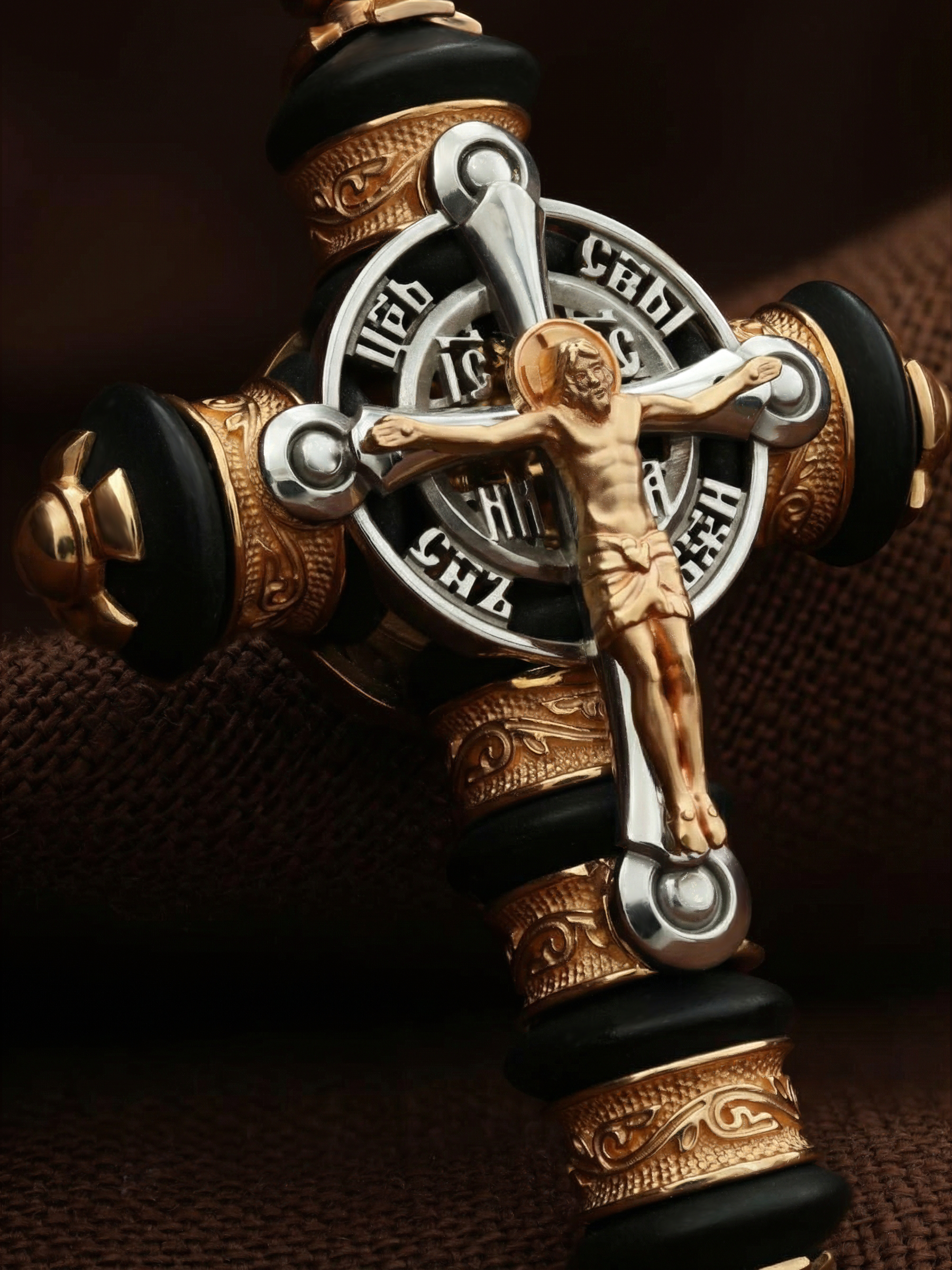 На лицевой стороне креста изображено Распятие Господа и Спасителя нашего Иисуса Христа. Христос, подвергнутый на кресте мучительной казни, своими страданиями искупил нас от древнего греха и даровал нам жизнь вечную. Воплотившийся Сын Божий Своею кровью освятил крест и сделал его проводником Своей благодати, источником освящения верующих. Над вершиной Распятия помещена надпись «Царь Славы». Распятие сопровождается каноническими надписями. Надпись «IС ХС» означает Иисус Христос помещается на разных сторонах поперечной перекладины креста. Рядом помещены надпись –«НИКА», что означает победитель и словосочетание «СЫН БОЖИЙ», что означает божественную природу Иисуса Христа. На православном кресте Христос не умирает, а свободно простирает руки, ладони Иисуса открыты, будто он хочет обнять все человечество, даря им свою любовь и открывая путь к вечной жизни. На кулонном кольце помещен крест Константина — монограмма, известная как «Хи-Ро» («хи» и «ро» — первые две буквы имени Христа по-гречески). Монограмма стала первым общепринятым символом христианства — как знак победы и спасения.