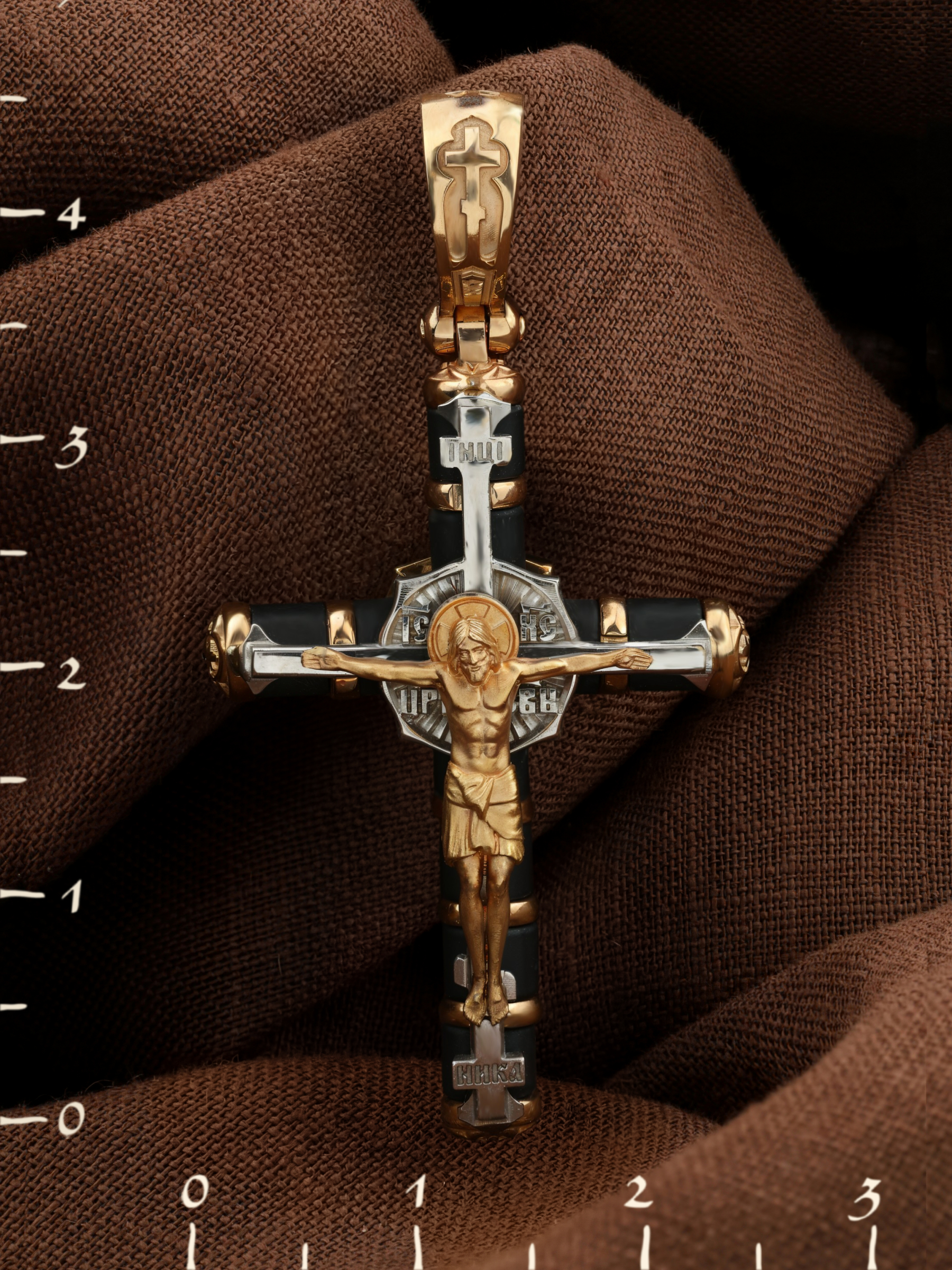 На лицевой стороне креста изображено Распятие Господа и Спасителя нашего Иисуса Христа, отдавшего Себя на смерть, для искупления грехов мира. Крест является символом жертвенной любви всеблагого Бога к падшим людям, всепобеждающим духовным оружием христиан, основанием и средоточием церковной жизни. Верхняя перекладина символизирует титло — табличку, на которой, согласно Евангелию, было начертано: Иисус Назорей Царь Иудейский (IНЦI). Надпись «IС» « ХС» означает Иисус Христос и размещена над поперечной перекладиной. Слева от Распятия изображена Пресвятая Богородица, справа — апостол и евангелист Иоанн Богослов, один из ближайших учеников Иисуса Христа. Возвышение, на котором стоит Крест, символизирует гору Голгофу, на которой произошло Распятие. Под подножием Креста изображена покоящаяся голова (череп) Адама. Под Распятием помещено изображение Духа Святого в виде голубя.