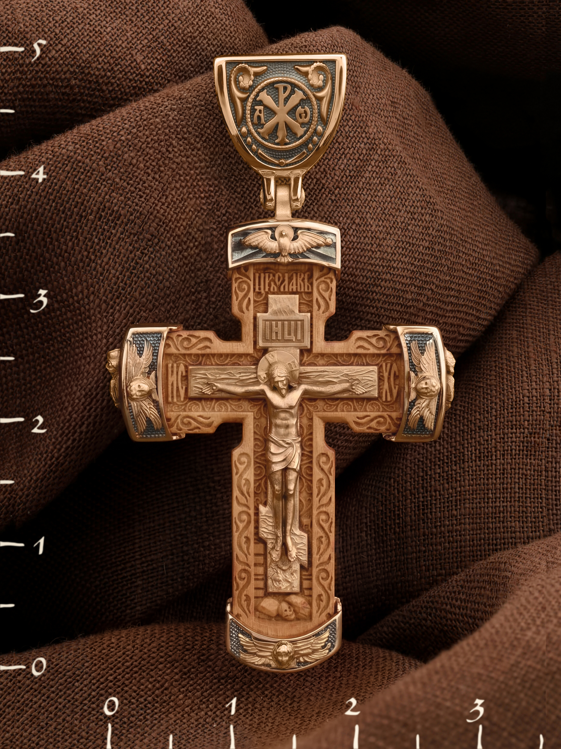 На лицевой стороне креста изображено Распятие, потому что это орудие казни Иисус Христос сделал орудием победы над грехом и смертью. Своими страданиями Он искупил грехи человечества, умерев и сошествовав во ад, победил сатану, освободил души праведников от вечной смерти и открыл им небесные врата рая. Жертва Христа сделала возможным спасение для каждого человека. На православном кресте Христос не умирает, а свободно простирает руки, ладони Иисуса открыты, будто он хочет обнять все человечество, даря им свою любовь и открывая путь к вечной жизни.