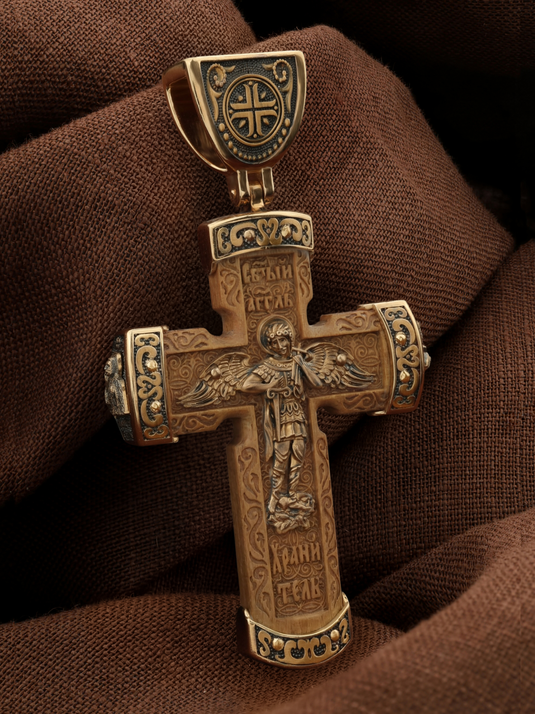 В центре оборота креста изображен Ангела Хранителя с традиционными атрибутами в руках: крестом, которым он осеняет человека, и мечом для прогнания бесов. По Православному учению, каждому, принявшему святое крещение, дается Господом Ангел Хранитель, который сопровождает человека всю его жизнь, помогая в добрых делах и охраняя от нападок злых духов. Святые отцы утверждают, что только верующий человек имеет рядом с собой Ангела Хранителя: «Тем, которые сподобились крещения и возносятся на высоту добродетелей, даны от Бога Ангелы, заботящиеся о них и содействующие им. В этом уверяет нас Господь, когда говорит, что есть Ангелы Хранители у всякого, кто верует в Него» (преп. Анастасий Синаит). Но Ангел Хранитель пребывает с христианином, если только мы не прогоним его греховными делами, поскольку «как дым разгоняет пчел, так и грех прогоняет от нас Ангела Хранителя» (свт. Василий Великий). Но и после завершения земного пути Ангел Хранитель не покидает христианина, а помогает душе преодолеть воздушные мытарства на пути в Царство Небесное.