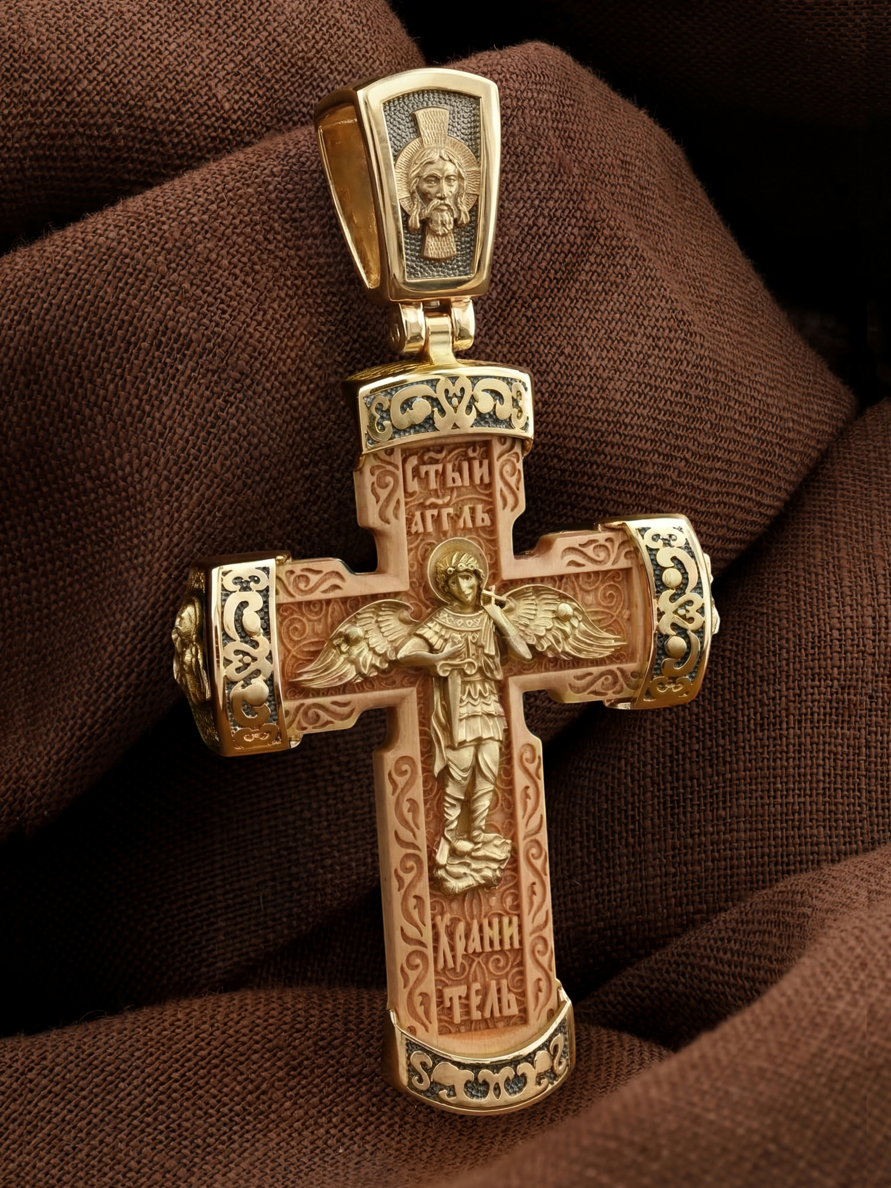 В центре оборота креста изображен Ангела Хранителя с традиционными атрибутами в руках: крестом, которым он осеняет человека, и мечом для прогнания бесов. По Православному учению, каждому, принявшему святое крещение, дается Господом Ангел Хранитель, который сопровождает человека всю его жизнь, помогая в добрых делах и охраняя от нападок злых духов. Святые отцы утверждают, что только верующий человек имеет рядом с собой Ангела Хранителя: «Тем, которые сподобились крещения и возносятся на высоту добродетелей, даны от Бога Ангелы, заботящиеся о них и содействующие им. В этом уверяет нас Господь, когда говорит, что есть Ангелы Хранители у всякого, кто верует в Него» (преп. Анастасий Синаит). Но Ангел Хранитель пребывает с христианином, если только мы не прогоним его греховными делами, поскольку «как дым разгоняет пчел, так и грех прогоняет от нас Ангела Хранителя» (свт. Василий Великий). Но и после завершения земного пути Ангел Хранитель не покидает христианина, а помогает душе преодолеть воздушные мытарства на пути в Царство Небесное.
