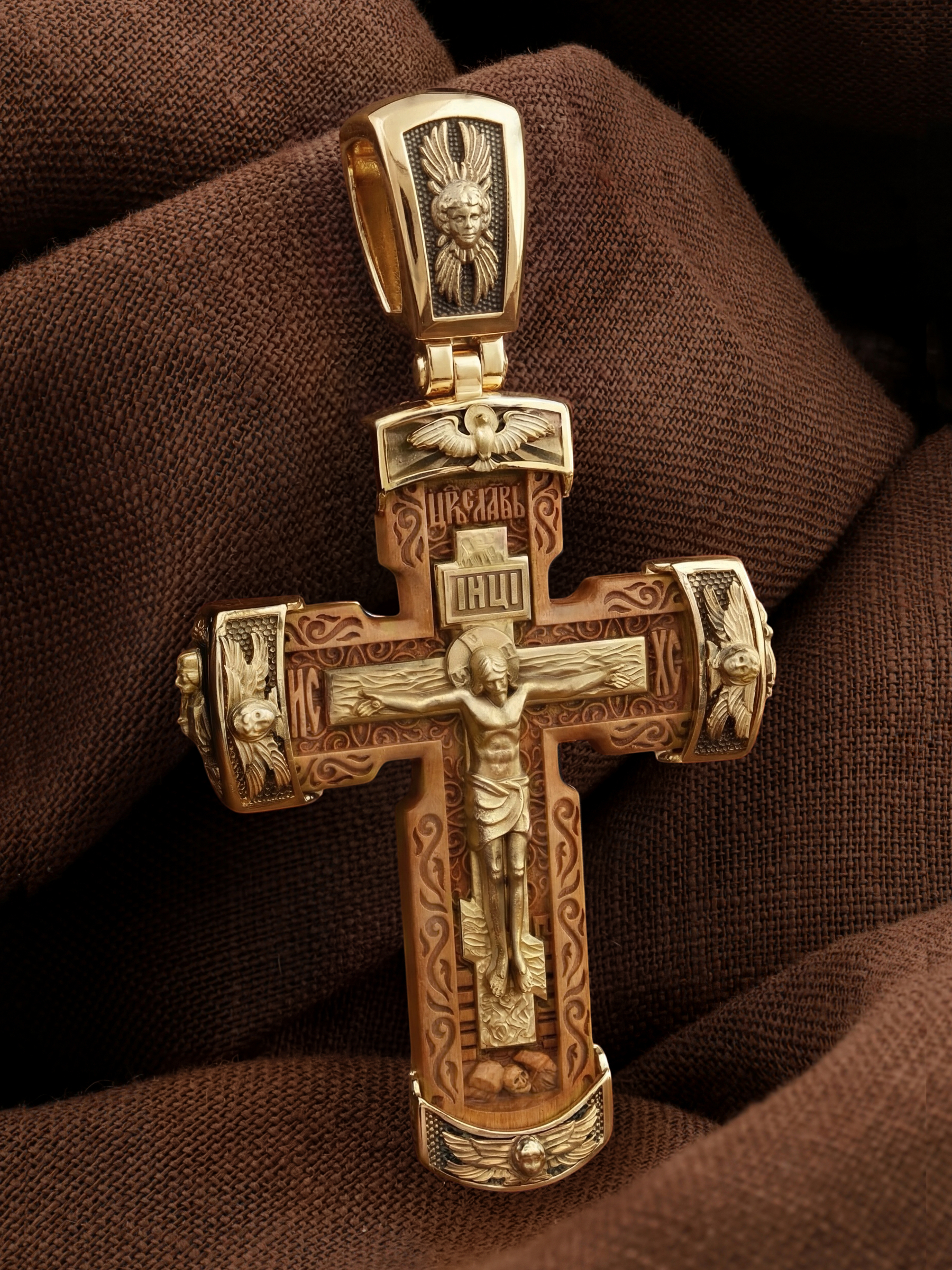 На лицевой стороне креста изображено Распятие, потому что это орудие казни Иисус Христос сделал орудием победы над грехом и смертью. Своими страданиями Он искупил грехи человечества, умерев и сошествовав во ад, победил сатану, освободил души праведников от вечной смерти и открыл им небесные врата рая. Жертва Христа сделала возможным спасение для каждого человека. На православном кресте Христос не умирает, а свободно простирает руки, ладони Иисуса открыты, будто он хочет обнять все человечество, даря им свою любовь и открывая путь к вечной жизни.