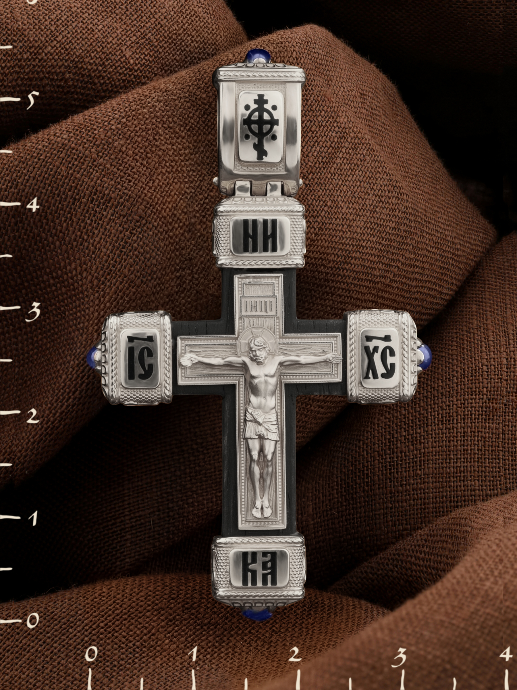 Крест из белого золота c эмалью, сапфиром и эбеновым деревом