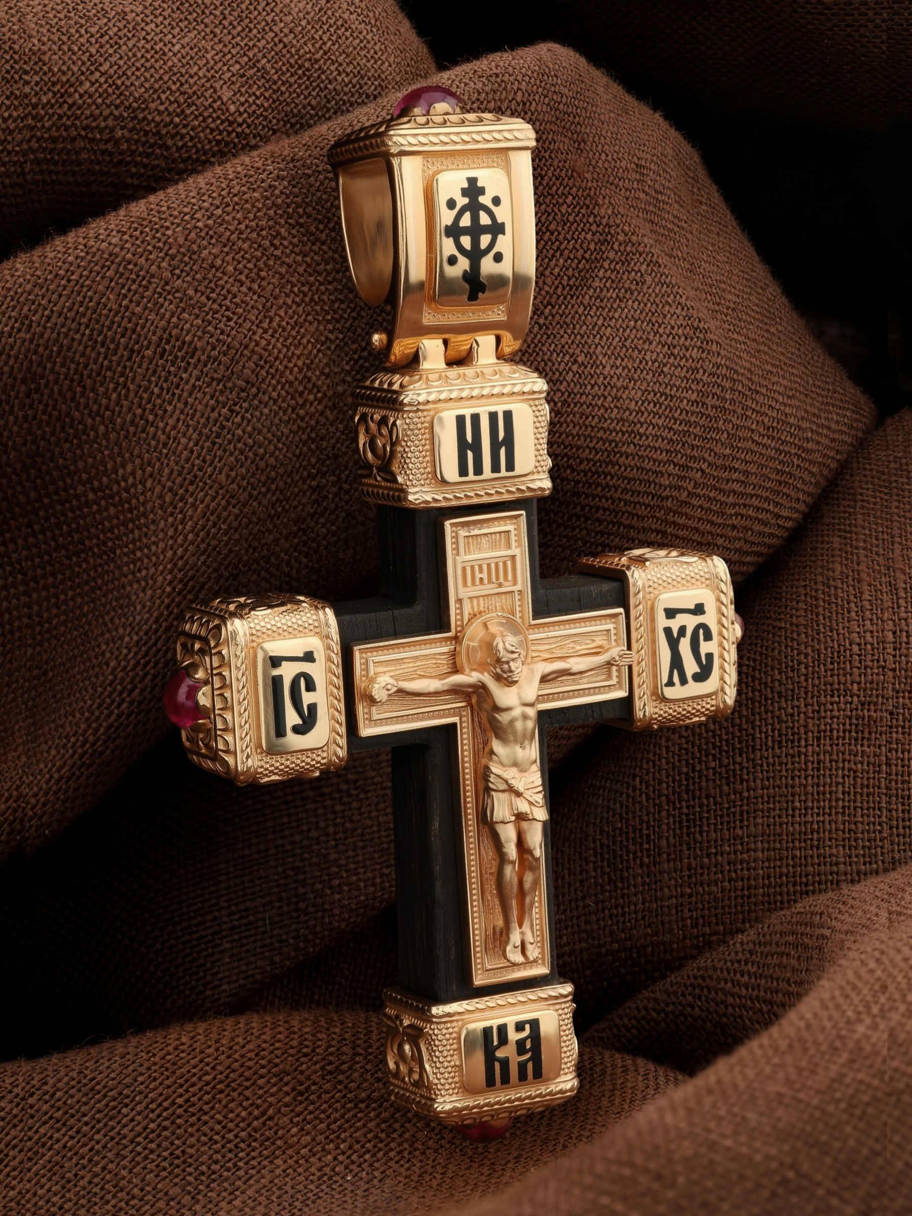 Крест из золота c эмалью, рубином и эбеновым деревом