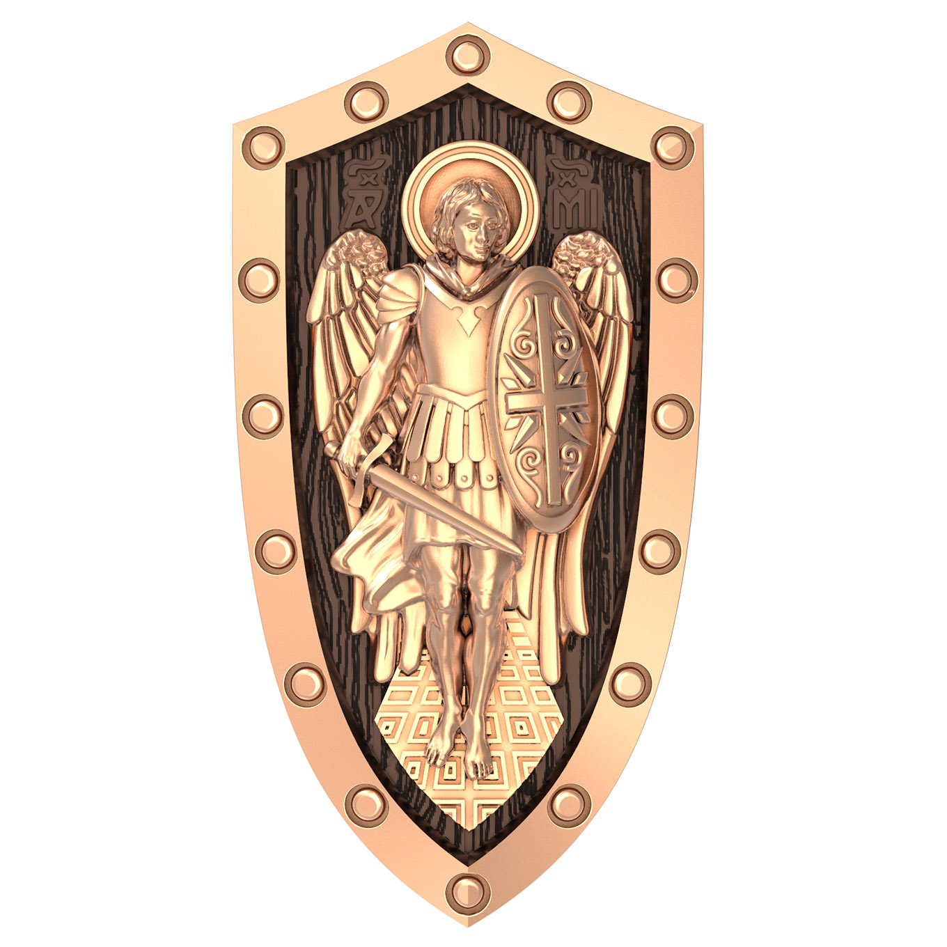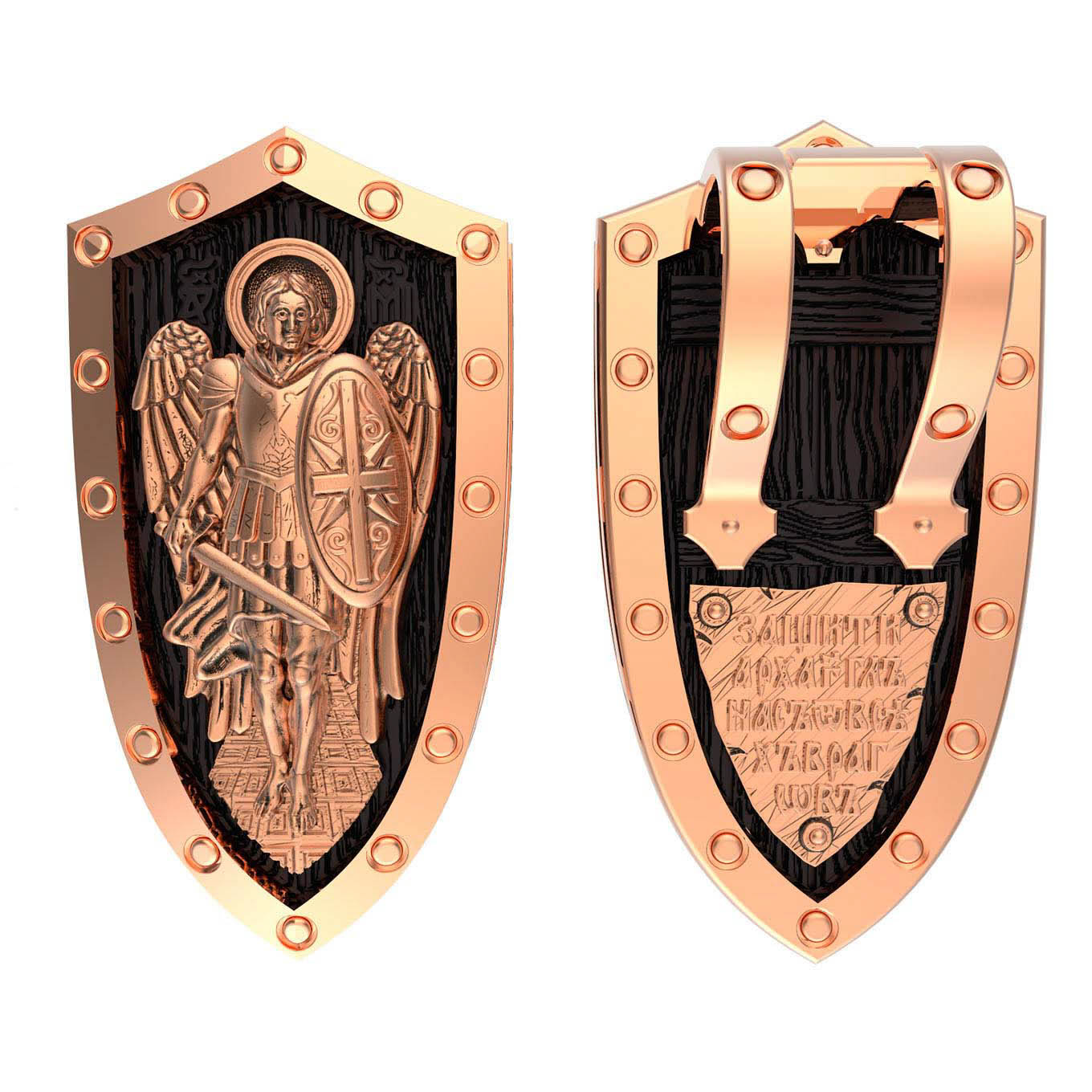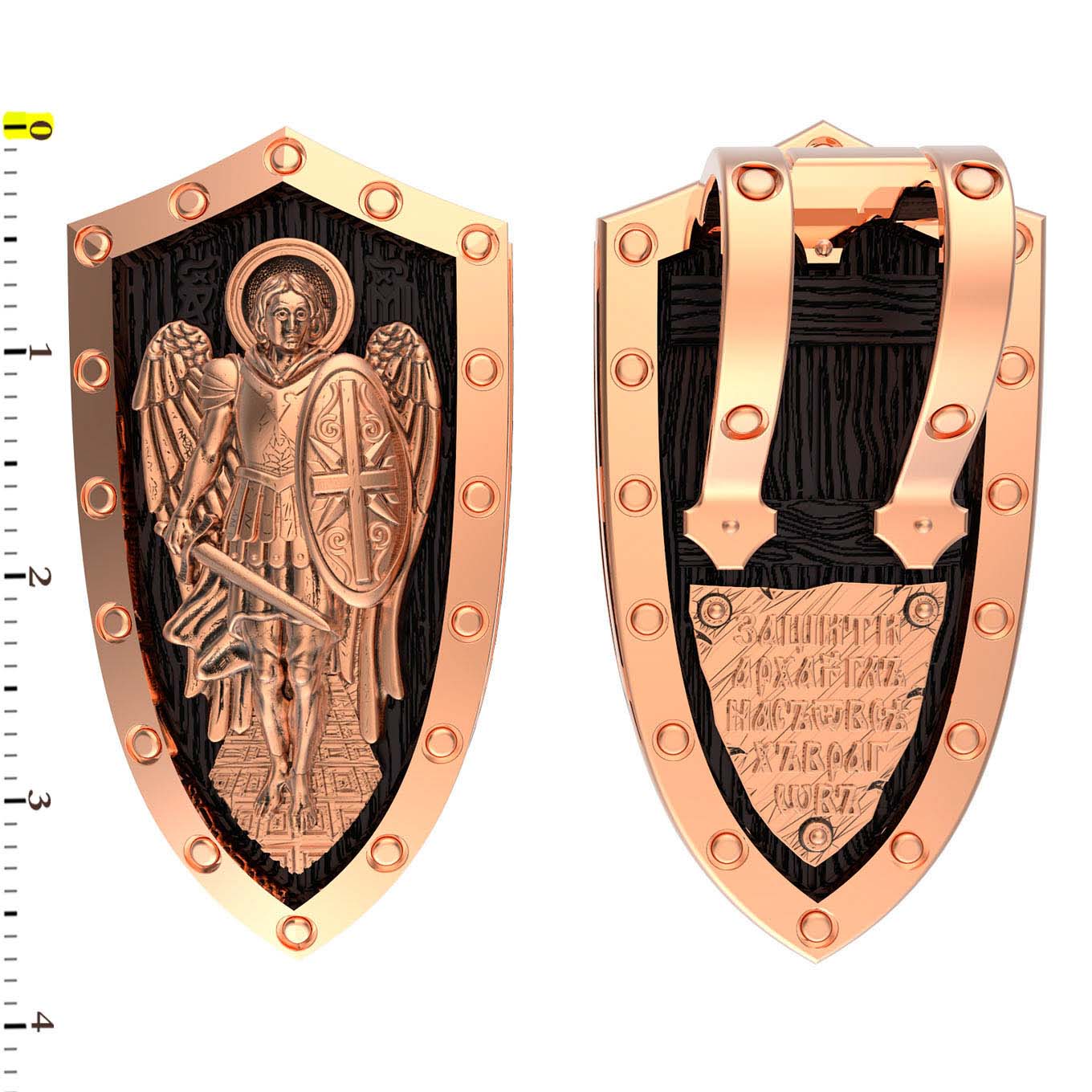 На лицевой стороне образка изображение Архангела Михаила — верного служителя Божия, который низринул с Неба возгордившегося денницу с другими павшими духами. В Православии его называют Архистратигом, что означает глава святого воинства Ангелов и Архангелов. Образок сделан в виде воинского щита. Архангел Михаил изображен в воинственном виде с огненным мечом в правой руке и щитом в левой. Архангел почитается как покровитель воинов и всех верных Богу и ведущих борьбу против сил зла, борец против ересей, а также защитник душ умерших, страж райских врат. С древних времен прославлен своими чудесами Архангел Михаил на Руси. Примеров явления и помощи Архистратига Михаила в русской истории бессчетно. Архангел Михаил не перестает ратоборствовать за славу Творца и Господа всяческих, за дело спасения рода человеческого, за церковь и чад ее. И, согласно, Откровению Иоанна Богослова во время последней битвы небесных и дьявольских сил Михаил и его ангелы опять низвергнут Люцифера вместе с его войском: «Михаил и Ангелы его воевали против дракона, и дракон и ангелы его воевали [против них], но не устояли, и не нашлось уже для них места на небе. И низвержен был великий дракон, древний змий, называемый диаволом и сатаною, обольщающий всю вселенную, низвержен на землю, и ангелы его низвержены с ним» (Откр.12:7−9).