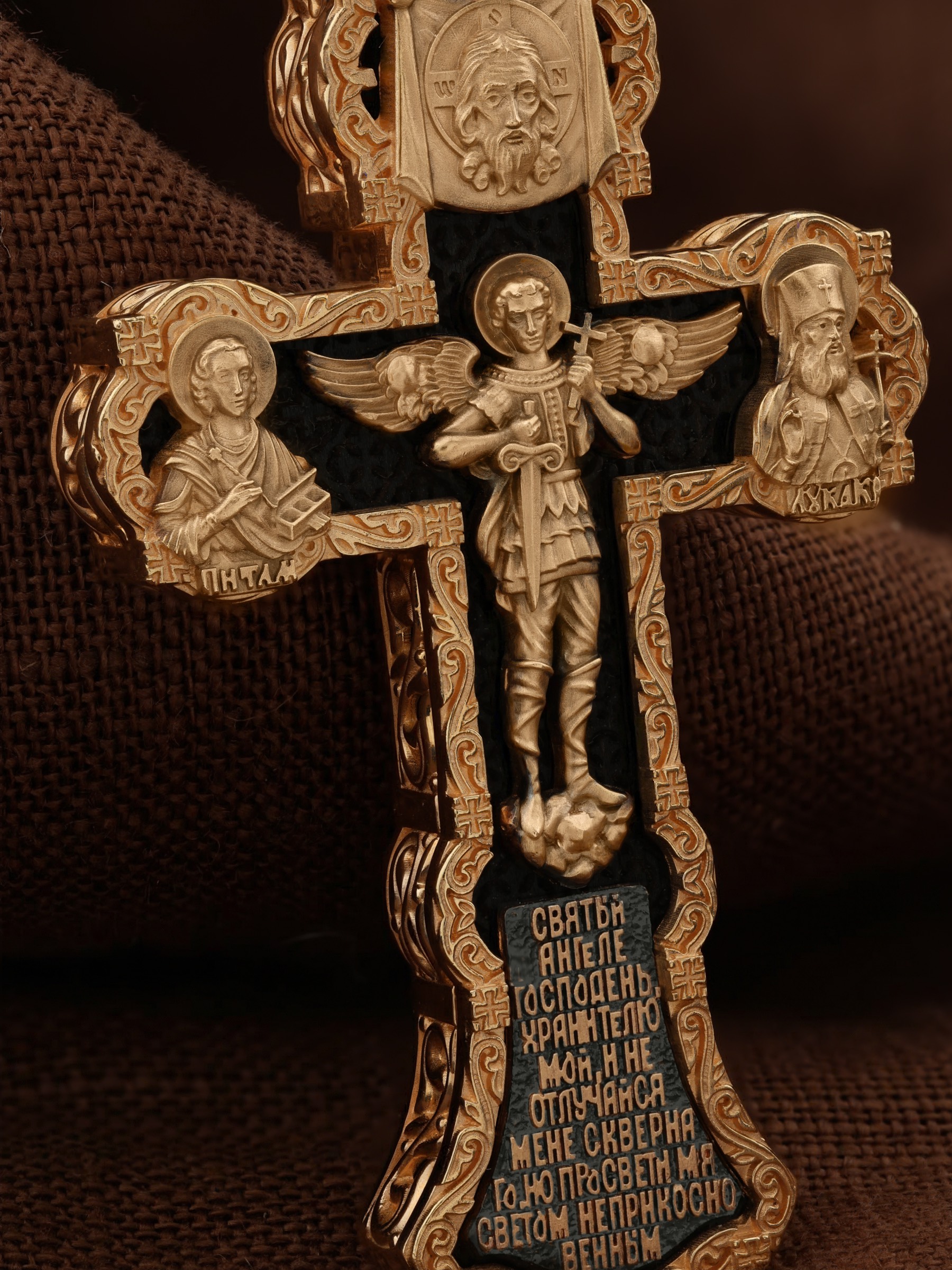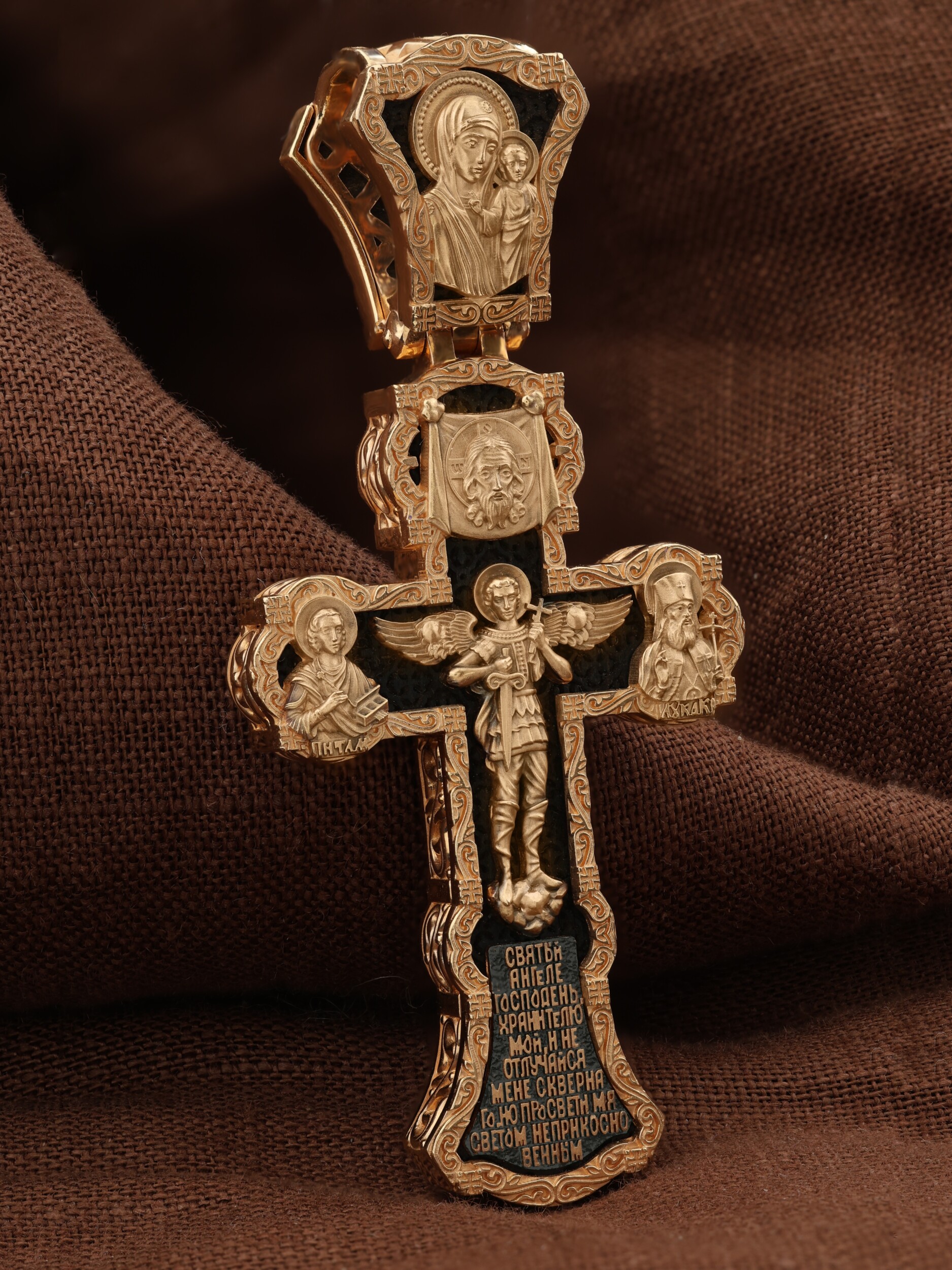 На центральной части оборотной стороны креста изображен Святой Ангел-Хранитель в виде прекрасного юноши держащего в правой руке крест, а в левой — мечь. Ангел-Хранитель — это Ангел приставляемый Богом к человеку при крещении для охраны и помощи в добрых делах. Невидимо пребывая при нас постоянно, он, руководствуя нас ко спасению, не только по нашему желанию таинственно наставляет нас на все доброе и полезное, не только возносит наши молитвы к Богу, но еще и сам от себя охраняют и защищают нас от врагов видимых и невидимых и ходатайствует за нас пред Богом. Ниже образа написана молитва: «Святый Ангеле Господень, Хранитель мой, не отлучайся мене скверного, но просвети мя светом неприкосновенным.» Выше образа изображен Спас Нерукотворный — образ Господа и Спасителя нашего Иисуса Христа, чудесно отпечатавшийся на плате, котором Христос вытер свой лик. Слева — Свя¬той ве¬ли¬ко¬му¬че¬ник и це¬ли¬тель Пан¬те-ле¬и¬мон. Господь даровал удивительную силу его молитве. Ею он исцелял любые болезни, воскрешал мертвых. Справа — Святитель Лука (Войно-Ясенецкий). На кулонном кольце изображена Казанская икона Божией Матери — одна из самых любимых на Руси.