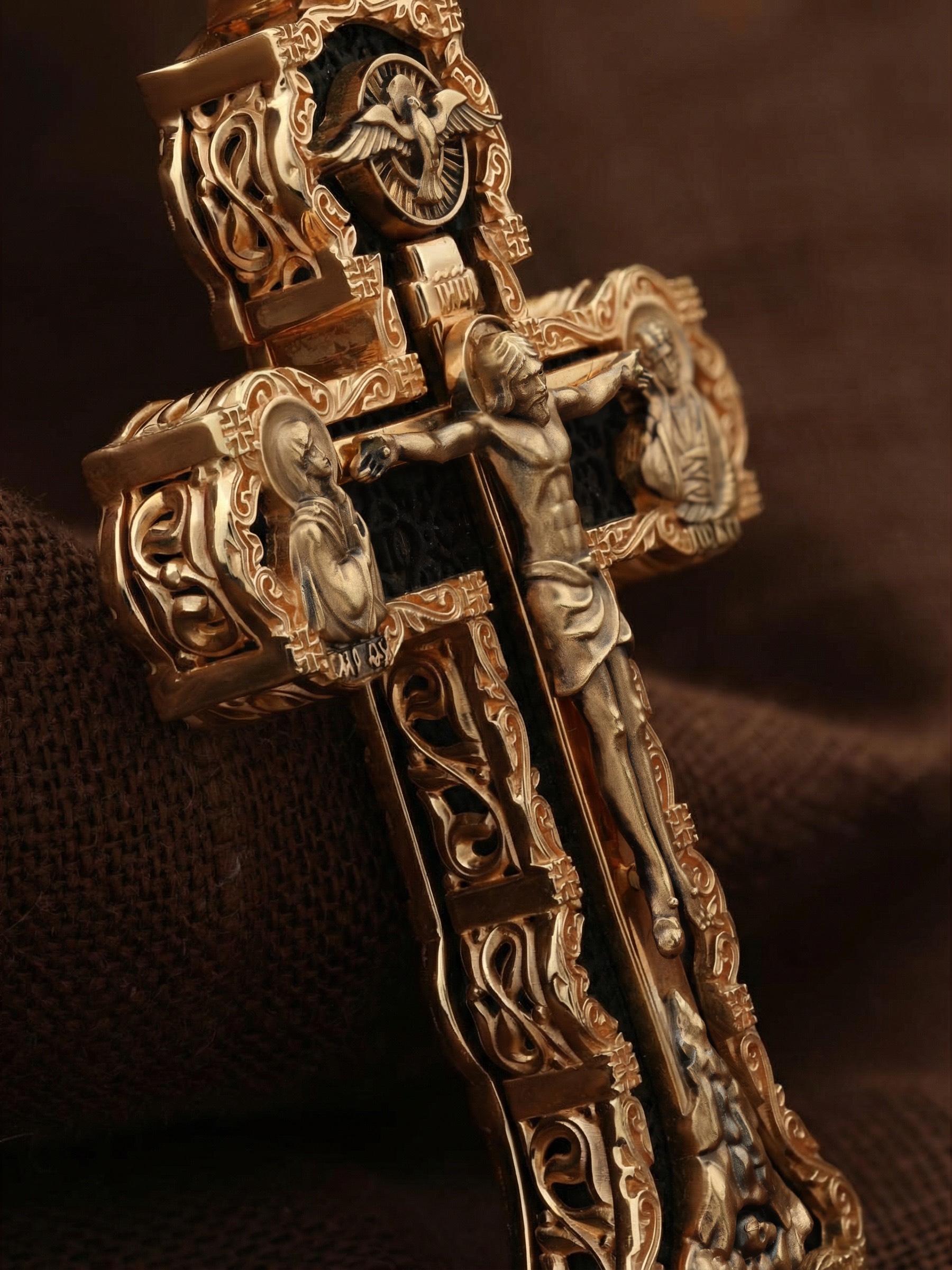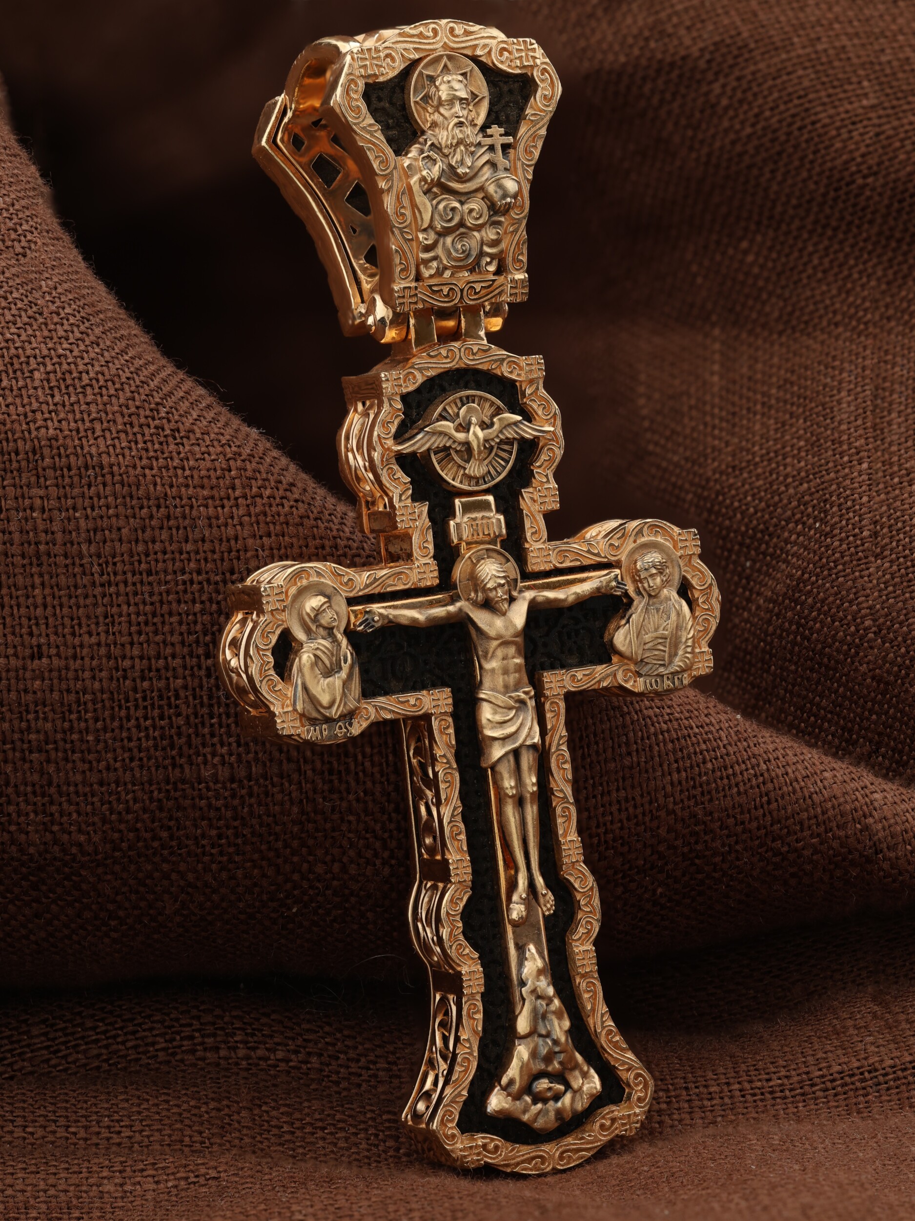 На лицевой стороне креста изображено Распятие Господа и Спасителя нашего Иисуса Христа. Христос, подвергнутый на кресте мучительной казни, своими страданиями искупил нас от древнего греха и даровал нам жизнь вечную. Без Распятия не было бы Воскресения Христова, и поэтому Крест из орудия казни обратился в святыню, в которой действует Благодать Божия. Через крестную жертву Бог раскрывает нам Свою безмерную любовь и призывает к ответной любви. На верхней табличке, выше головы Иисуса, расположена надпись, составленная Понтием Пилатом на трех языках — «IНЦI». Она означает «Иисус Назорей, Царь Иудейский». Надпись «IС ХС» означает Иисус Христос и помещается на разных сторонах поперечной (большой) перекладины креста. Крест стоит на горе камней, символизирующих Голгофу. В ее основании различается череп– это голова Адама. У Креста стоят оплакивающие Господа Божия Матерь и апостол Иоанн Богослов. Из всех апостолов об одном лишь Иоанне Богослове говорится, что он стоял на Голгофе у креста Спасителя, не заботясь о собственной безопасности. Он услышал обращенные к Ней с высоты Креста слова Распятого Господа: «Жено, се сын Твой» и к нему: «Се Мати твоя». С этого времени Иоанн взял Матерь Божию к себе, и Она жила в его доме до самой смерти. Над Распятием — изображение Духа Святого в виде голубя, сходящего с Небес. На кулонном кольце изображен Бог Отец.