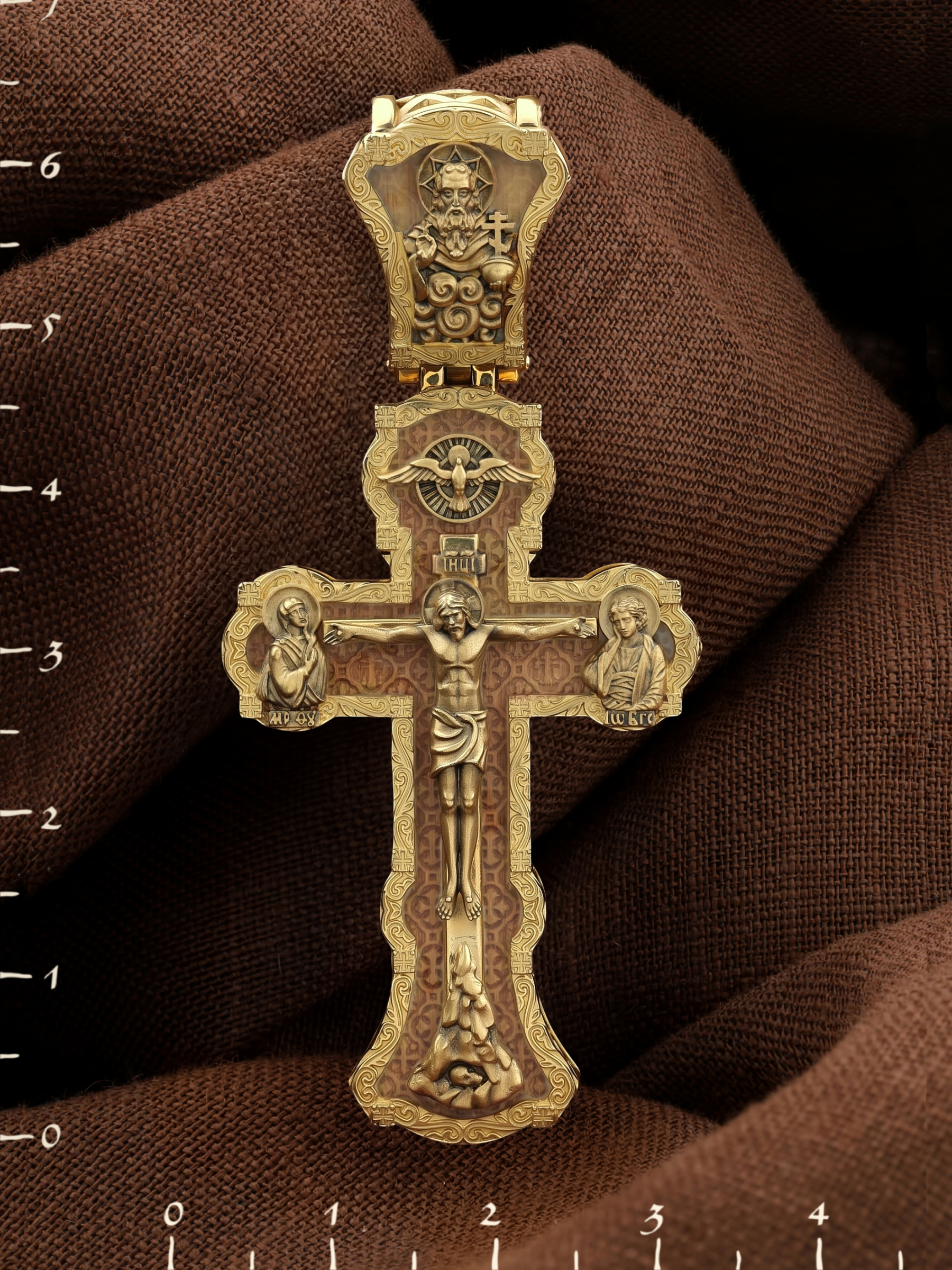 На лицевой стороне креста изображено Распятие Господа и Спасителя нашего Иисуса Христа. Христос, подвергнутый на кресте мучительной казни, своими страданиями искупил нас от древнего греха и даровал нам жизнь вечную. Без Распятия не было бы Воскресения Христова, и поэтому Крест из орудия казни обратился в святыню, в которой действует Благодать Божия. Через крестную жертву Бог раскрывает нам Свою безмерную любовь и призывает к ответной любви. На верхней табличке, выше головы Иисуса, расположена надпись, составленная Понтием Пилатом на трех языках — «IНЦI». Она означает «Иисус Назорей, Царь Иудейский». Надпись «IС ХС» означает Иисус Христос и помещается на разных сторонах поперечной (большой) перекладины креста. Крест стоит на горе камней, символизирующих Голгофу. В ее основании различается череп– это голова Адама. У Креста стоят оплакивающие Господа Божия Матерь и апостол Иоанн Богослов. Из всех апостолов об одном лишь Иоанне Богослове говорится, что он стоял на Голгофе у креста Спасителя, не заботясь о собственной безопасности. Он услышал обращенные к Ней с высоты Креста слова Распятого Господа: «Жено, се сын Твой» и к нему: «Се Мати твоя». С этого времени Иоанн взял Матерь Божию к себе, и Она жила в его доме до самой смерти. Над Распятием — изображение Духа Святого в виде голубя, сходящего с Небес. На кулонном кольце изображен Бог Отец.