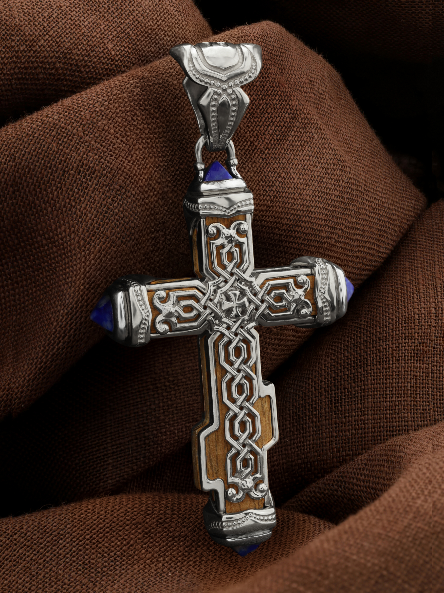 На лицевой стороне креста изображено Распятие Господа и Спасителя нашего Иисуса Христа. Своими крестными страданиями Господь смыл наши грехи, покрыл наш долг перед Богом или, на языке Писания, нас «искупил». В Голгофе сокрыта непостижимая тайна бесконечной правды и любви Бога. Крест стал символом победы добра над злом, жизни над смертью, напоминанием бесконечной Божьей любви, предметом радости. Воплотившийся Сын Божий Своею кровью освятил крест и сделал его проводником Своей благодати, источником освящения верующих. На верхней табличке, выше головы Иисуса, расположена надпись, составленная Понтием Пилатом — «IНЦI». Она означает «Иисус Назорей, Царь Иудейский». Надпись «IC» «ХC», означает Иисус Христос, помещаются на разных сторонах поперечной перекладины креста. Христос в Своей Божественной любви, над которой смерть не властна и которая, страдая, и не страдает в обычном смысле, простирает к людям со Креста Свои объятия, в которые призывается и привлекается весь мир. Поэтому Тело Его не висит, а торжественно покоится на Кресте.