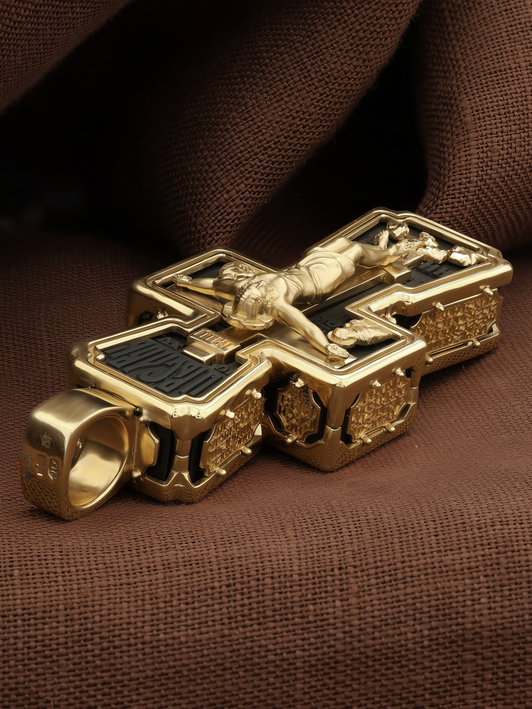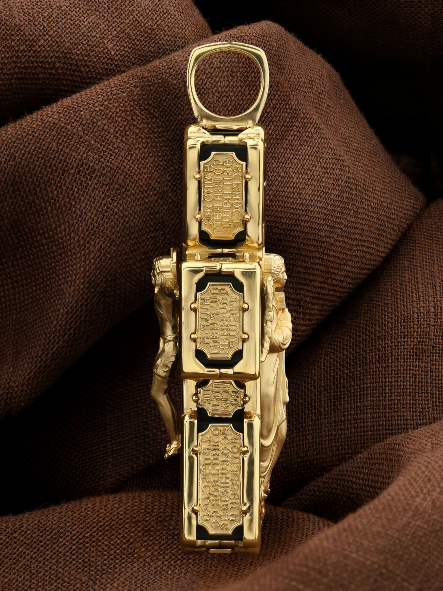 На лицевой стороне креста изображено Распятие Господа и Спасителя нашего Иисуса Христа. В Голгофе сокрыта непостижимая тайна бесконечной правды и любви Бога. Крест стал символом победы добра над злом, жизни над смертью, напоминанием бесконечной Божьей любви, предметом радости. Воплотившийся Сын Божий Своею кровью освятил крест и сделал его проводником Своей благодати, источником освящения верующих. Господь сказал: кто хочет идти за Мною, отвергнись себя, и возьми крест свой, и следуй за Мною. (Мк. 8: 34). Над Распятием помещена надпись «Царь Славы». Ниже расположена надпись «IC» «ХC», означает Иисус Христос. Слева от Распятия изображена Пресвятая Богородица, справа — апостол и евангелист Иоанн Богослов, один из ближайших учеников Иисуса Христа. В нижней части креста помещено слово «НИКА», что означает «победитель». Крест стоит на горе камней, символизирующих Голгофу. В ее основании различается череп — это голова Адама.