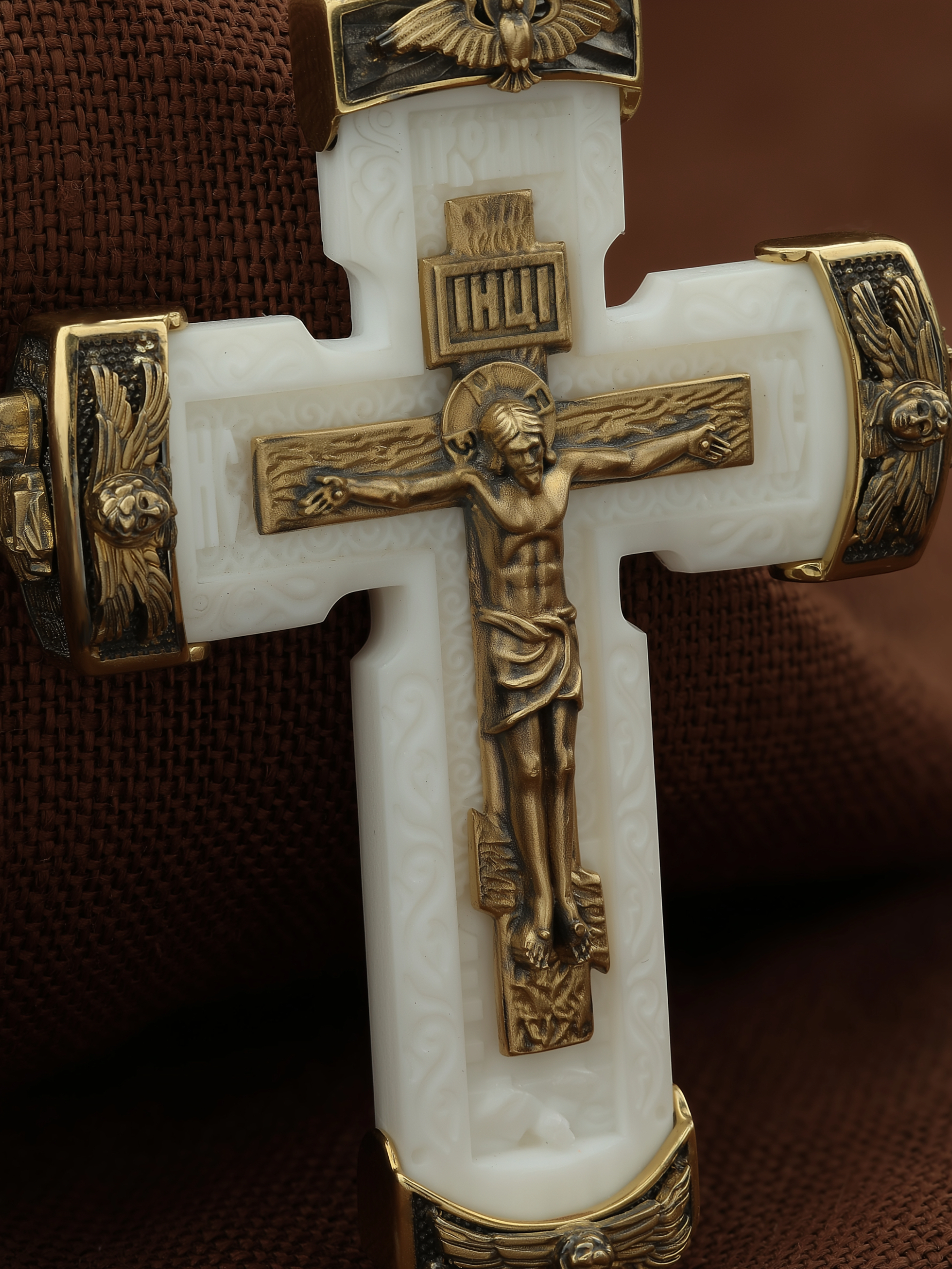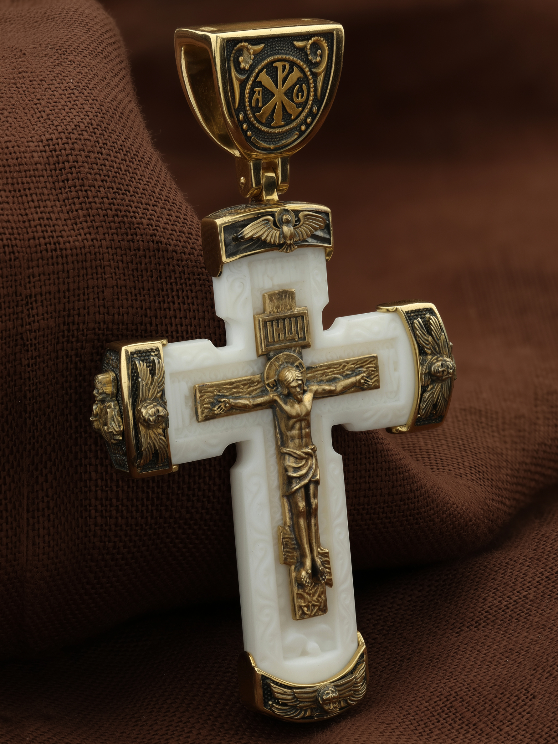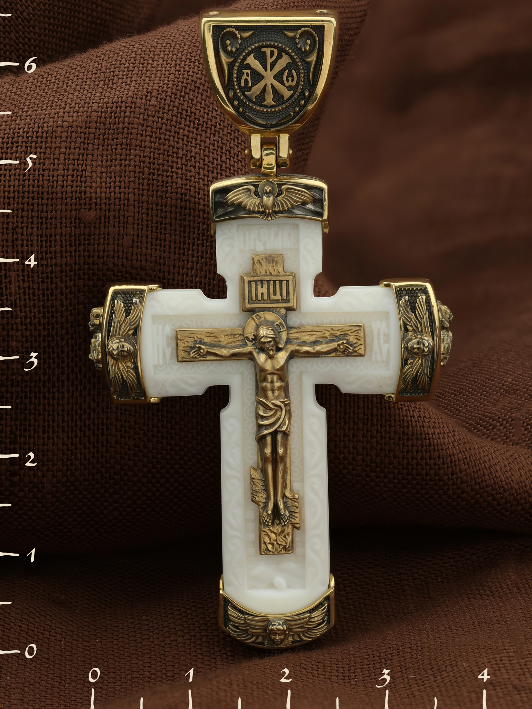 На лицевой стороне креста изображено Распятие, потому что это орудие казни Иисус Христос сделал орудием победы над грехом и смертью. Своими страданиями Он искупил грехи человечества, умерев и сошествовав во ад, победил сатану, освободил души праведников от вечной смерти и открыл им небесные врата рая. Жертва Христа сделала возможным спасение для каждого человека. На православном кресте Христос не умирает, а свободно простирает руки, ладони Иисуса открыты, будто он хочет обнять все человечество, даря им свою любовь и открывая путь к вечной жизни.