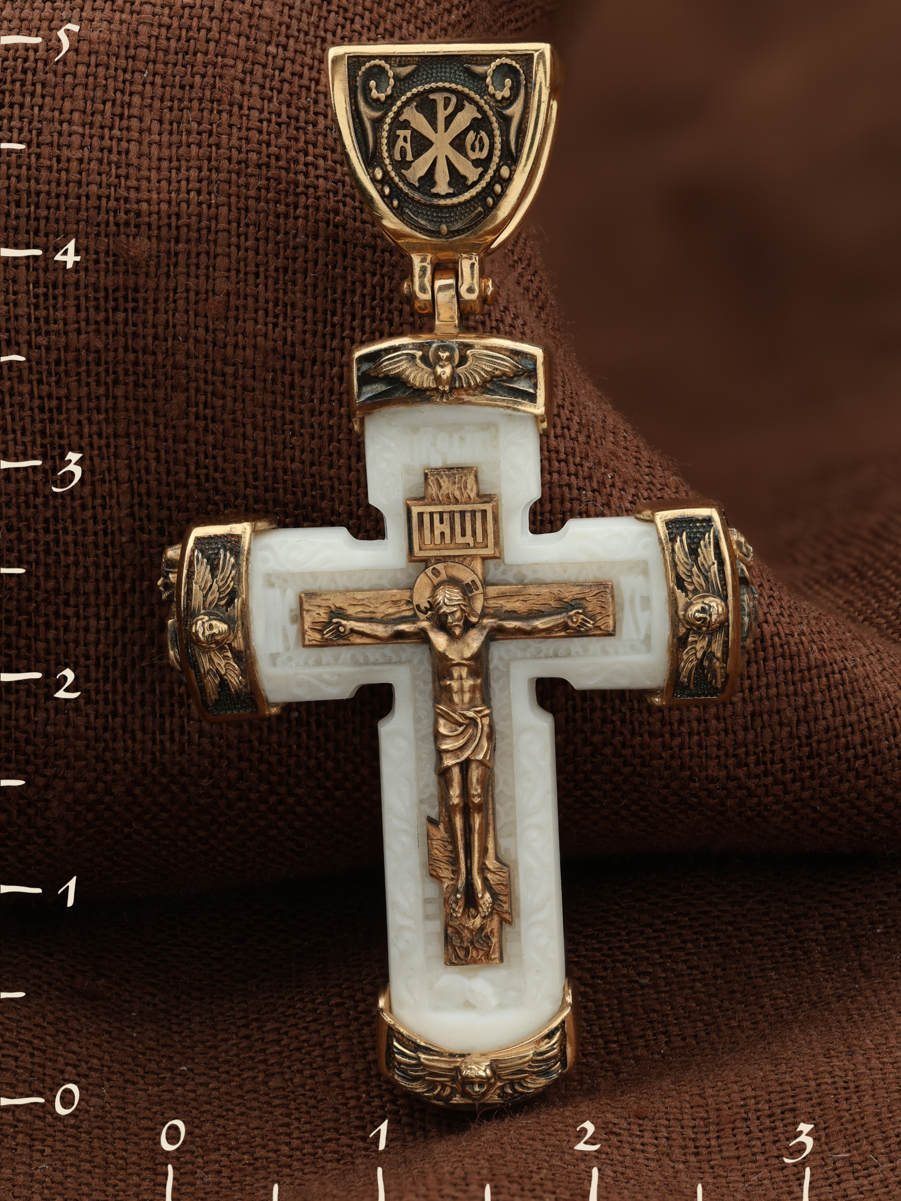 В центре оборота креста изображен Ангела Хранителя с традиционными атрибутами в руках: крестом, которым он осеняет человека, и мечом для прогнания бесов. По Православному учению, каждому, принявшему святое крещение, дается Господом Ангел Хранитель, который сопровождает человека всю его жизнь, помогая в добрых делах и охраняя от нападок злых духов. Святые отцы утверждают, что только верующий человек имеет рядом с собой Ангела Хранителя: «Тем, которые сподобились крещения и возносятся на высоту добродетелей, даны от Бога Ангелы, заботящиеся о них и содействующие им. В этом уверяет нас Господь, когда говорит, что есть Ангелы Хранители у всякого, кто верует в Него» (преп. Анастасий Синаит). Но Ангел Хранитель пребывает с христианином, если только мы не прогоним его греховными делами, поскольку «как дым разгоняет пчел, так и грех прогоняет от нас Ангела Хранителя» (свт. Василий Великий). Но и после завершения земного пути Ангел Хранитель не покидает христианина, а помогает душе преодолеть воздушные мытарства на пути в Царство Небесное.