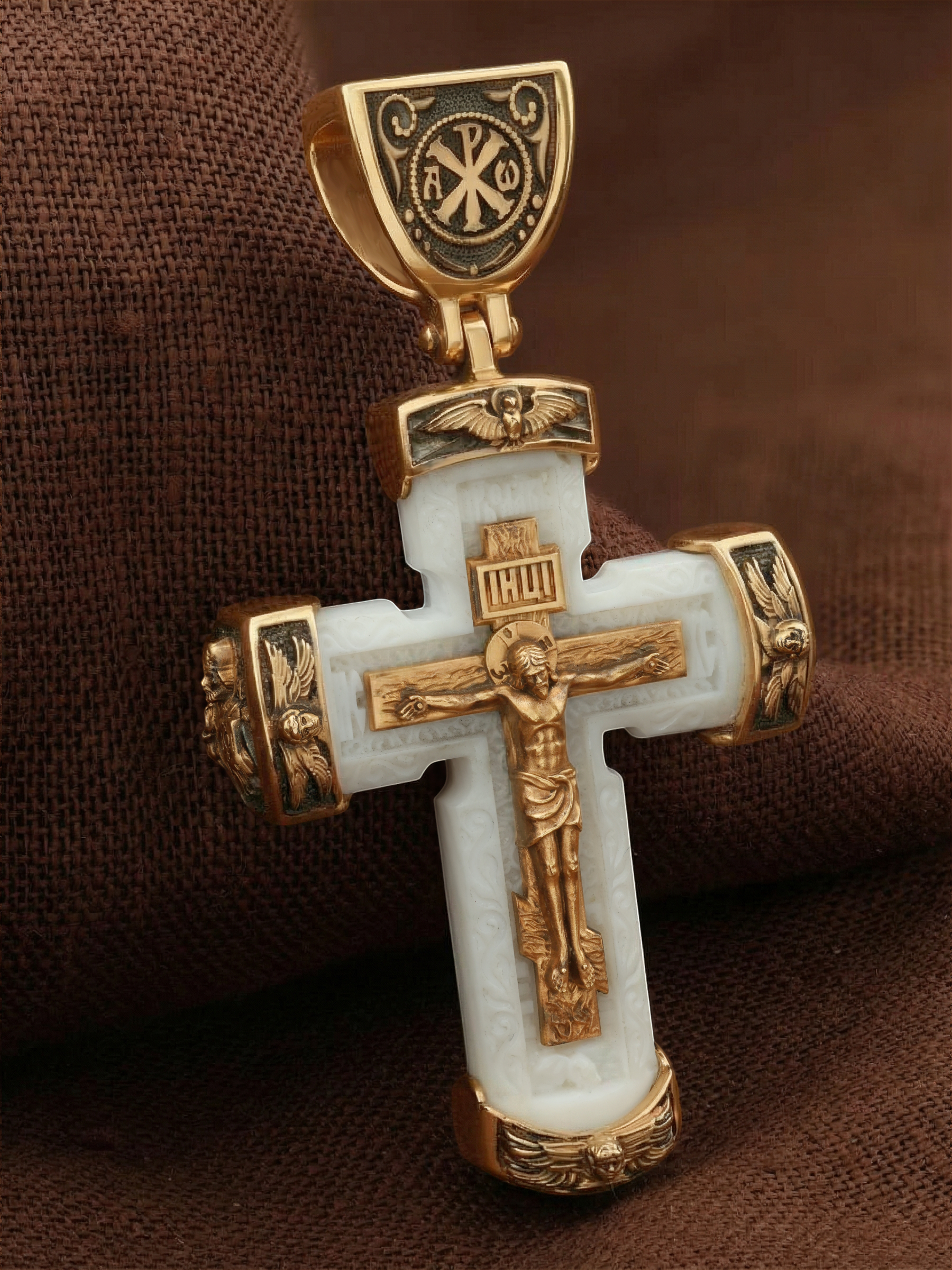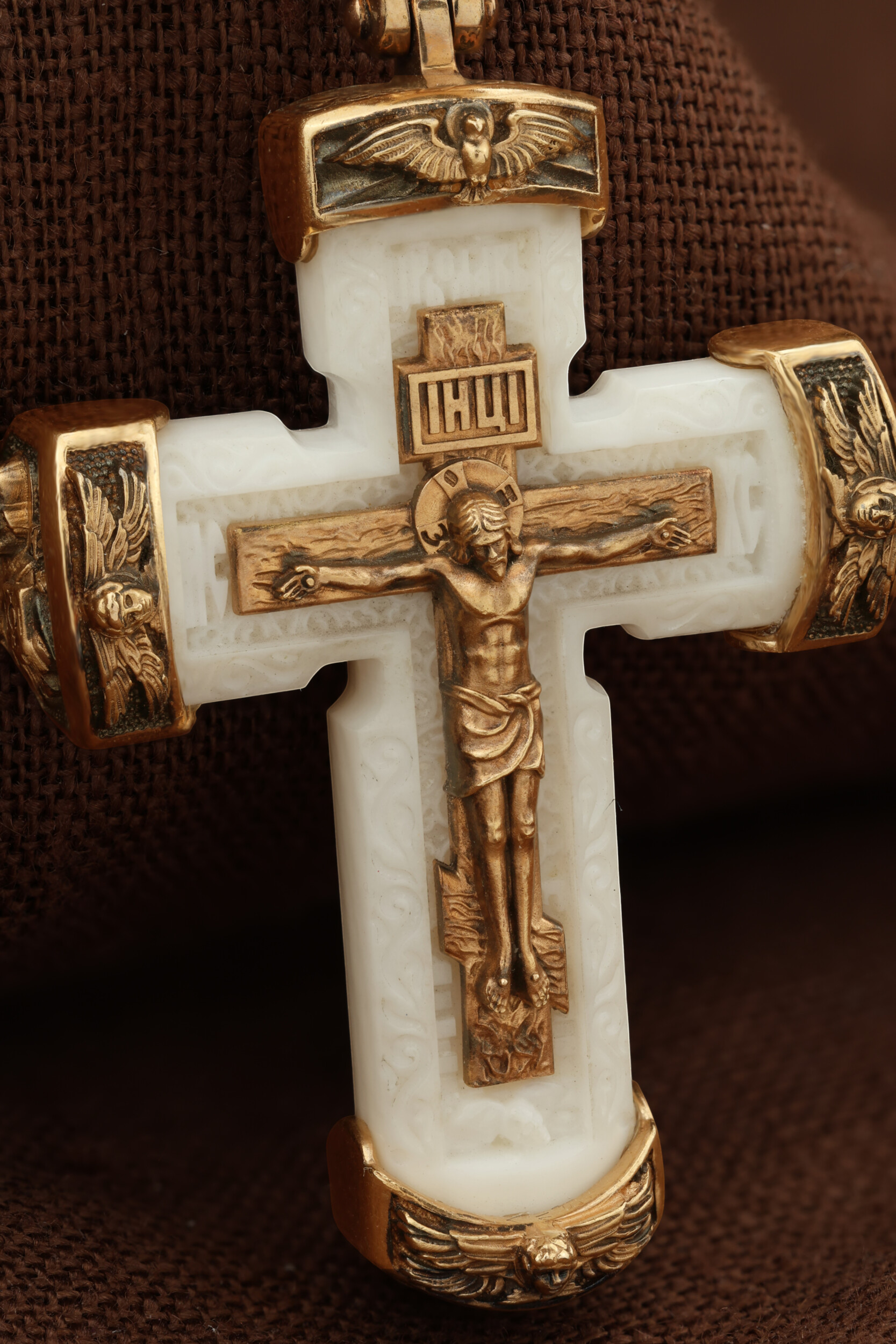 На лицевой стороне креста изображено Распятие, потому что это орудие казни Иисус Христос сделал орудием победы над грехом и смертью. Своими страданиями Он искупил грехи человечества, умерев и сошествовав во ад, победил сатану, освободил души праведников от вечной смерти и открыл им небесные врата рая. Жертва Христа сделала возможным спасение для каждого человека. На православном кресте Христос не умирает, а свободно простирает руки, ладони Иисуса открыты, будто он хочет обнять все человечество, даря им свою любовь и открывая путь к вечной жизни.